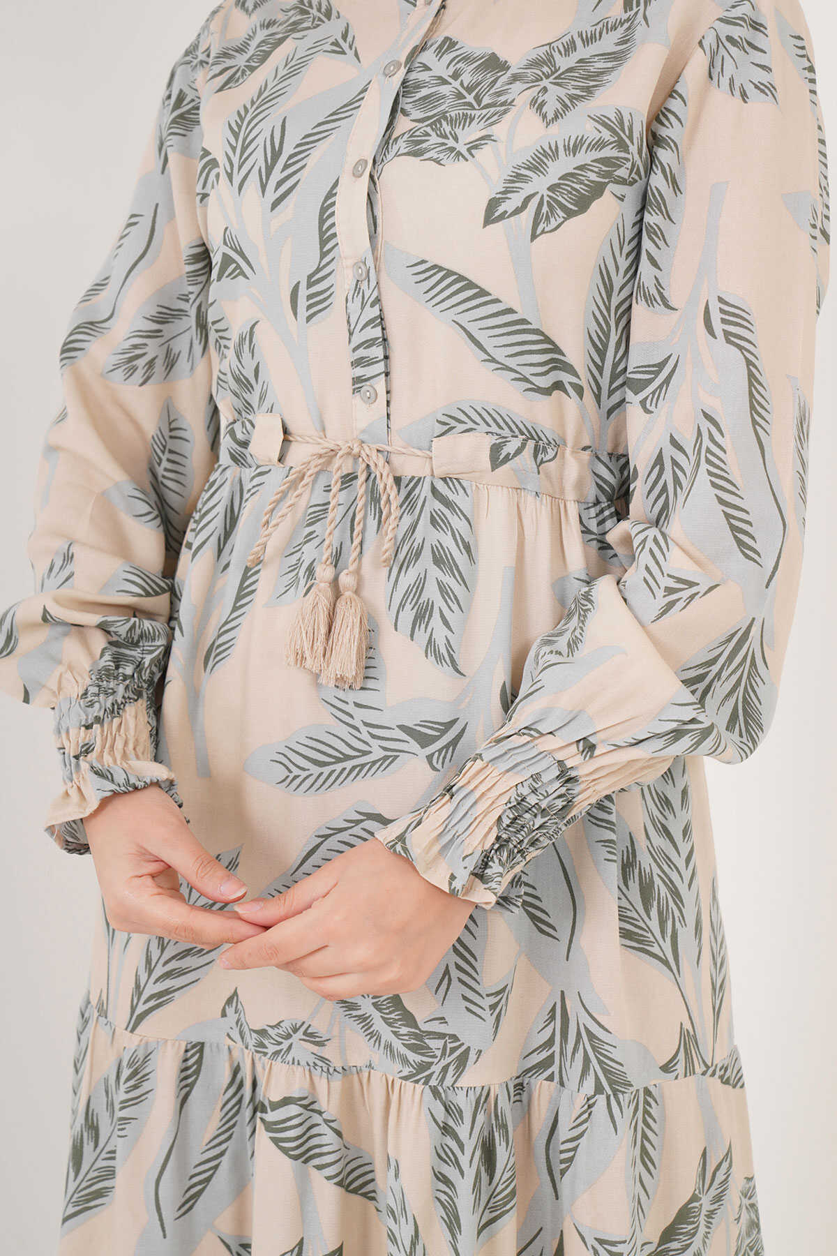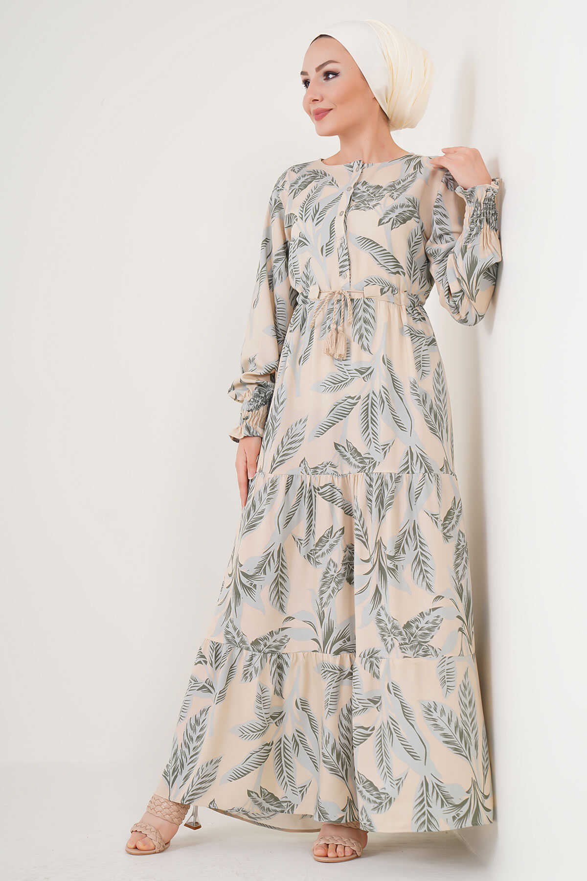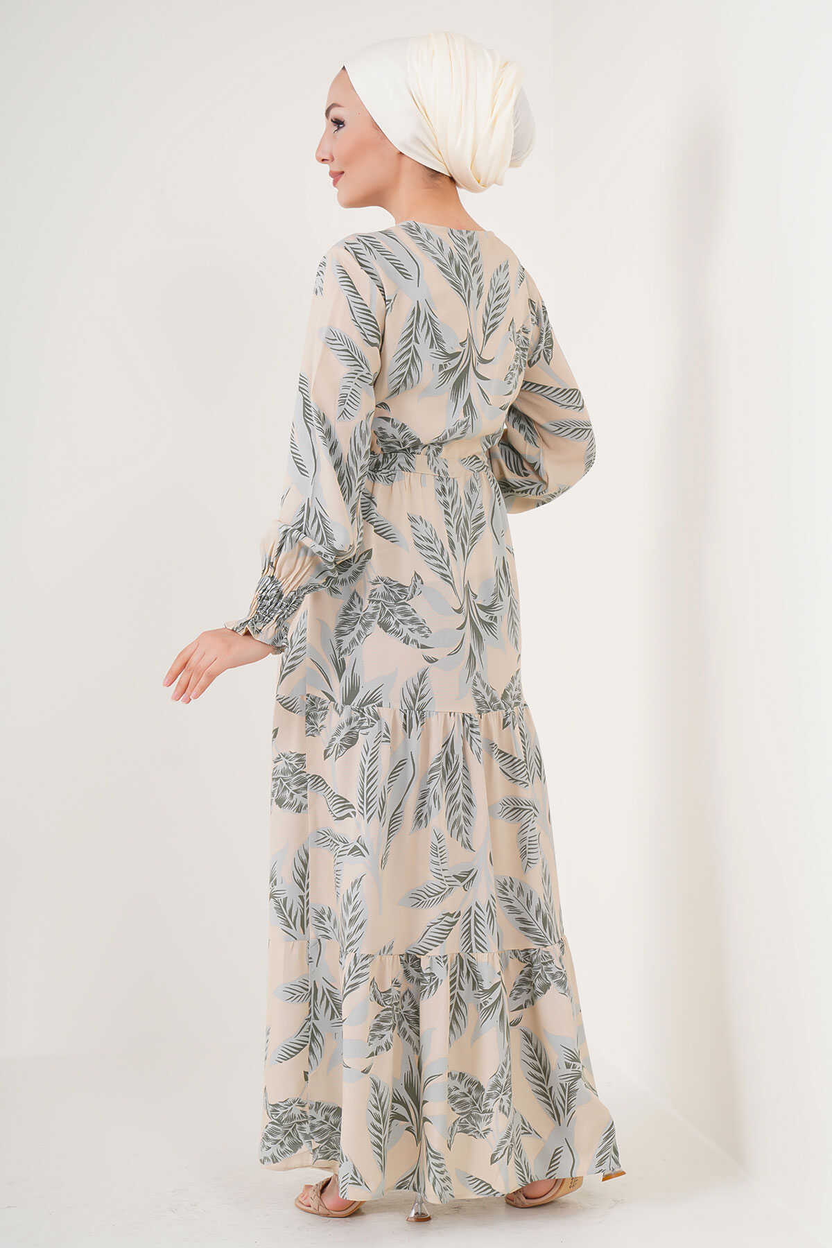 2145 Desenli Tesettür Elbise - Bej - Kombin