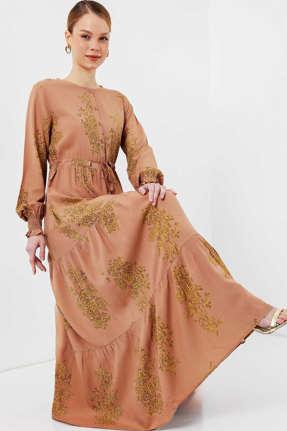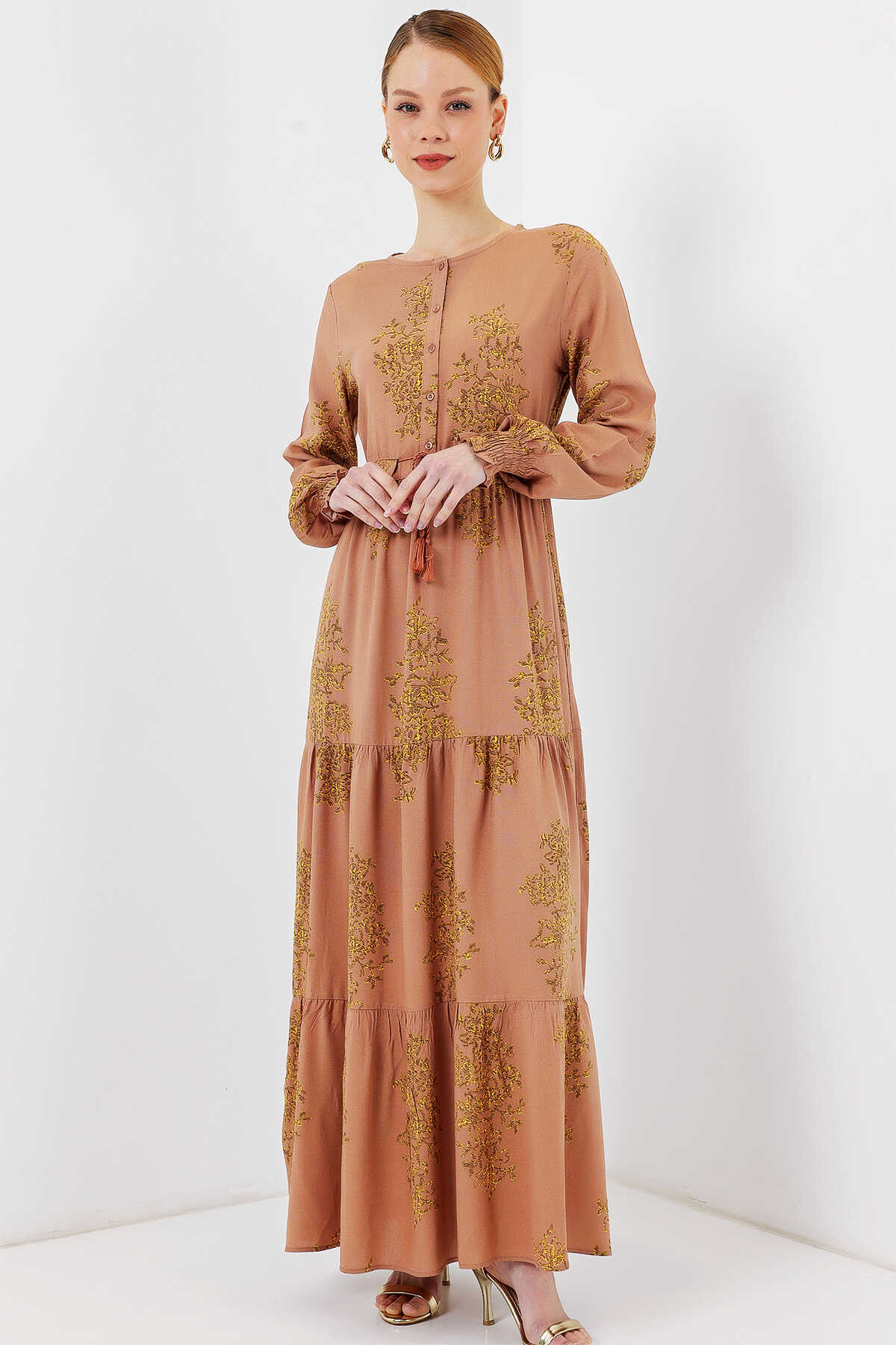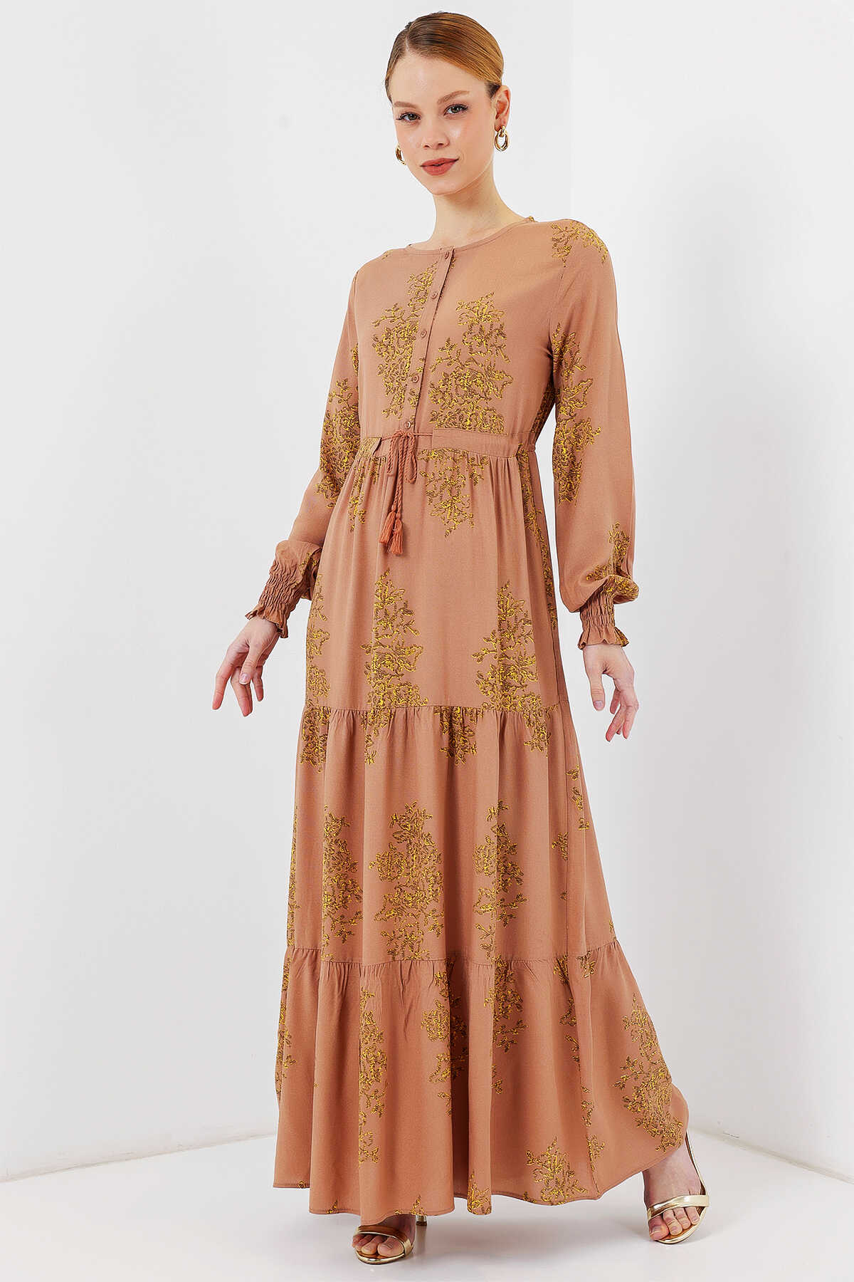 2145 Desenli Tesettür Elbise - Bisküvi - Kombin