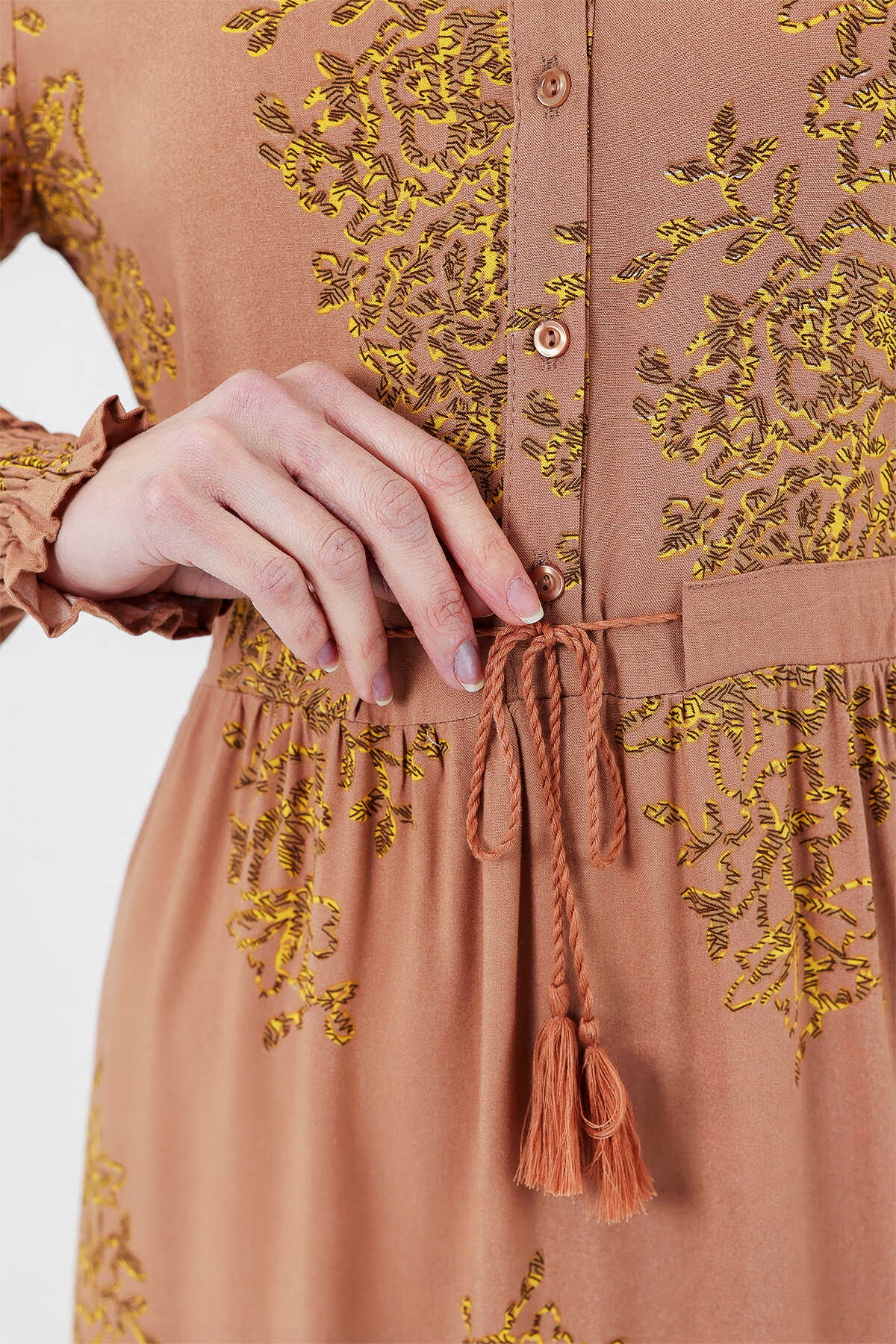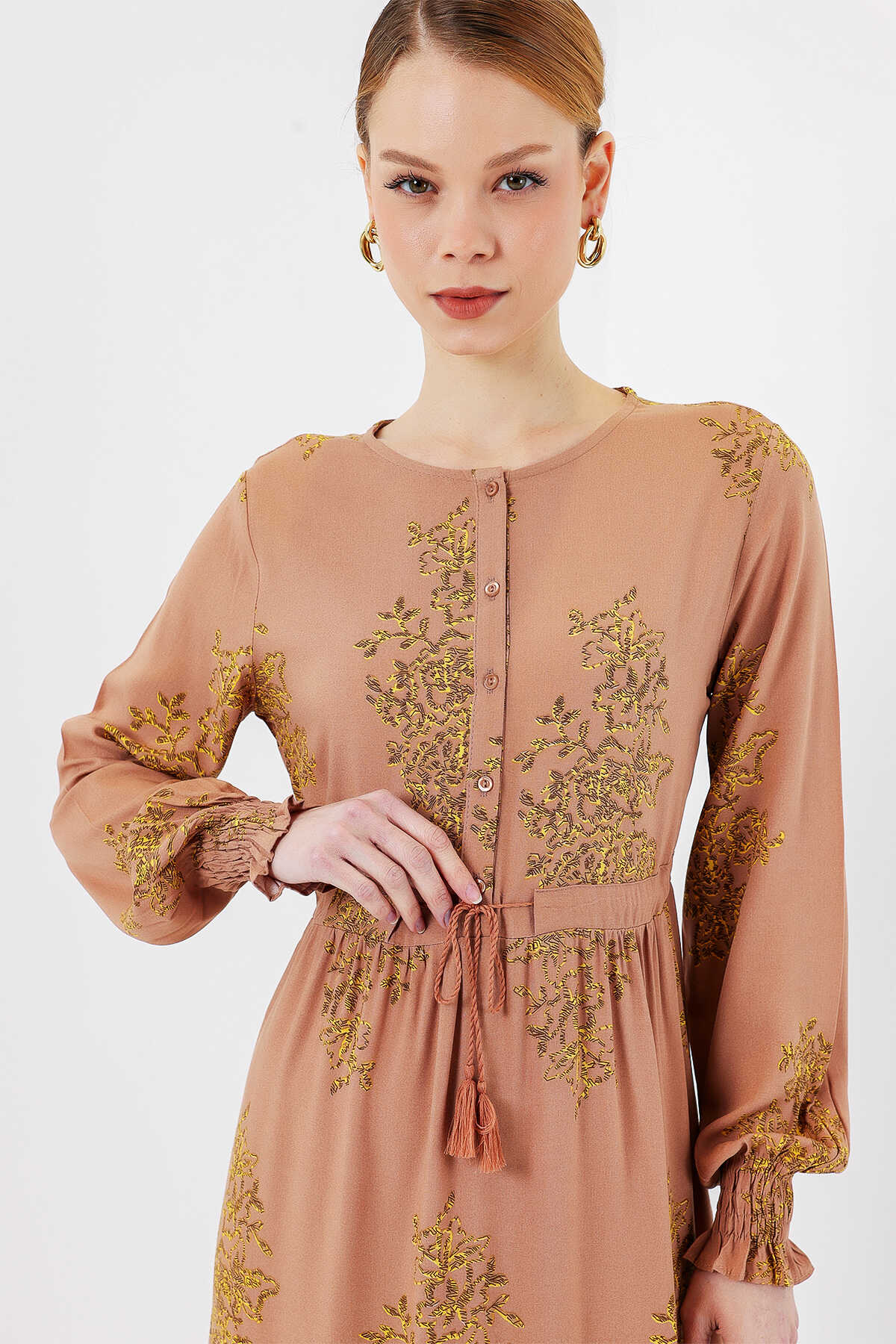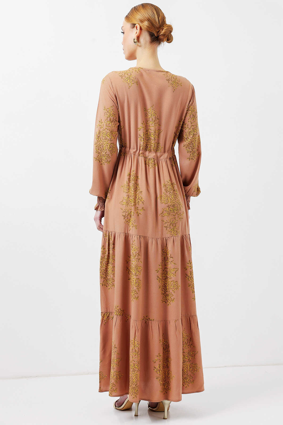 2145 Desenli Tesettür Elbise - Bisküvi - Kombin
