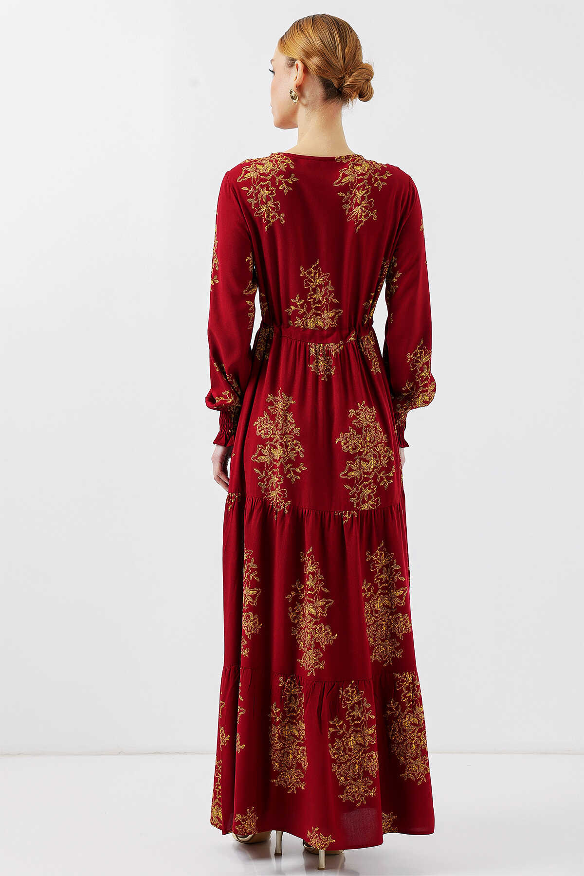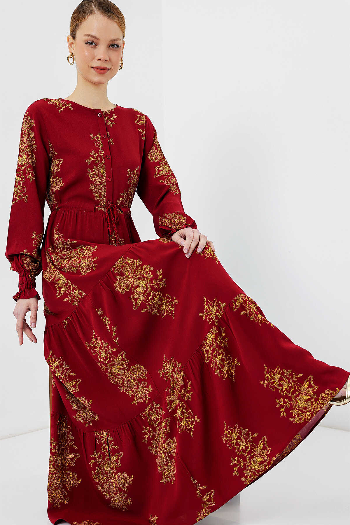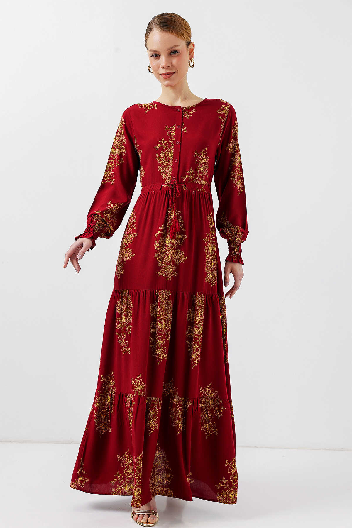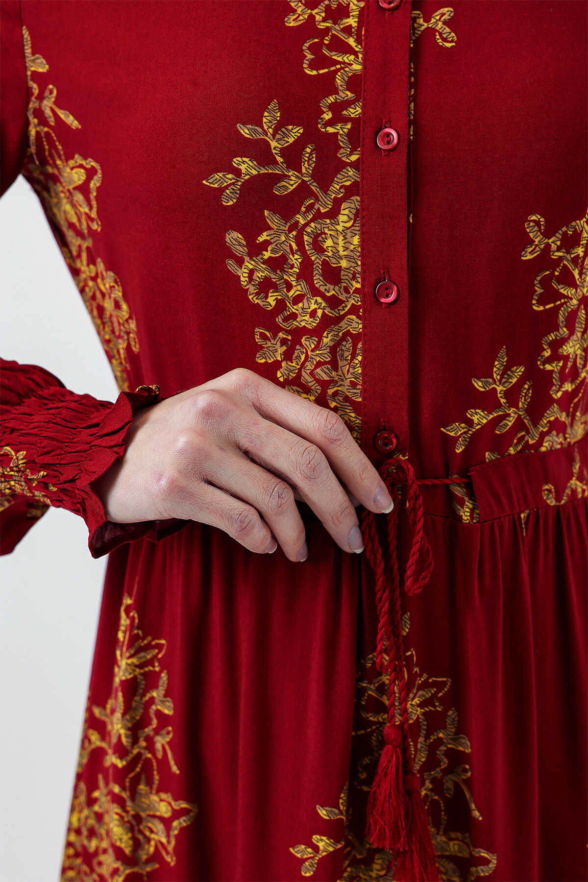 2145 Desenli Tesettür Elbise - B.Kırmızı - Kombin