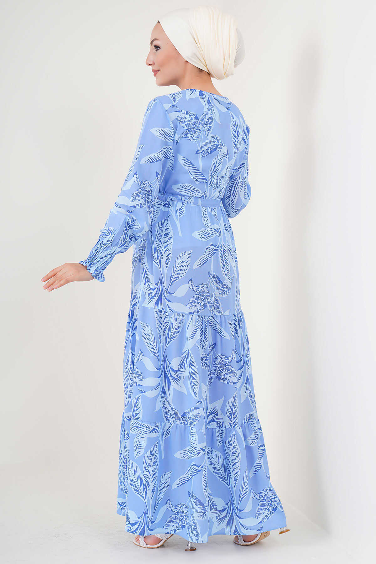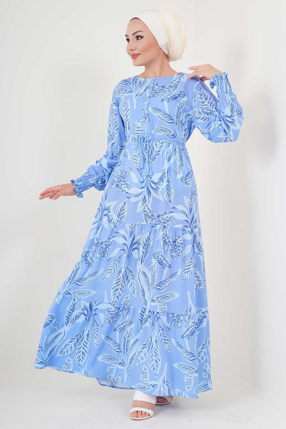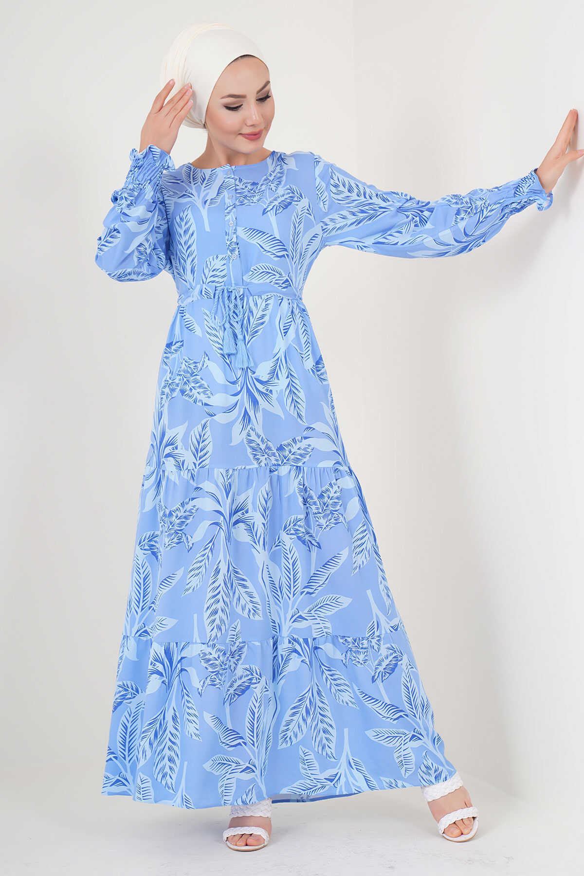 2145 Desenli Tesettür Elbise - Mavi - Kombin