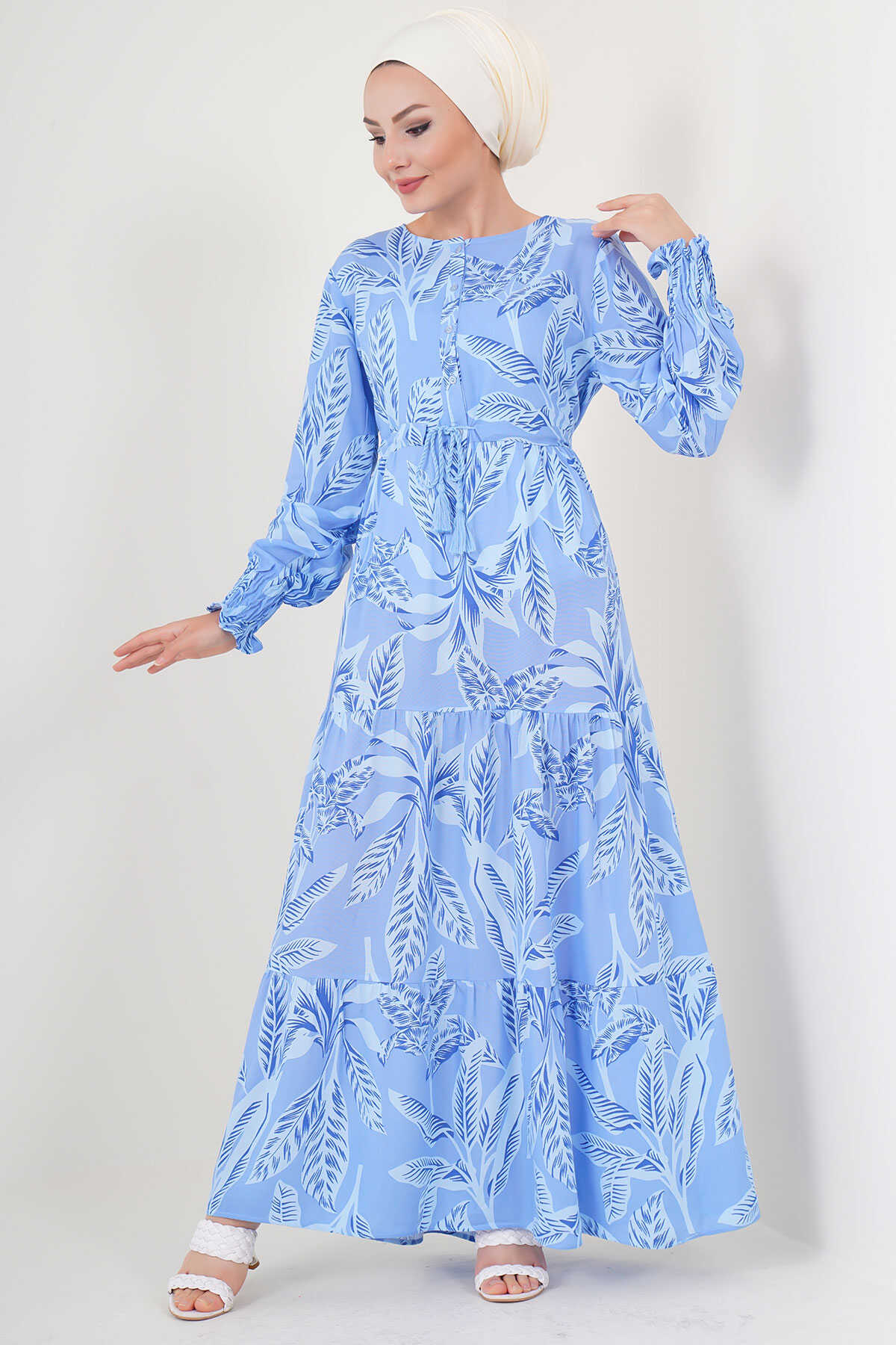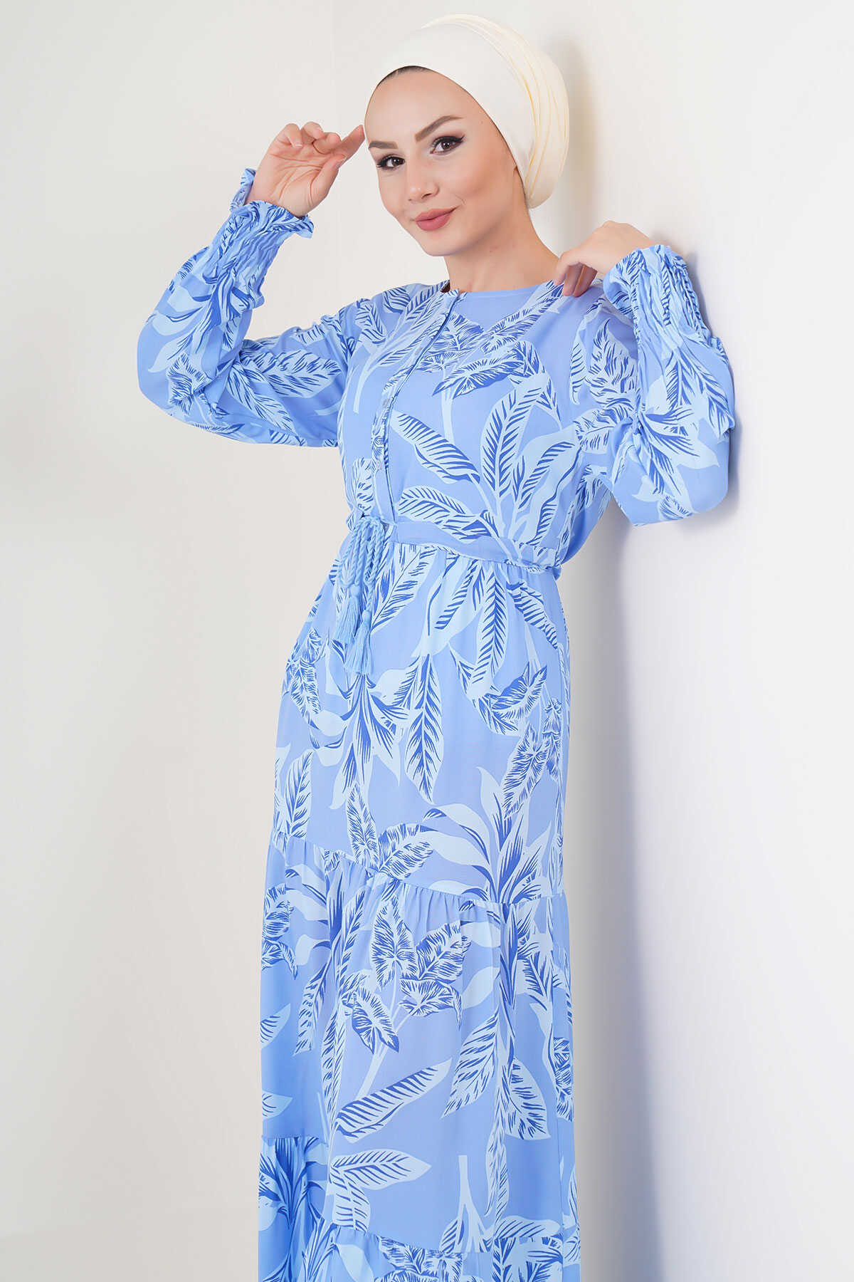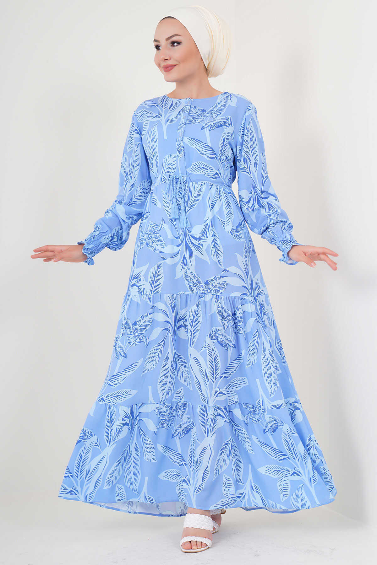 2145 Desenli Tesettür Elbise - Mavi - Kombin