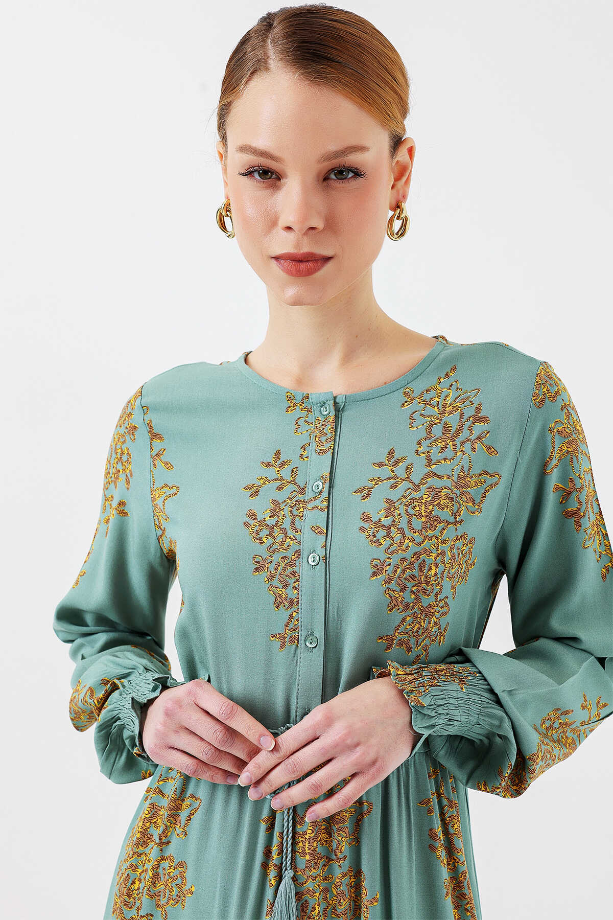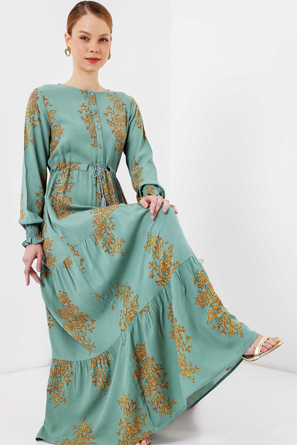 2145 Desenli Tesettür Elbise - Mint