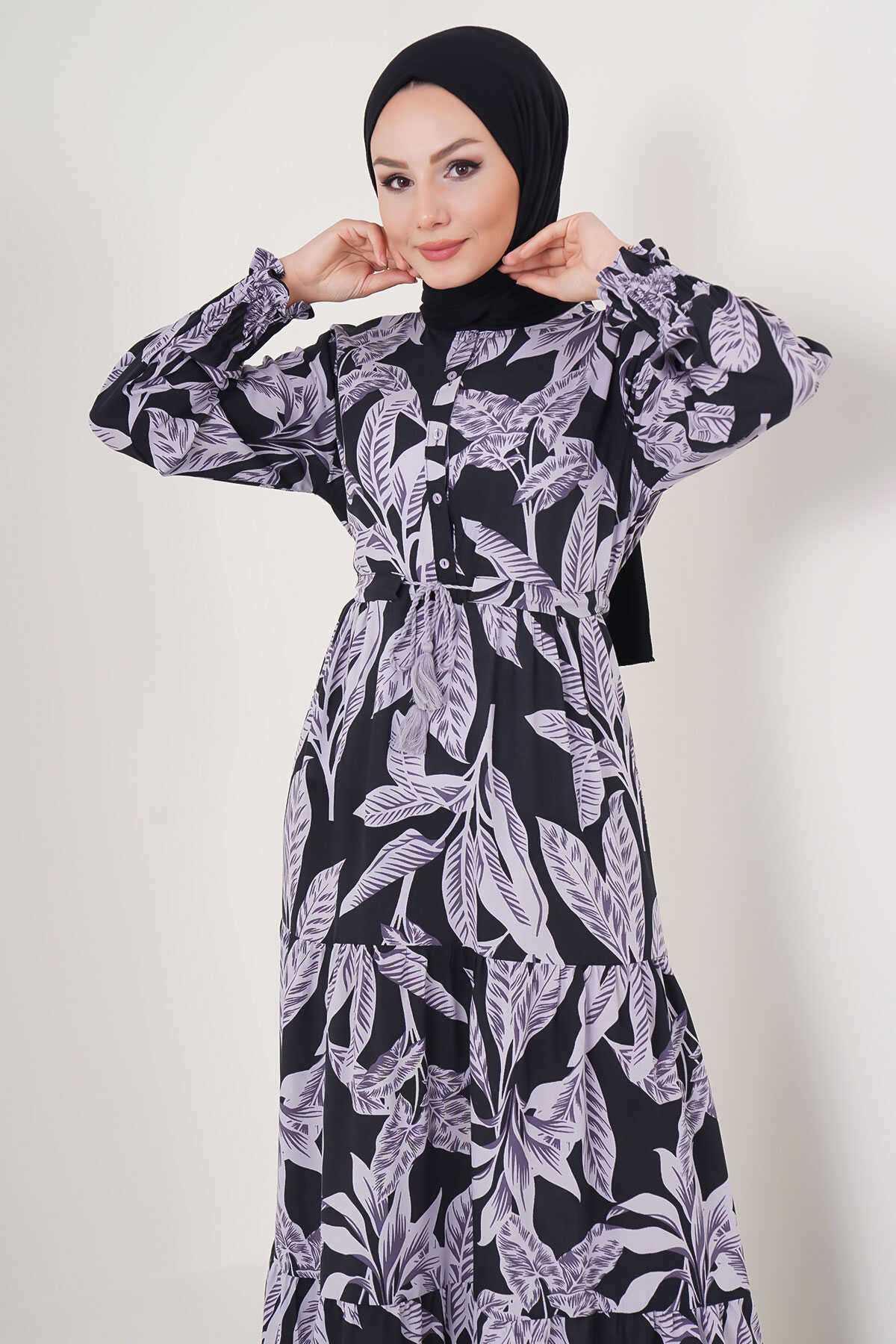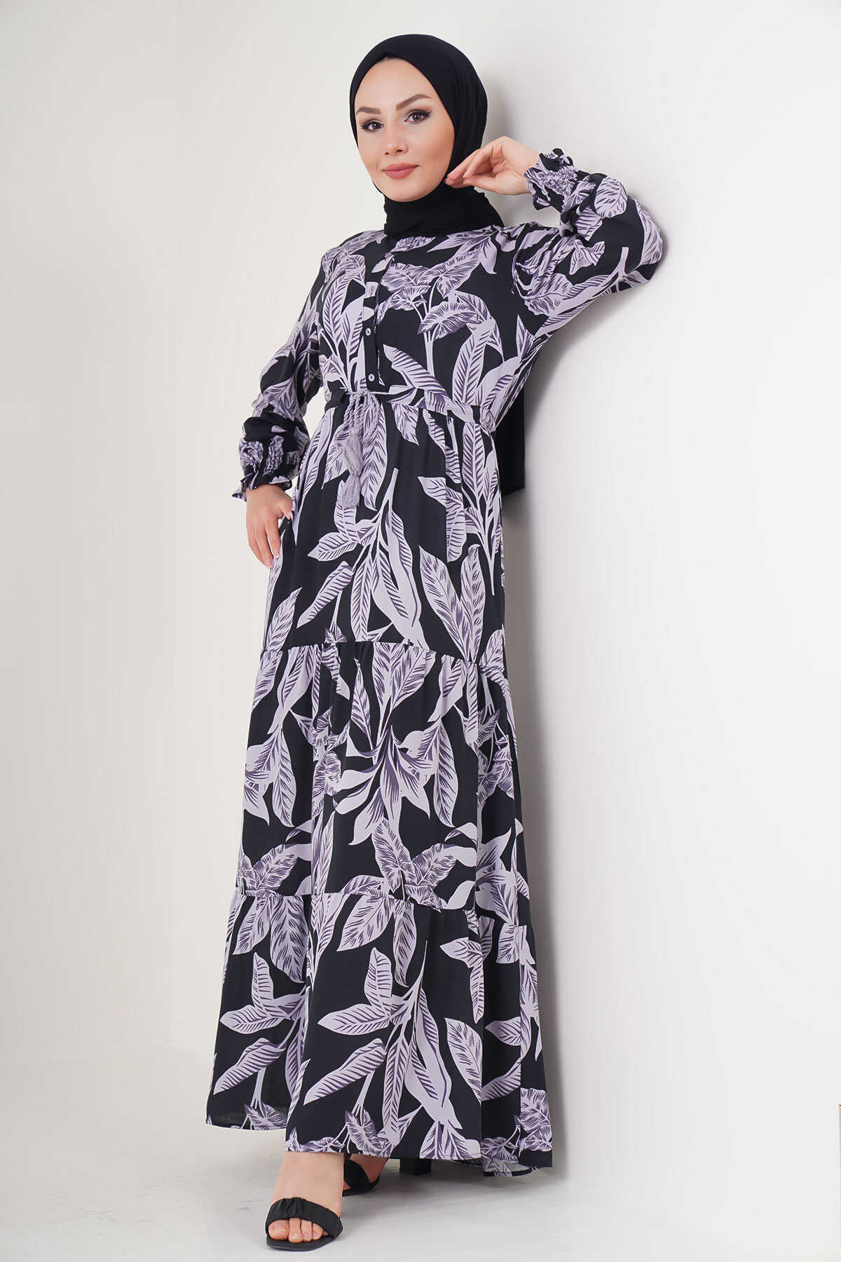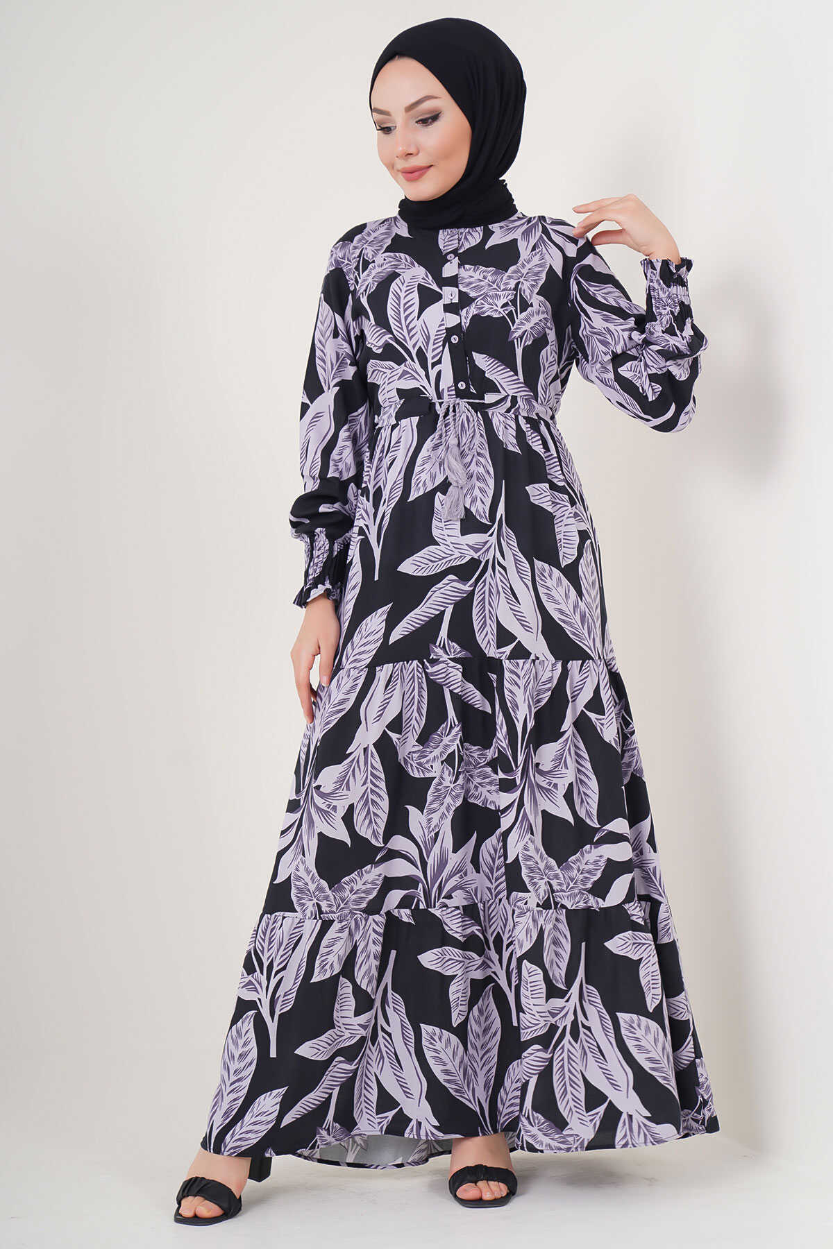 2145 Desenli Tesettür Elbise - D. Siyah