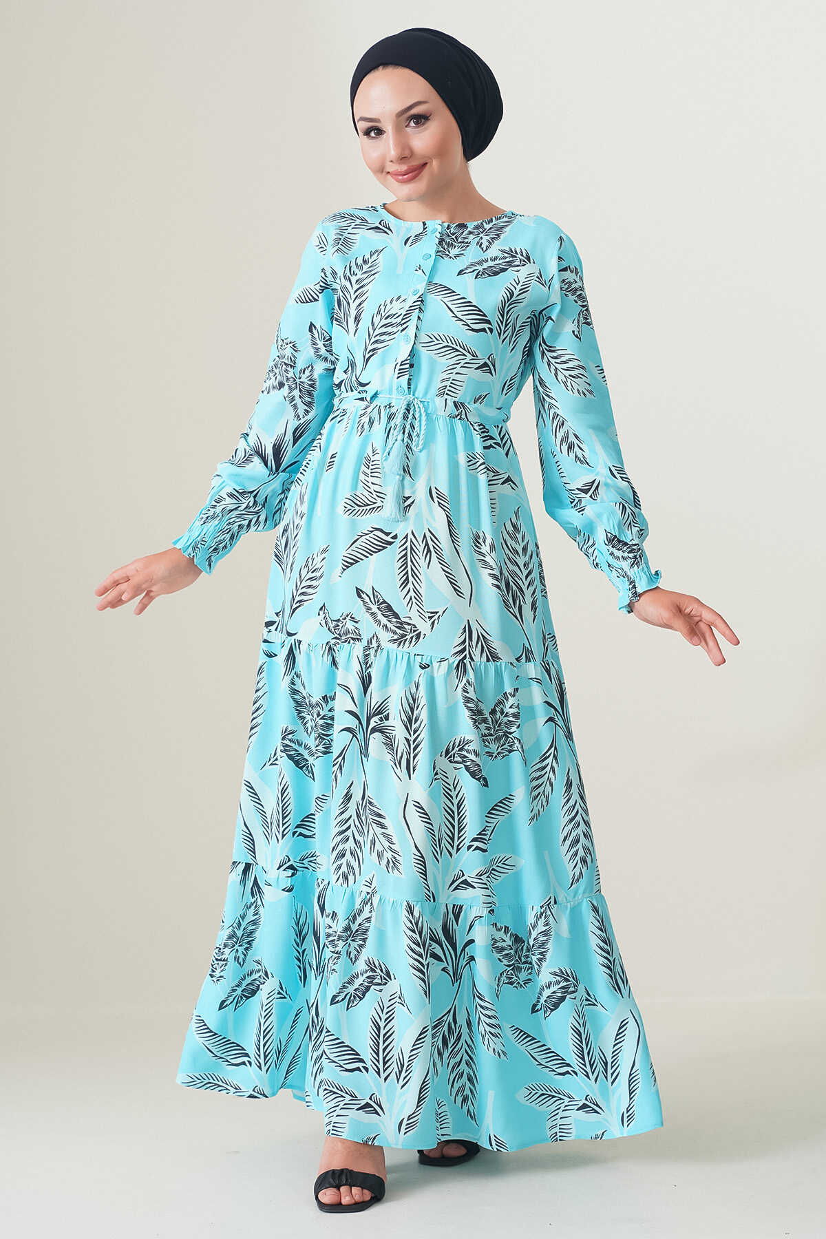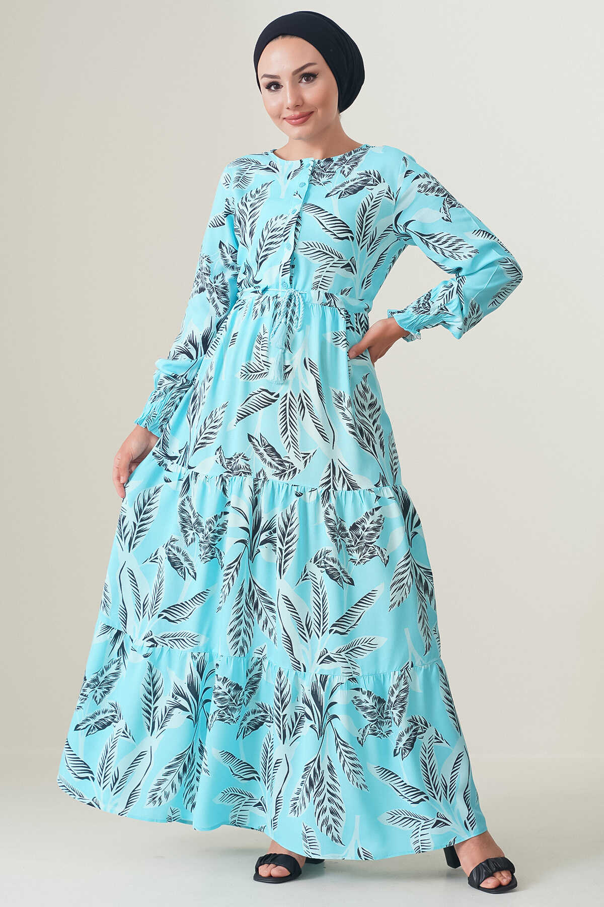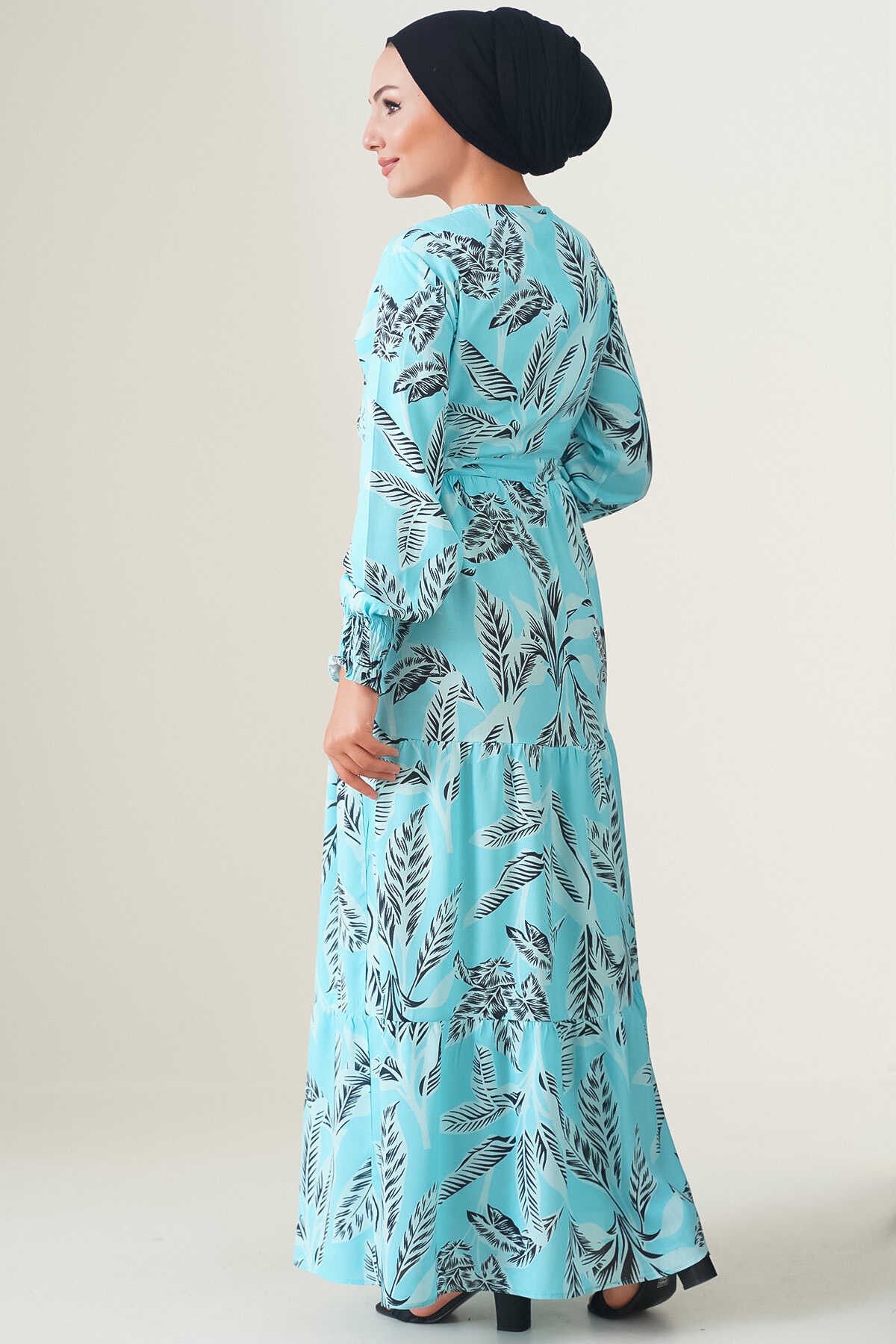 2145 Desenli Tesettür Elbise - Turkuaz