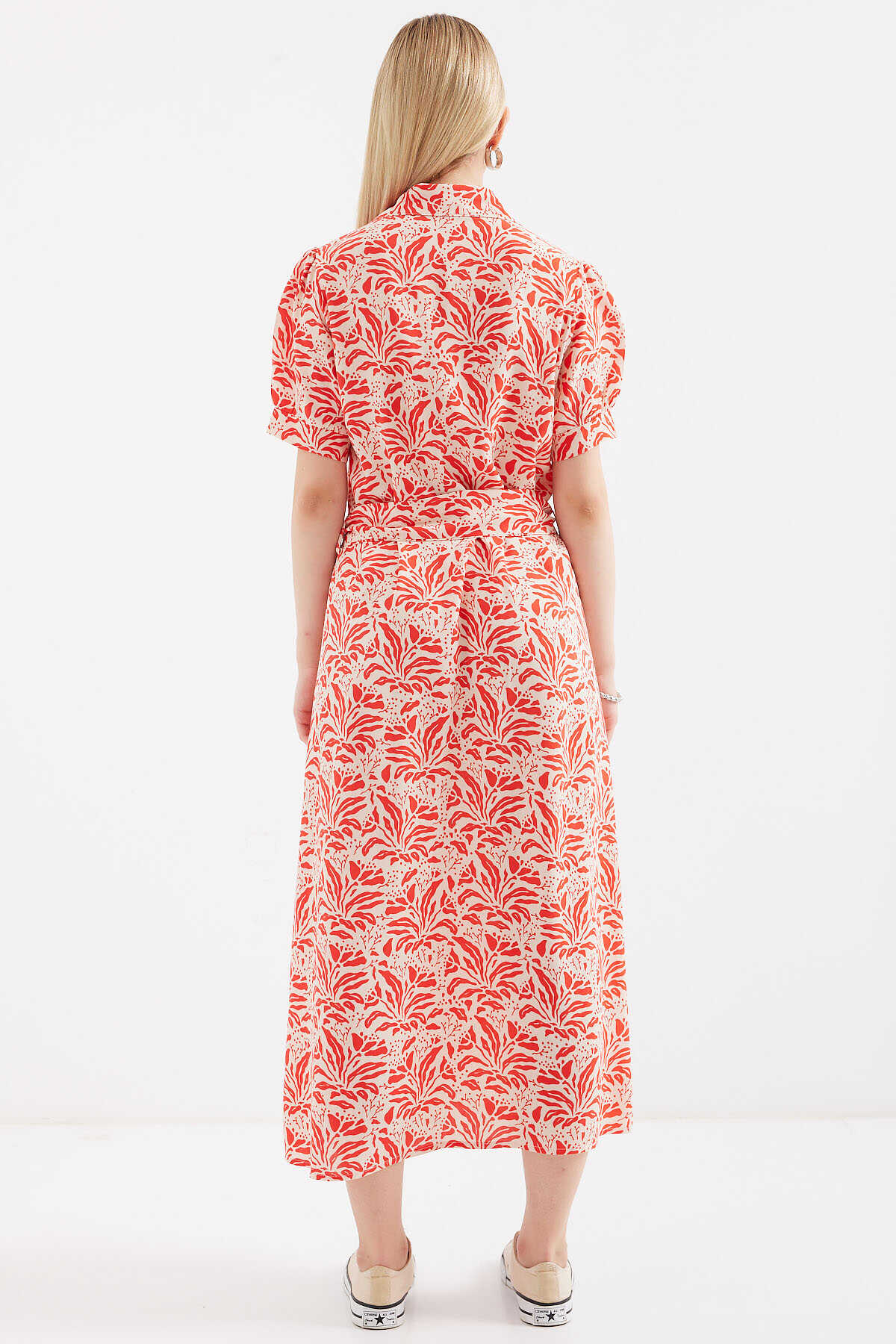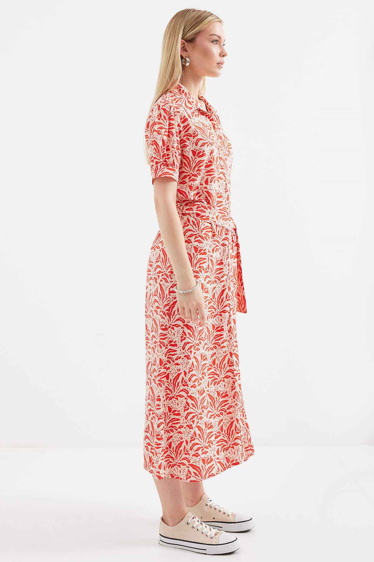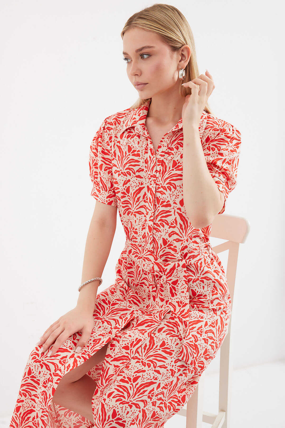 2213 Kısa Kol Viskon Elbise - Kırmızı - Kombin