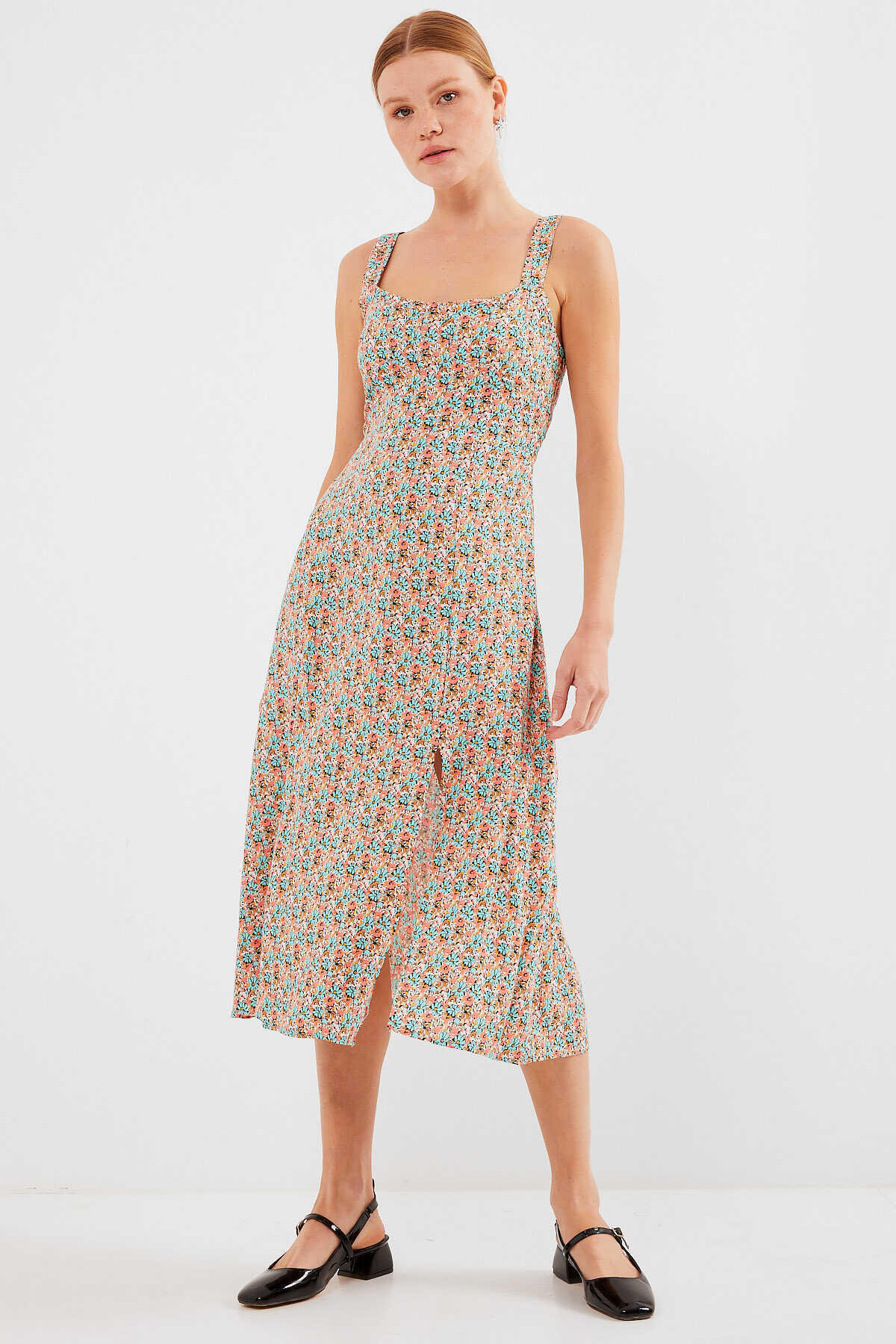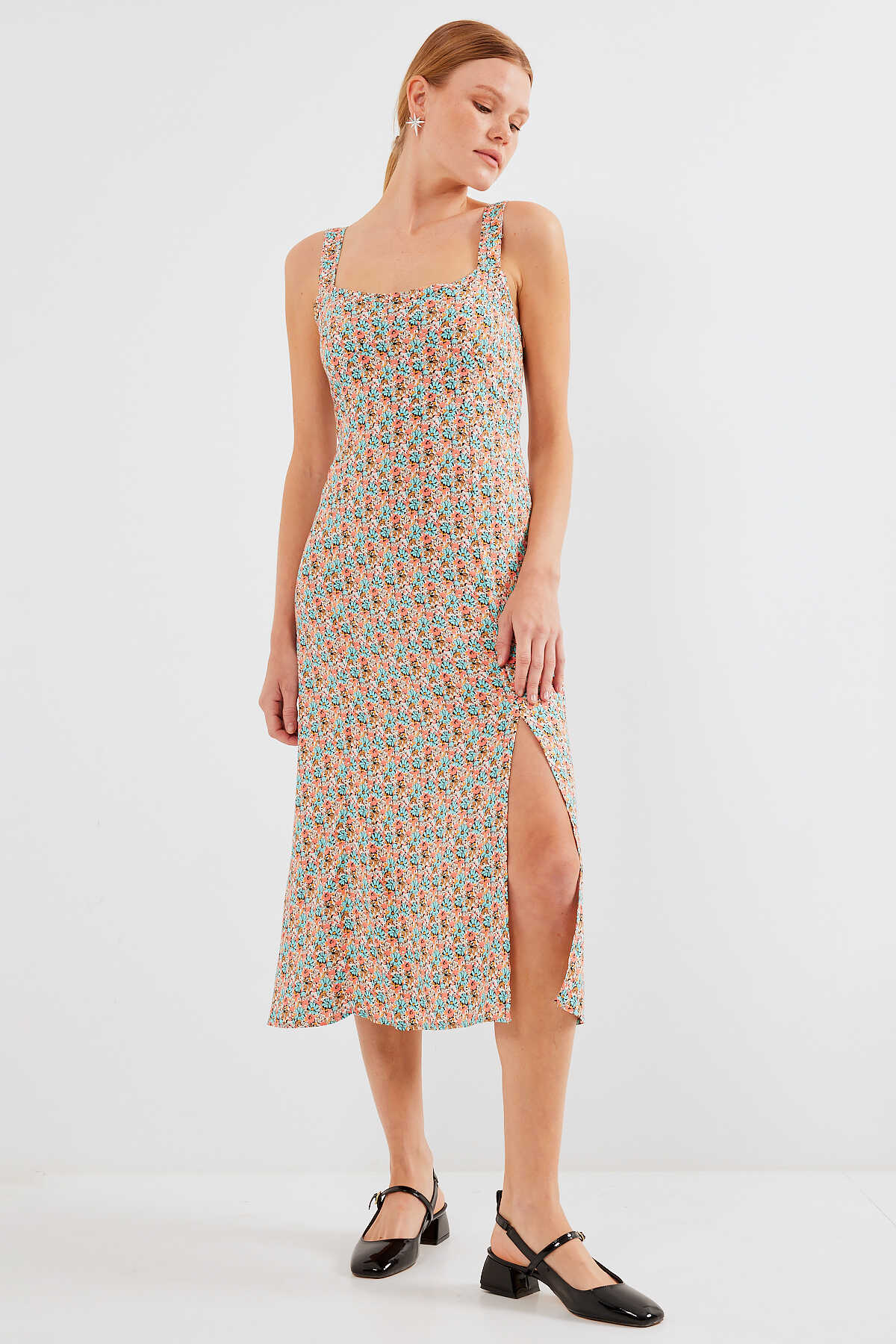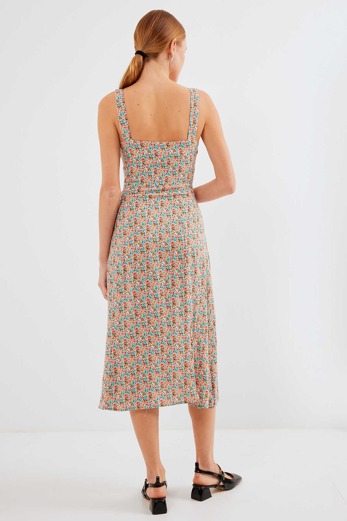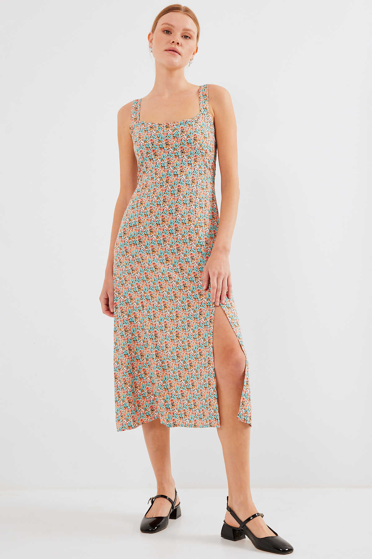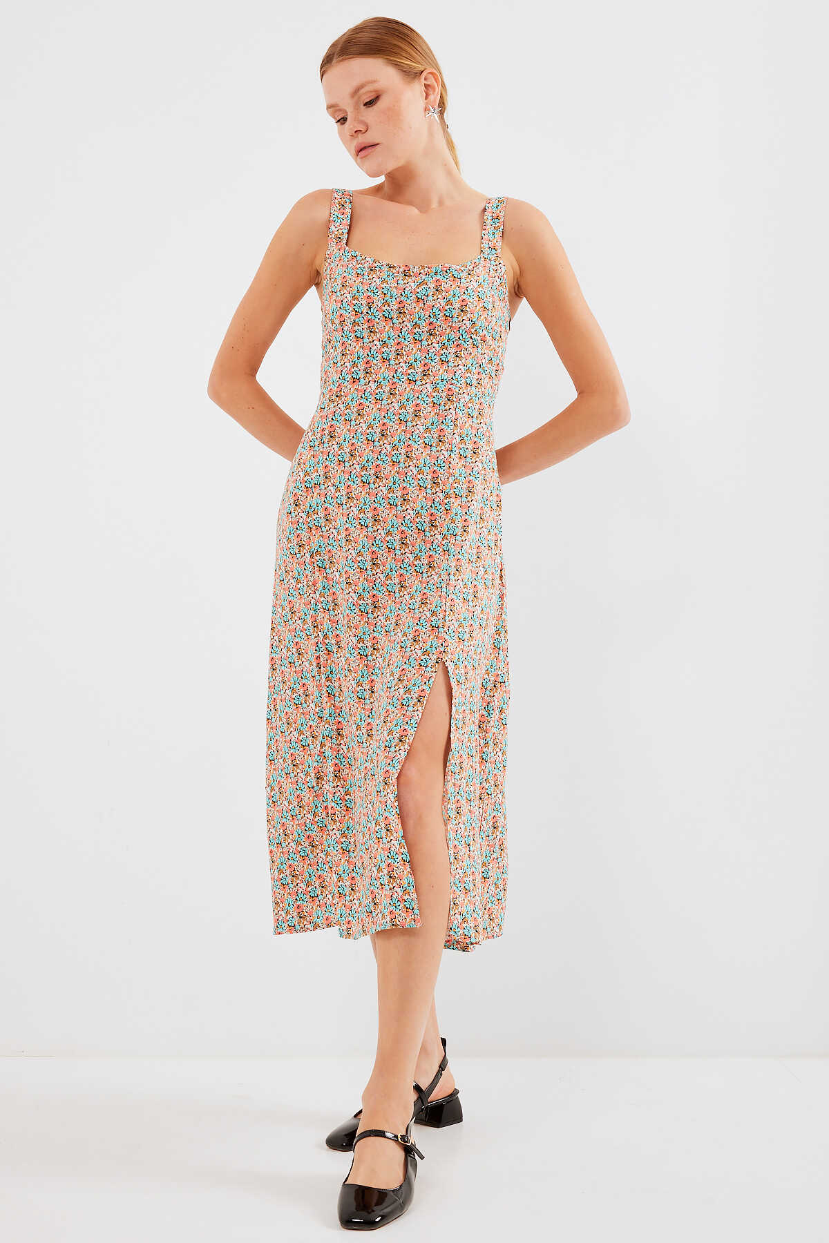 2282 Yırtmaçlı Askılı Viskon Elbise - Çok Renkli