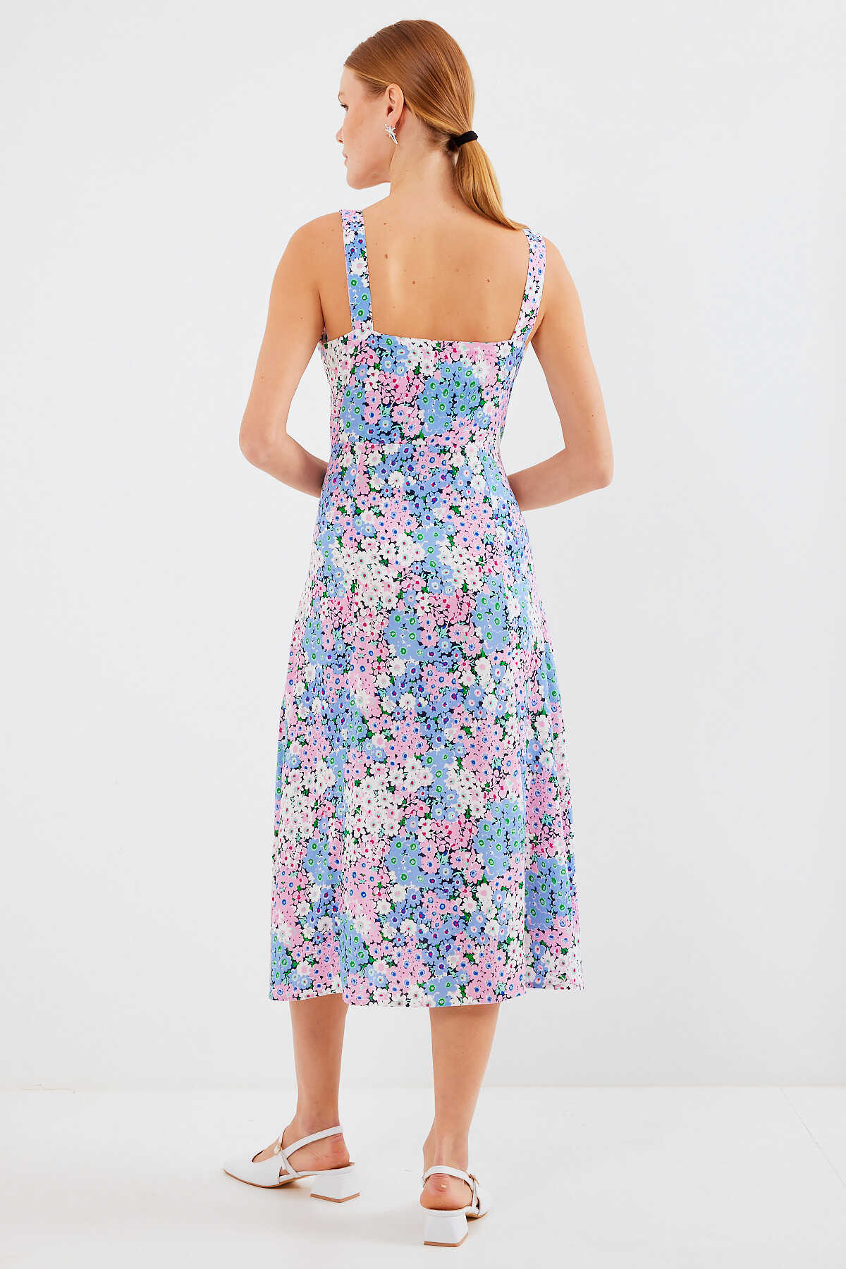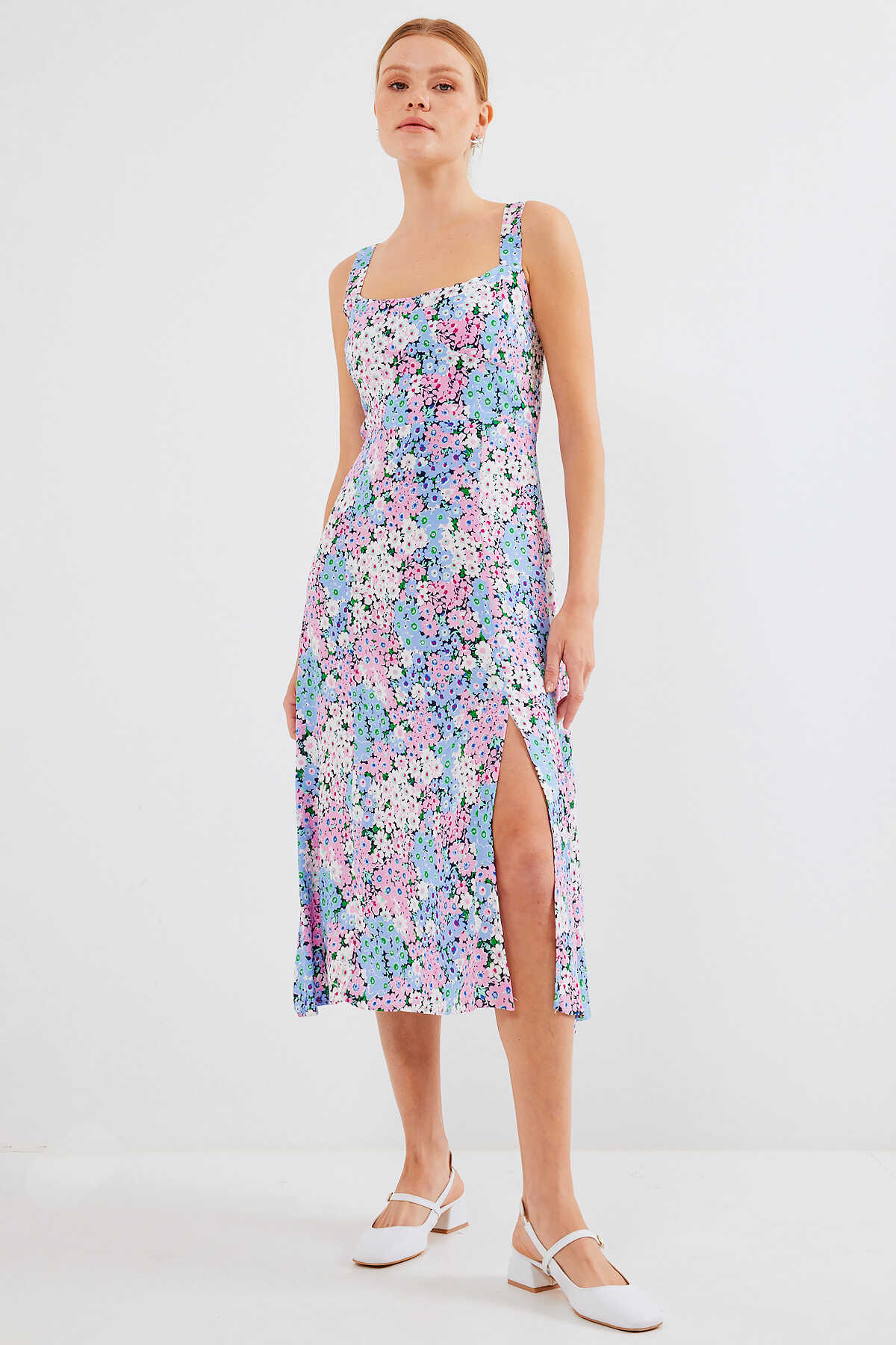 Desenli Yirtmaçli Askili Viskon Elbise