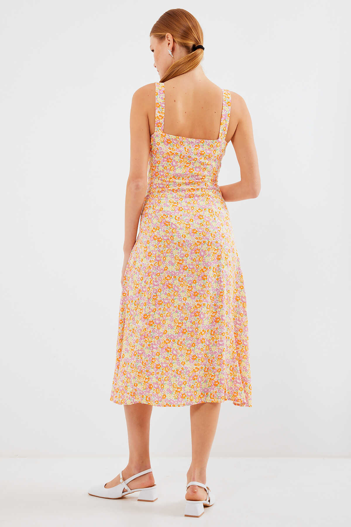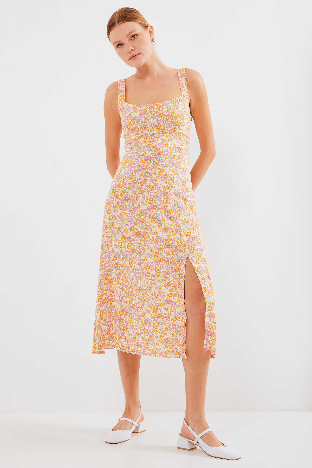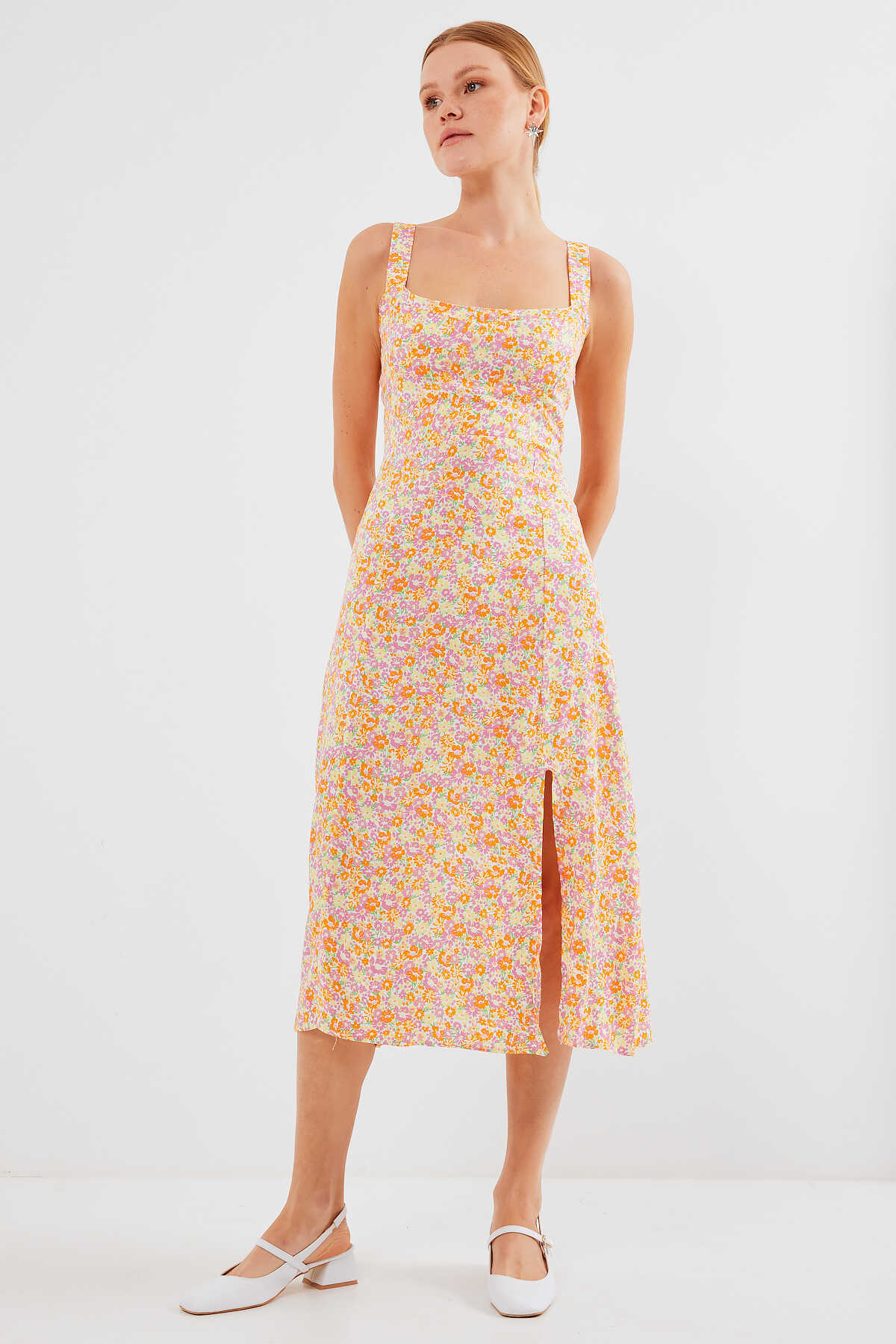 Desenli Yirtmaçli Askili Viskon Elbise