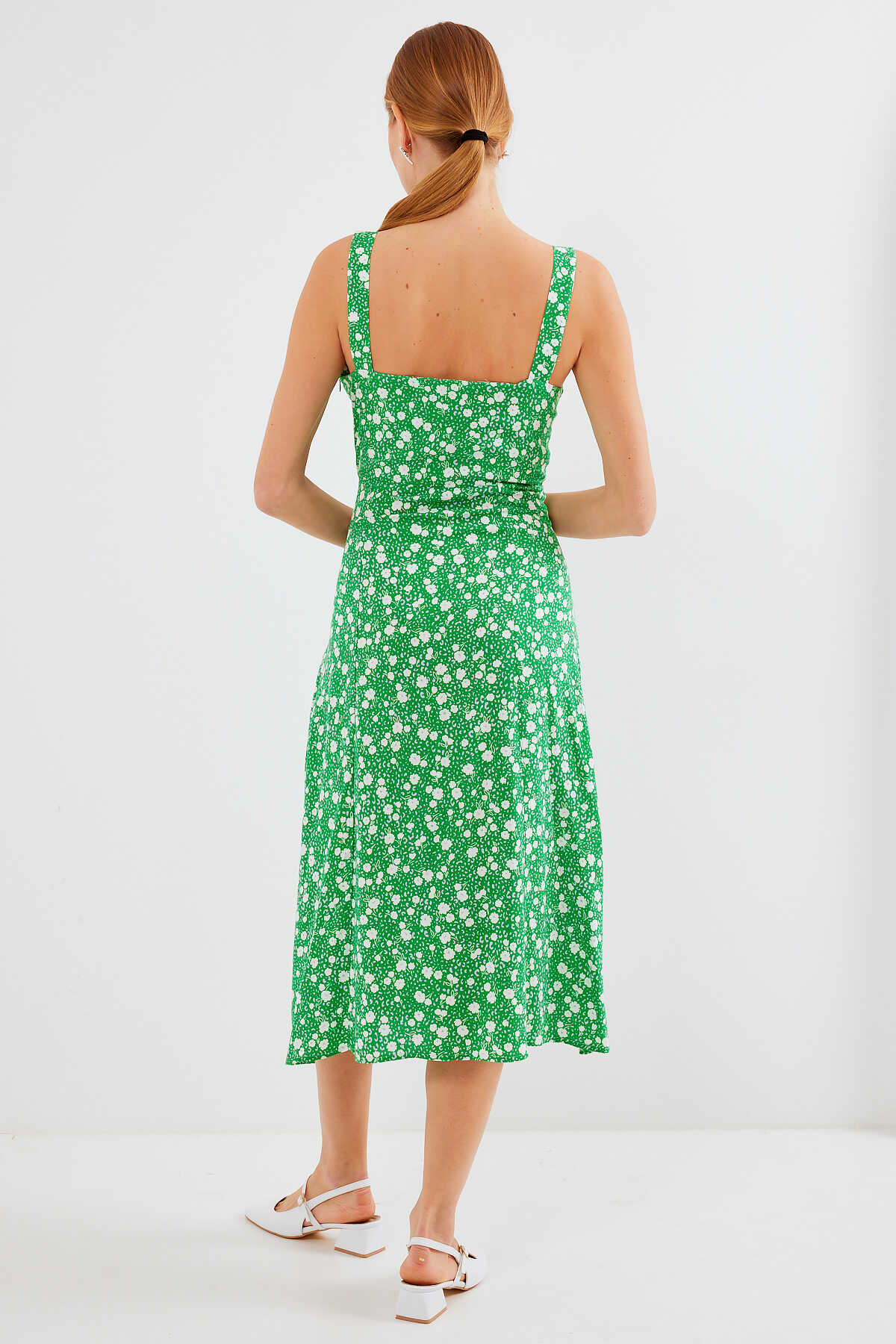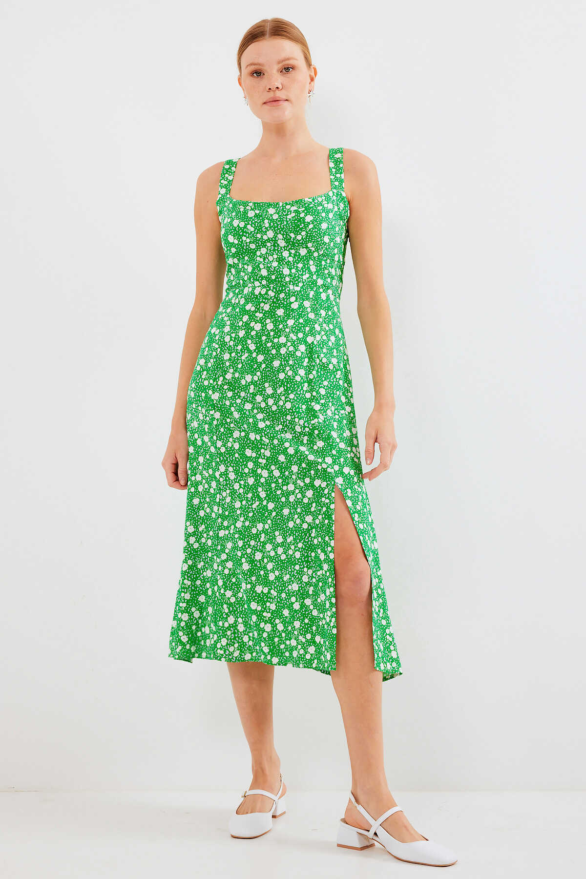 Desenli Yirtmaçli Askili Viskon Elbise