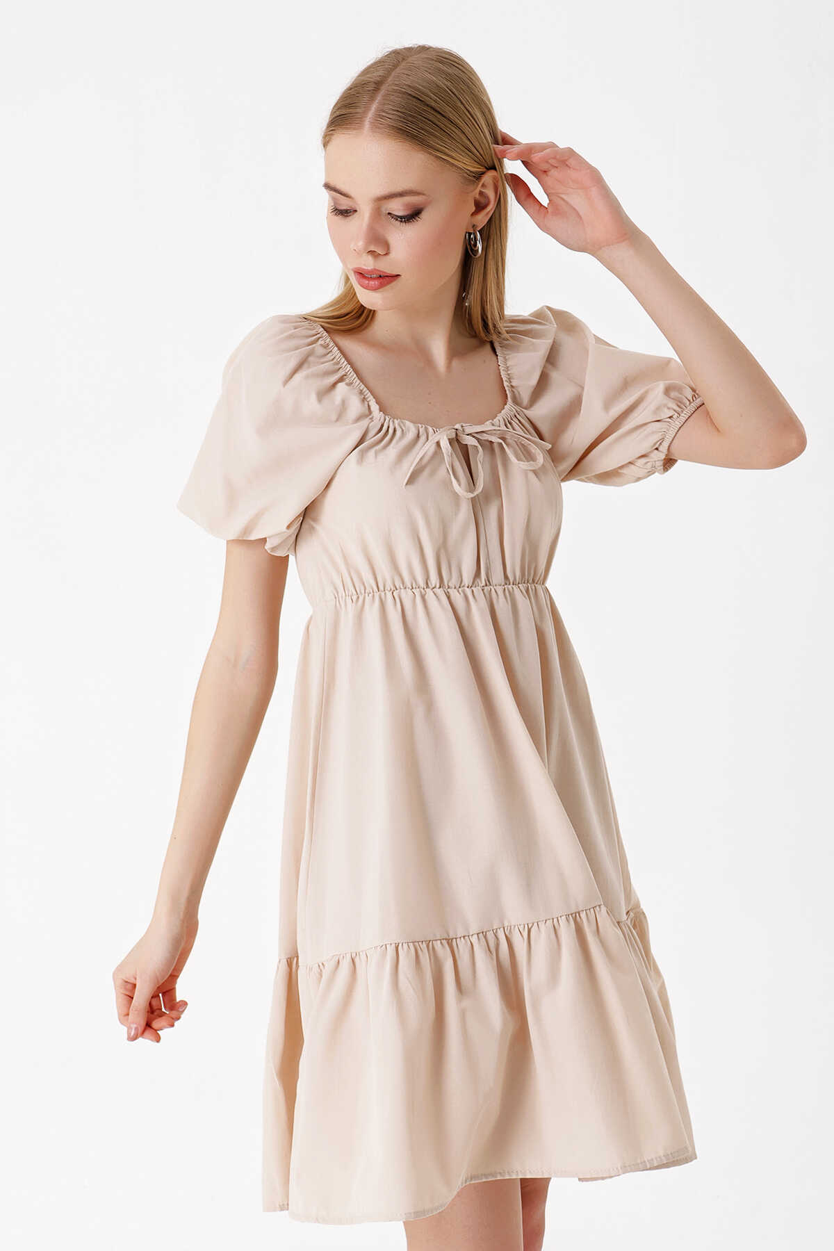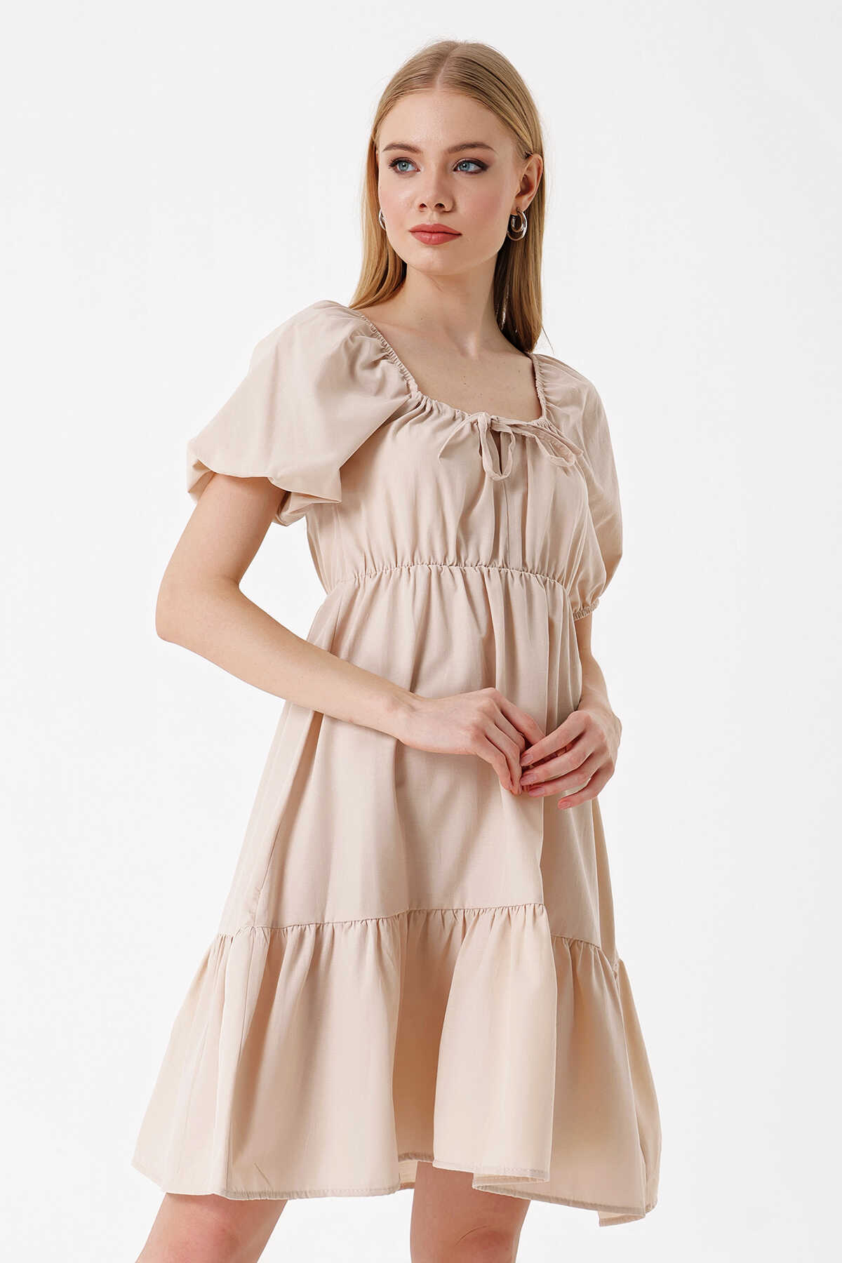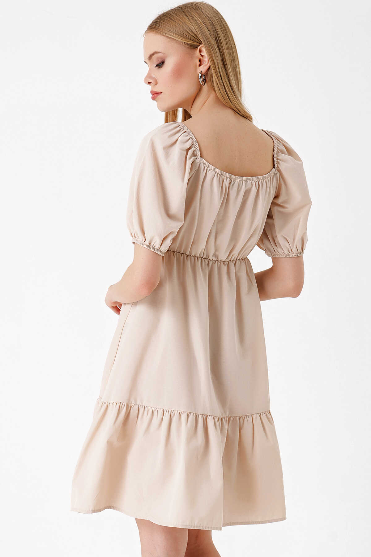 2351 Kloş Poplin Elbise - Bej - Kombin