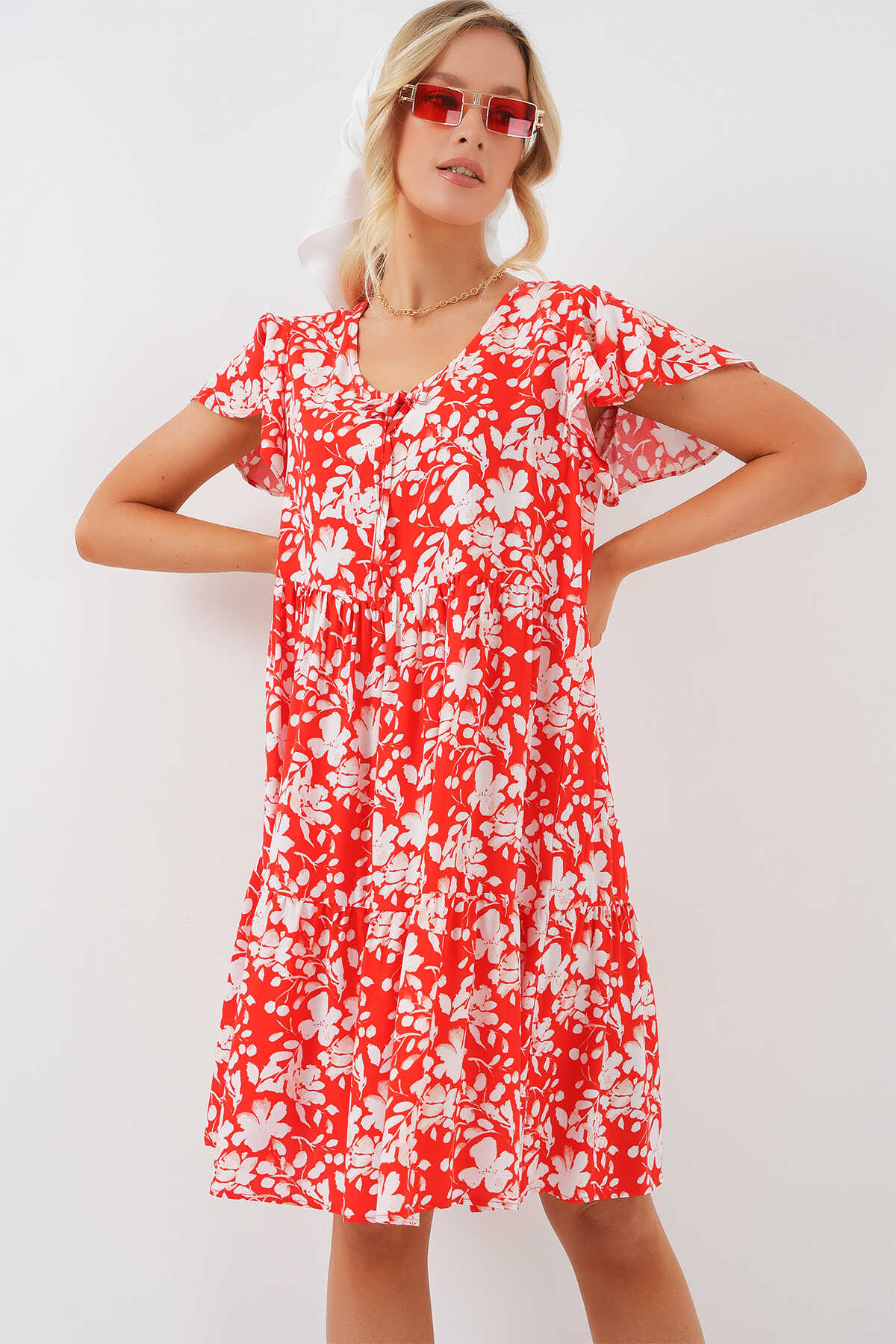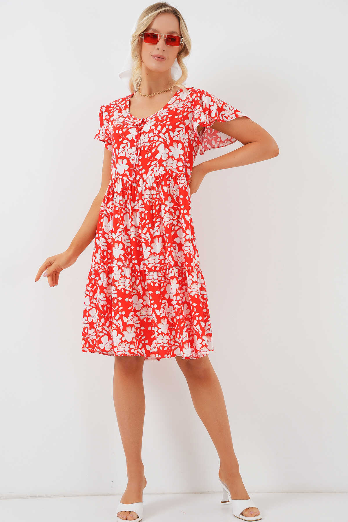 2352 V Yaka Kısa Elbise - Kırmızı - Kombin