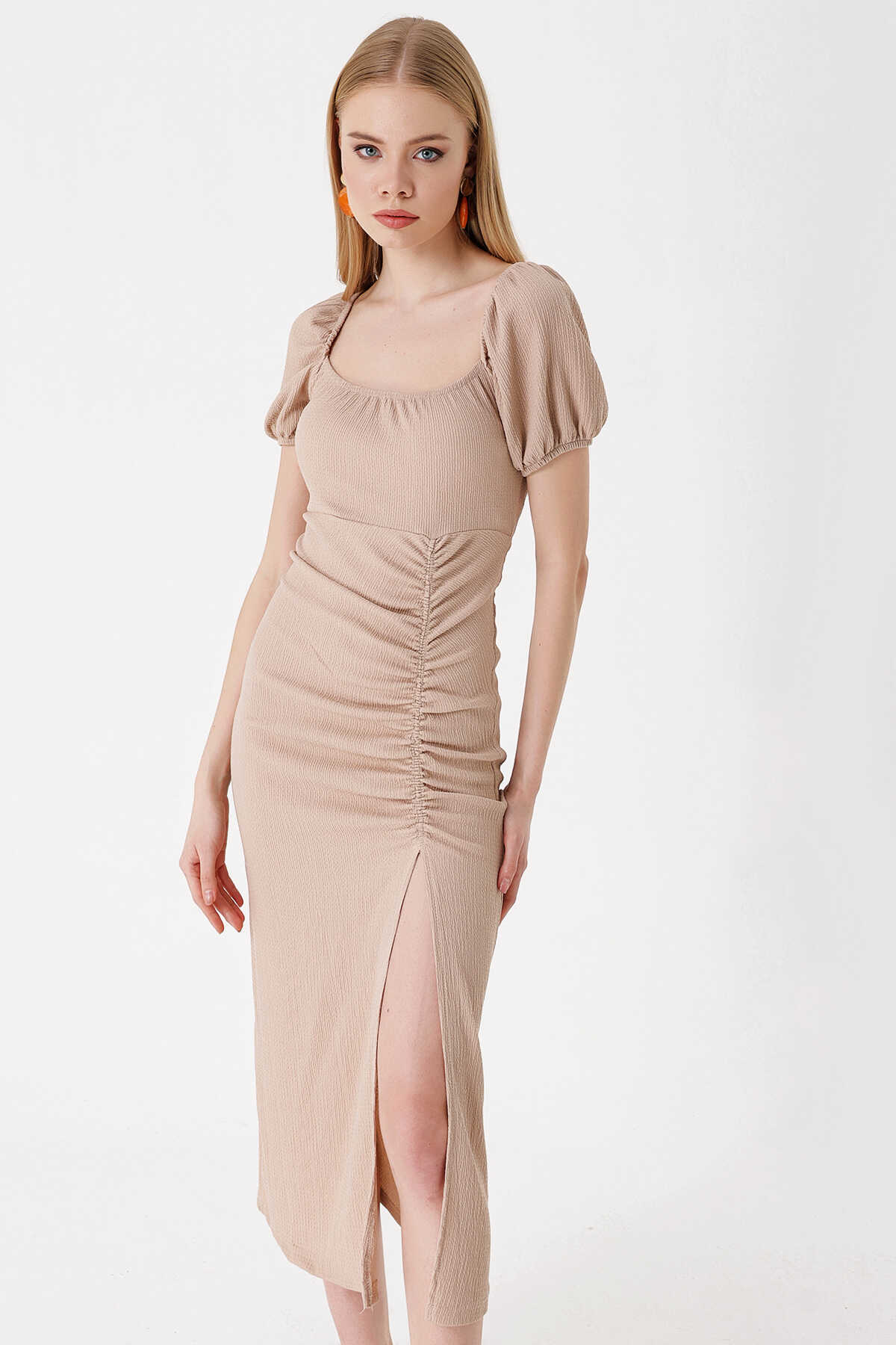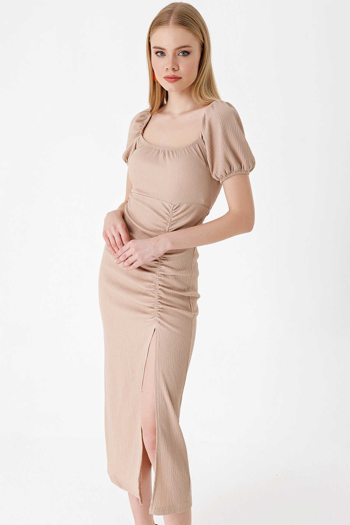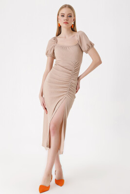 2396 Yırtmaçlı Yazlık Örme Elbise - Bisküvi