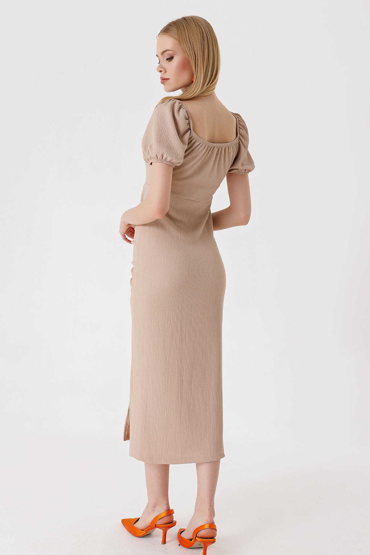 2396 Yırtmaçlı Yazlık Örme Elbise - Bisküvi - Kombin