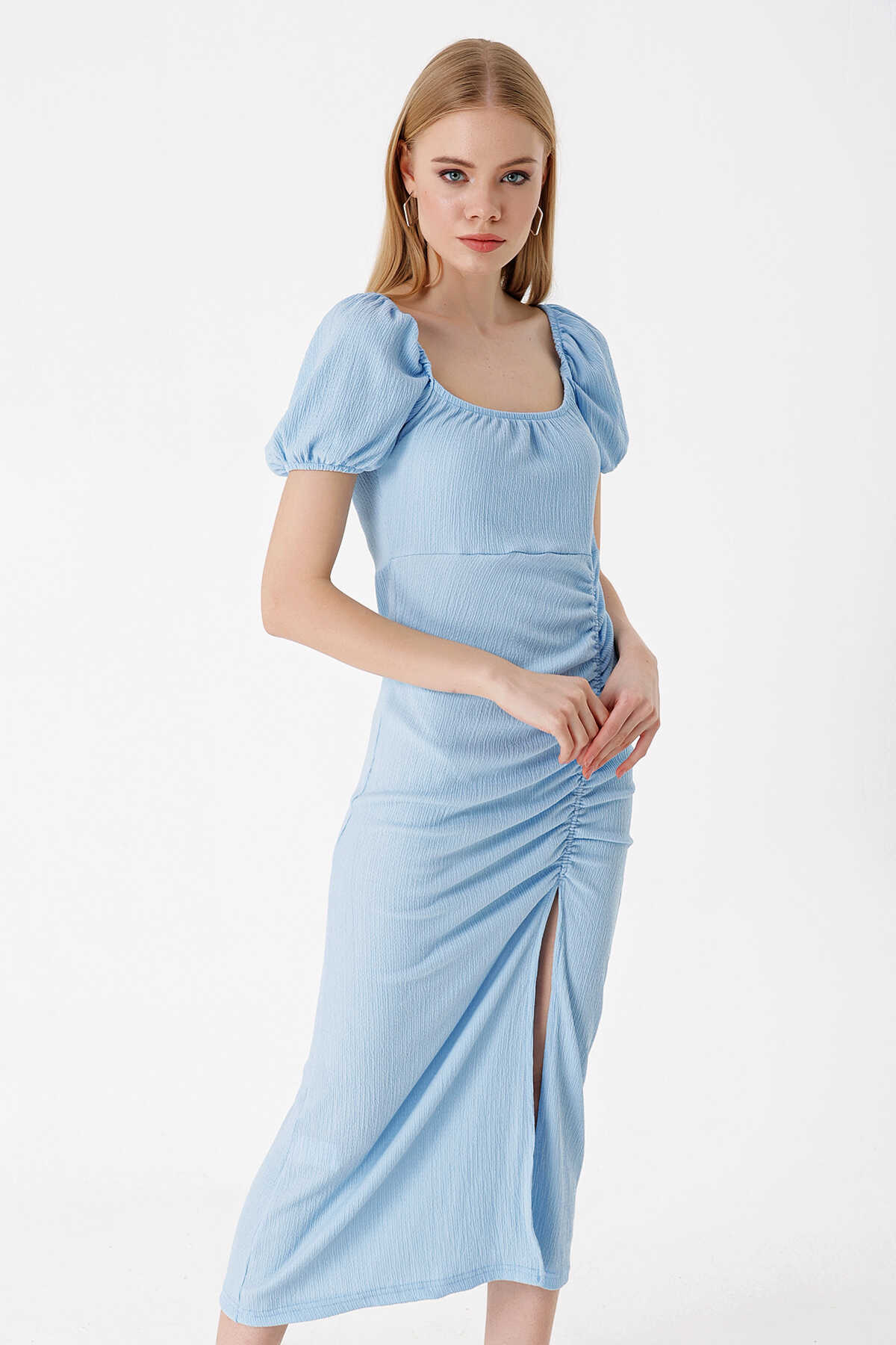 2396 Yırtmaçlı Yazlık Örme Elbise - Mavi