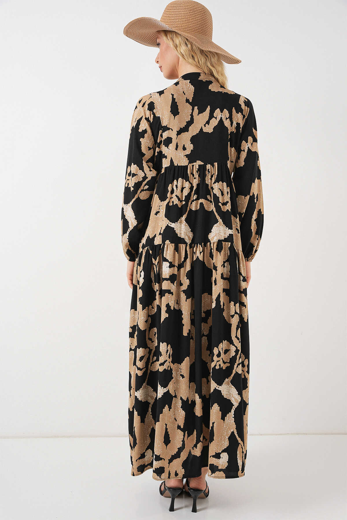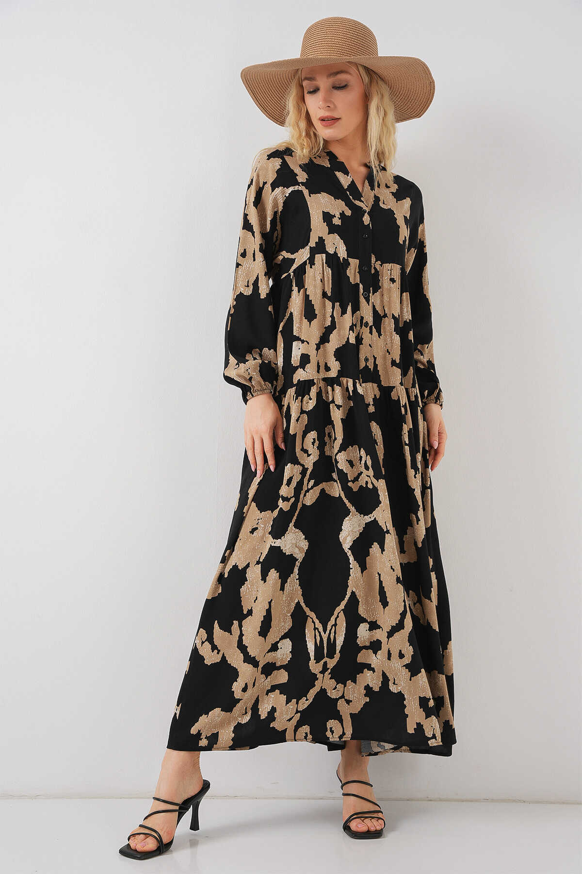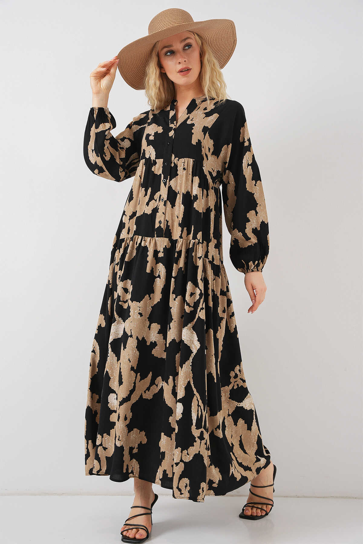 2423 Otantik Desenli Tesettür Elbise - A.Bej - Kombin