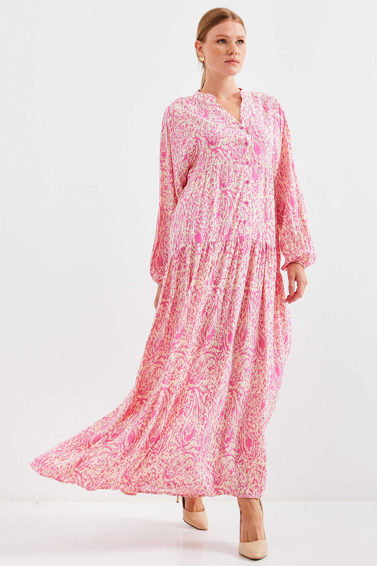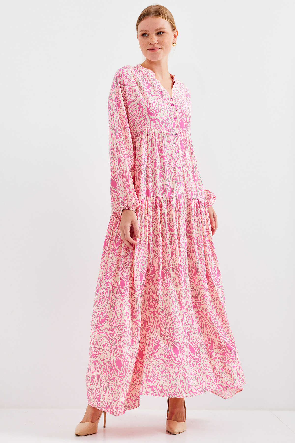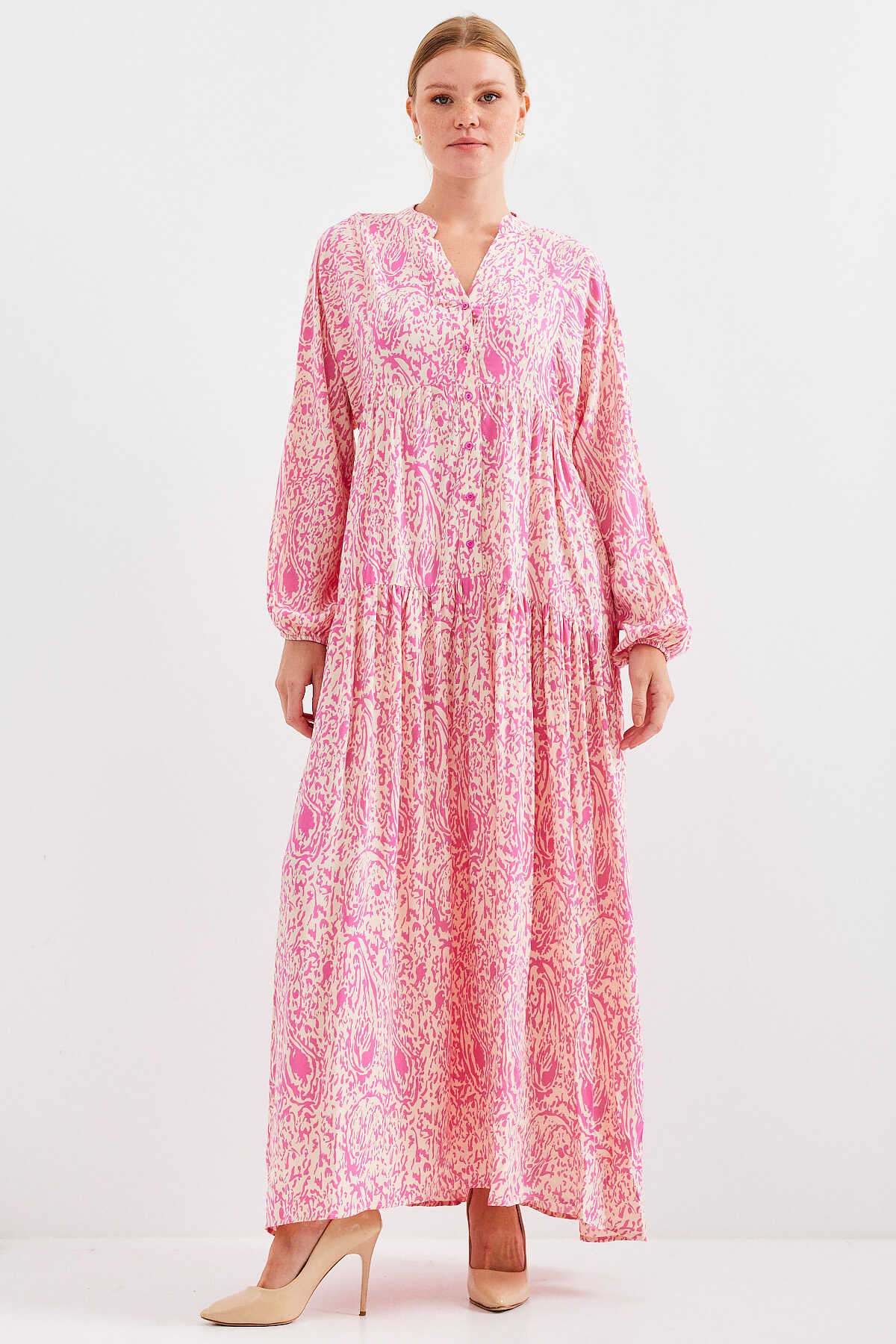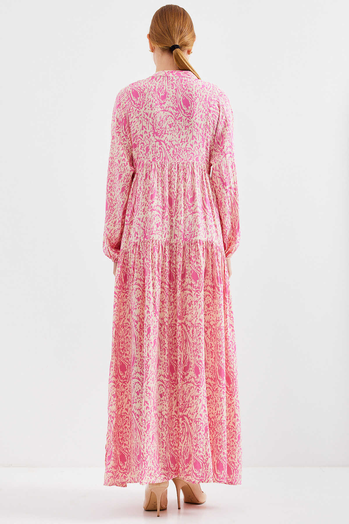 Kadın Desenli Pembe Viskon Tesettür Elbise 2423