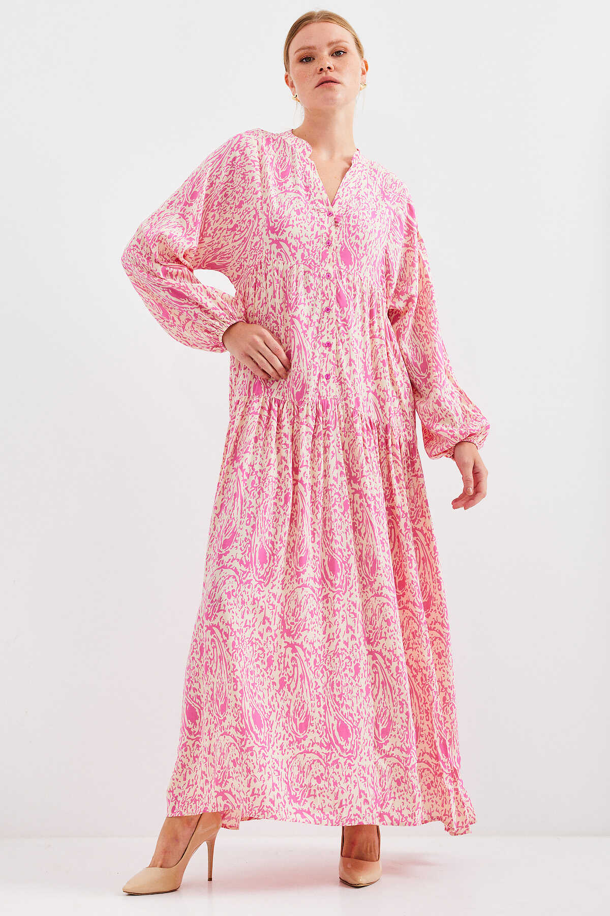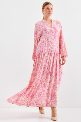 Kadın Desenli Pembe Viskon Tesettür Elbise 2423 - Kombin
