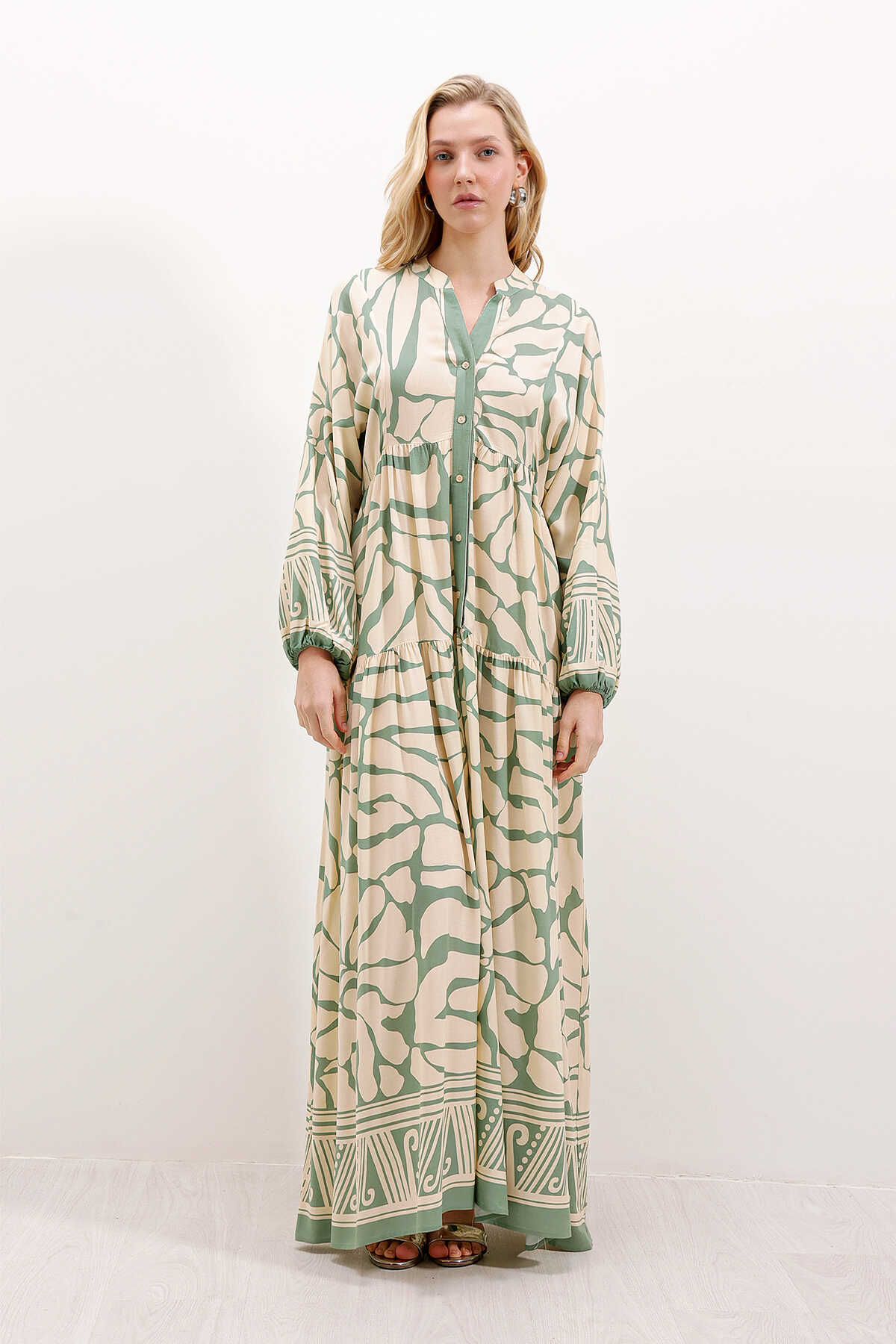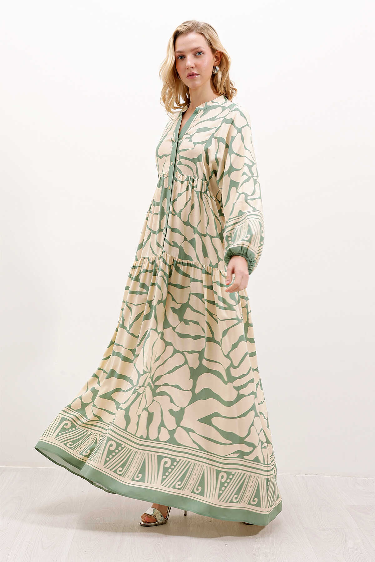 2423 Otantik Desenli Tesettür Elbise - A.Yeşil - Kombin