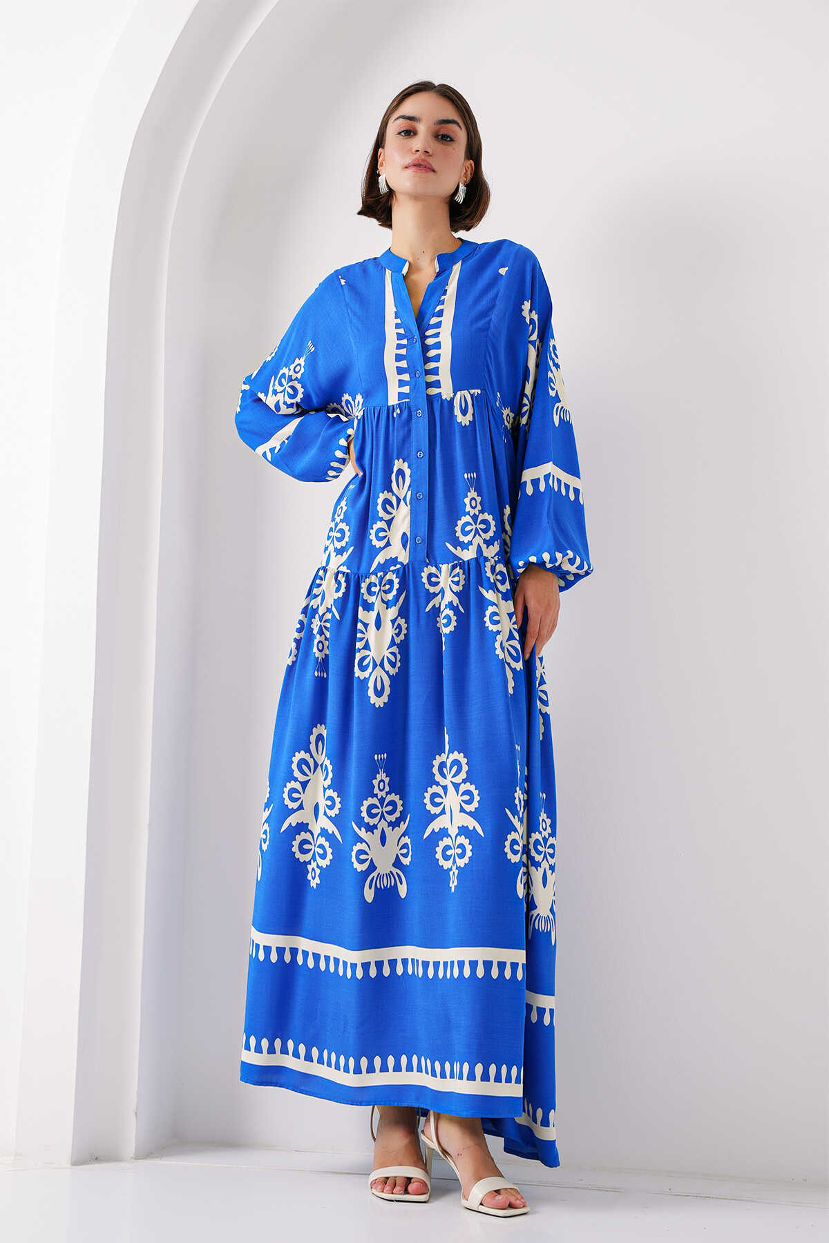 2423 Otantik Desenli Tesettür Elbise - Beyaz - Lacivert