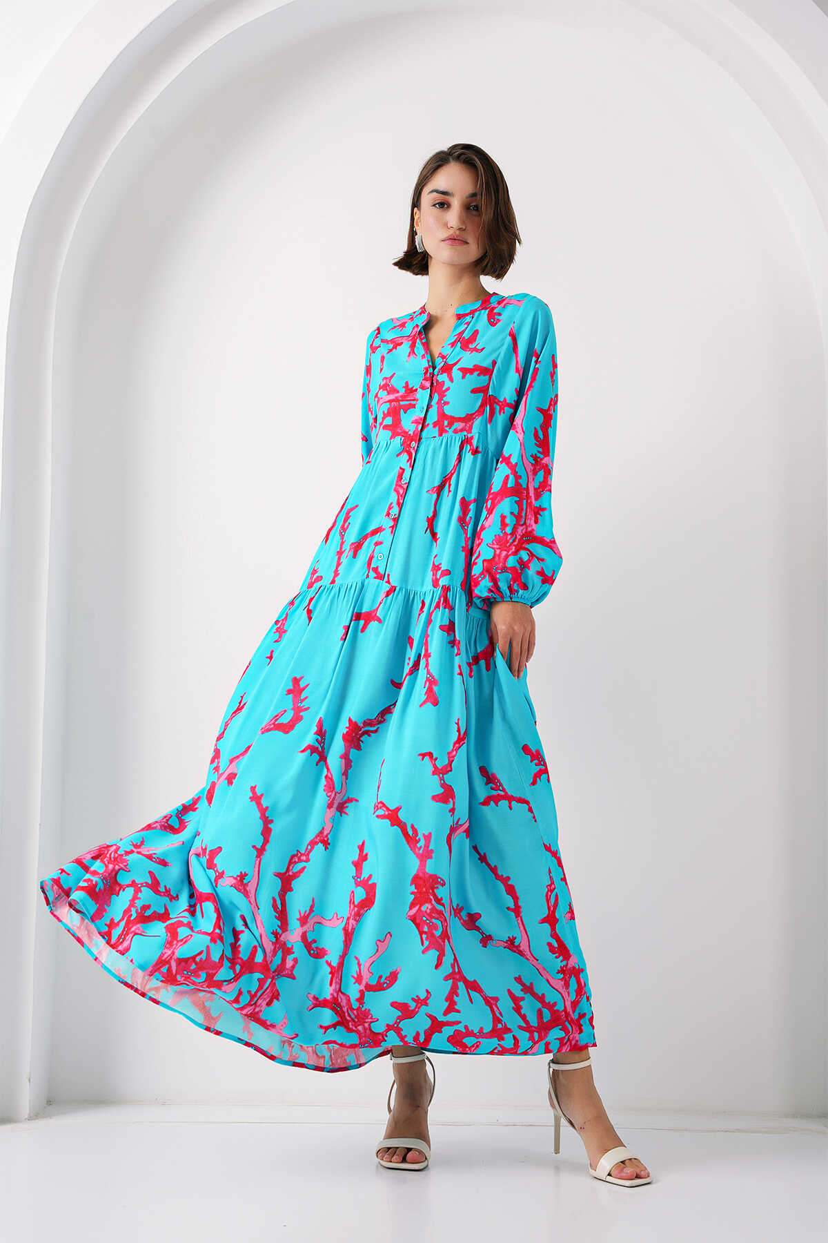 2423 Otantik Desenli Tesettür Elbise - Buz Mavi - Kombin