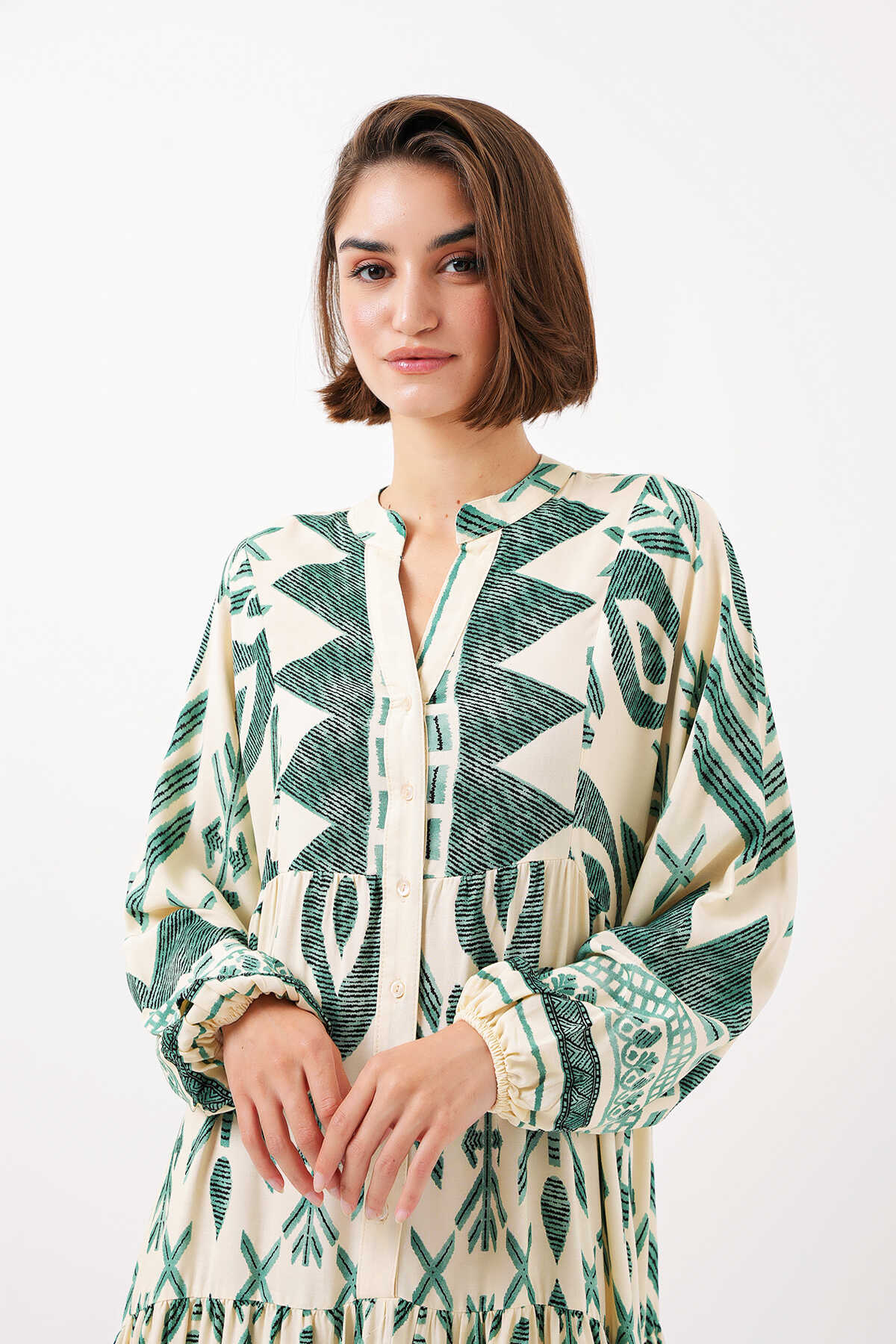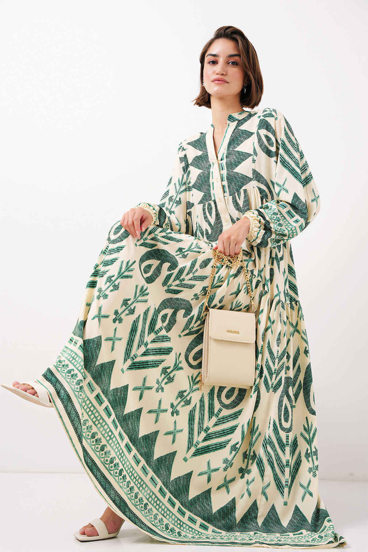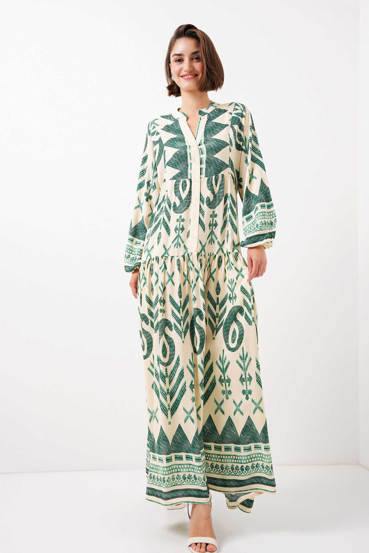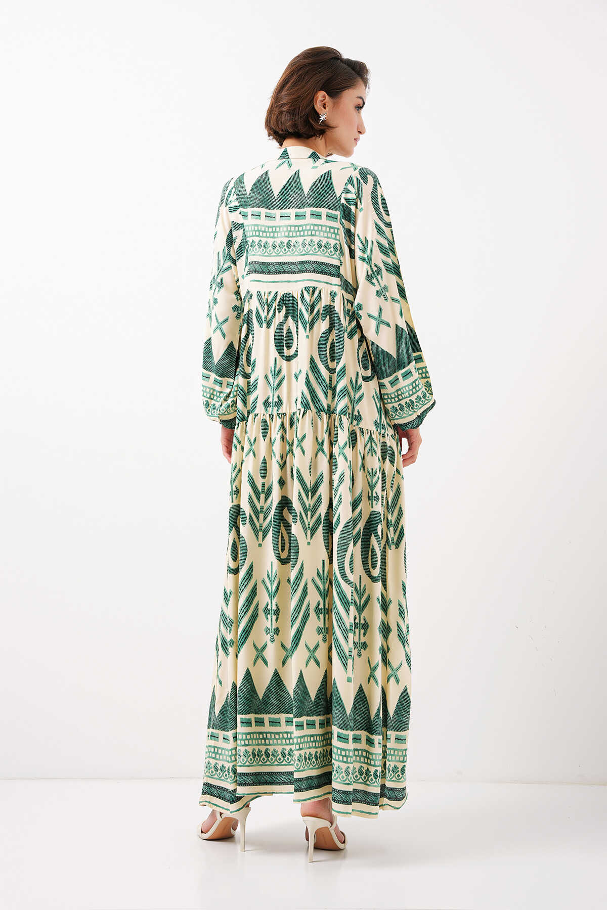 2423 Otantik Desenli Tesettür Elbise - B.Yeşil