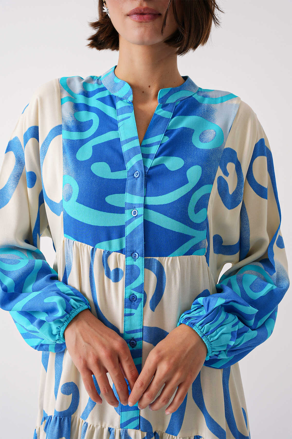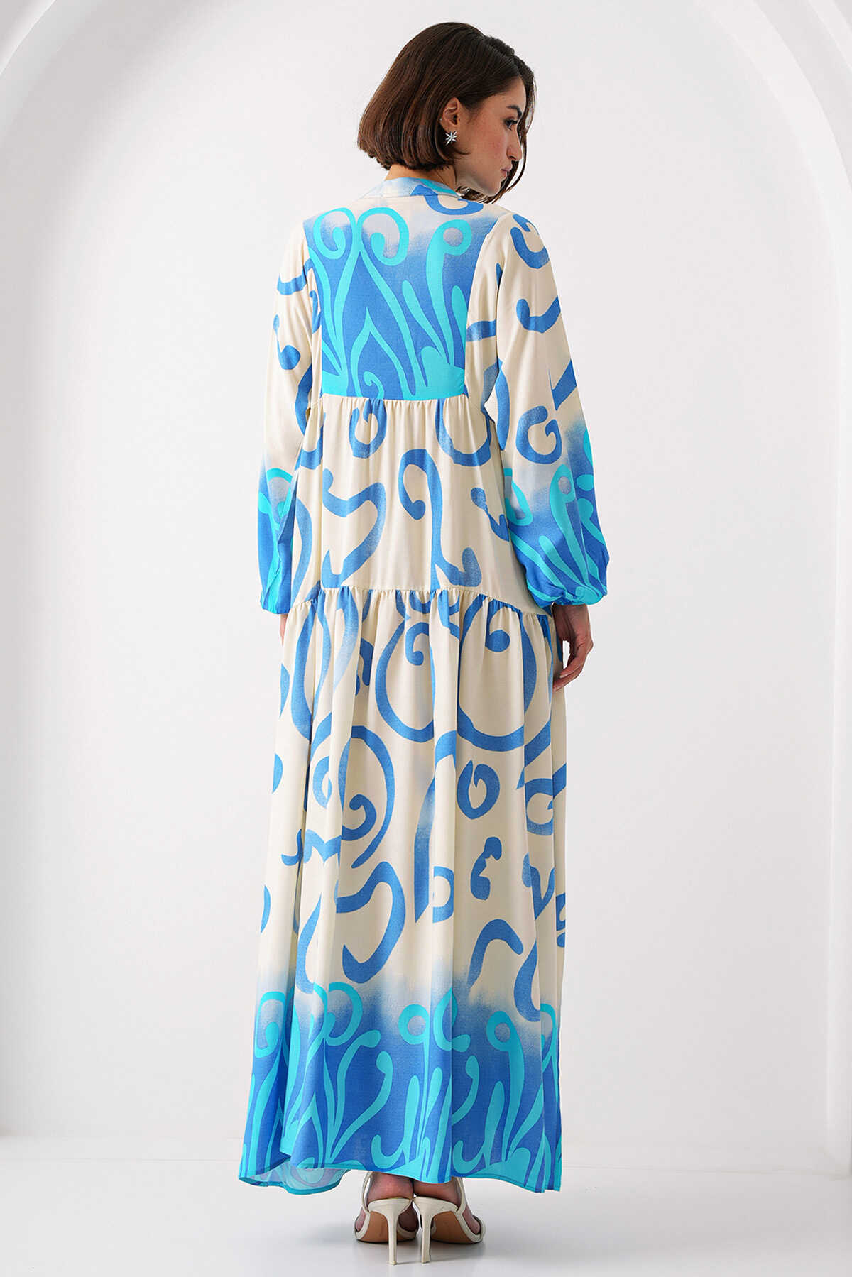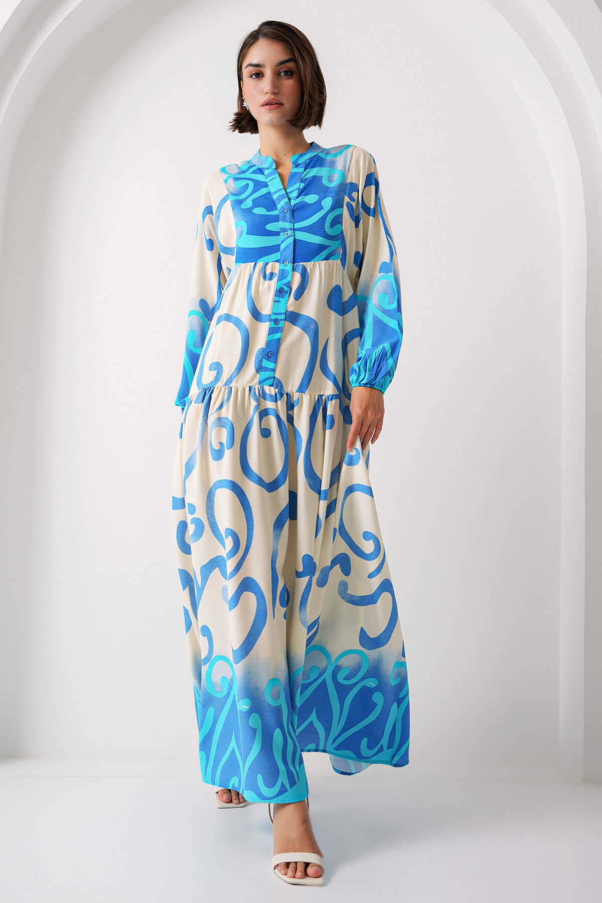 2423 Otantik Desenli Tesettür Elbise - C.Mavi