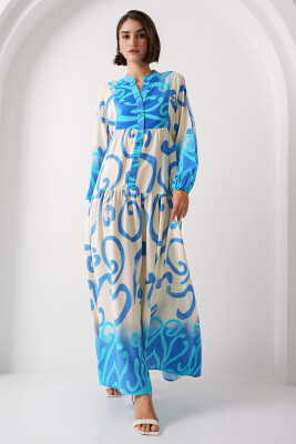 2423 Otantik Desenli Tesettür Elbise - C.Mavi - Kombin