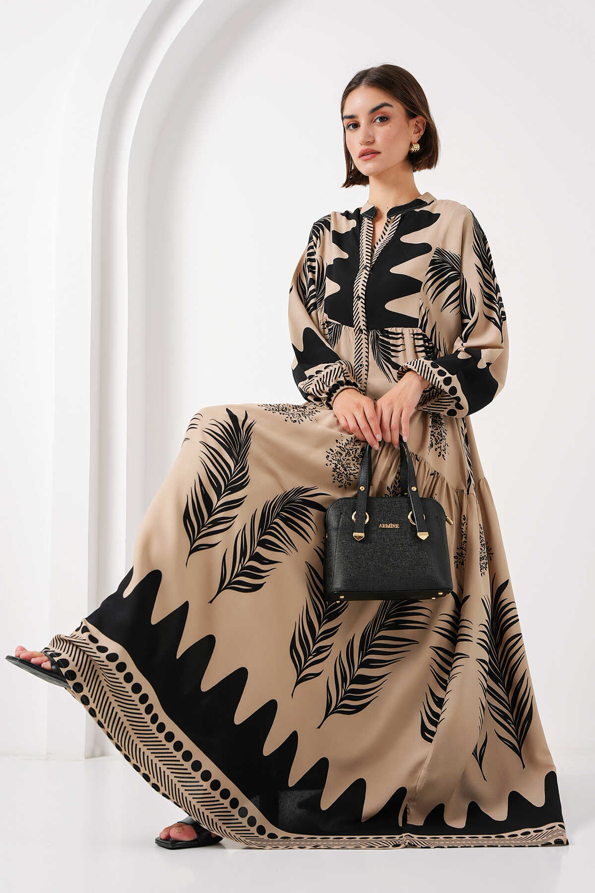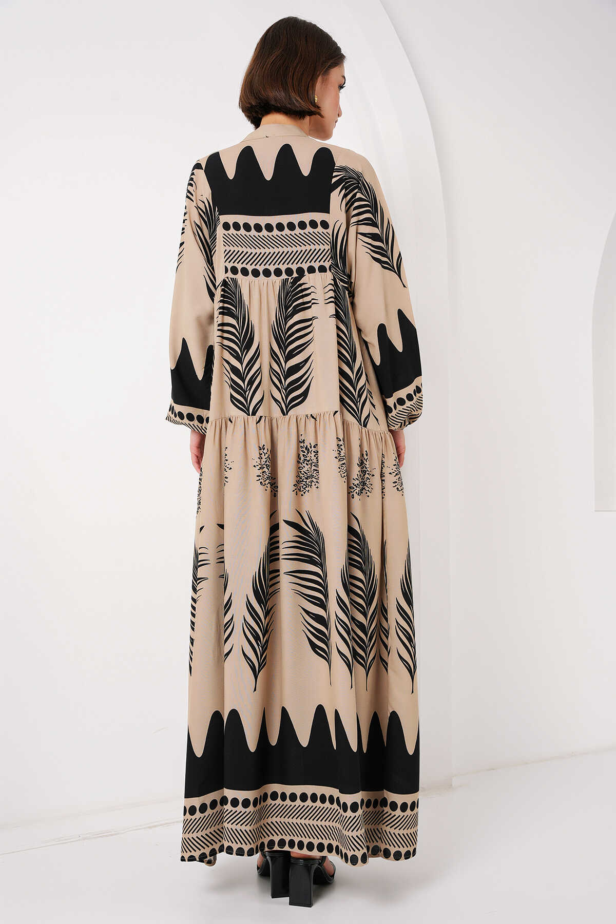 2423 Otantik Desenli Tesettür Elbise - C. Vizon