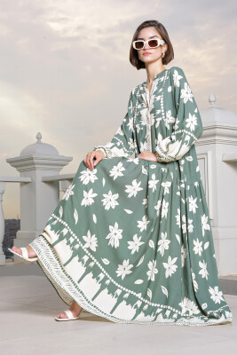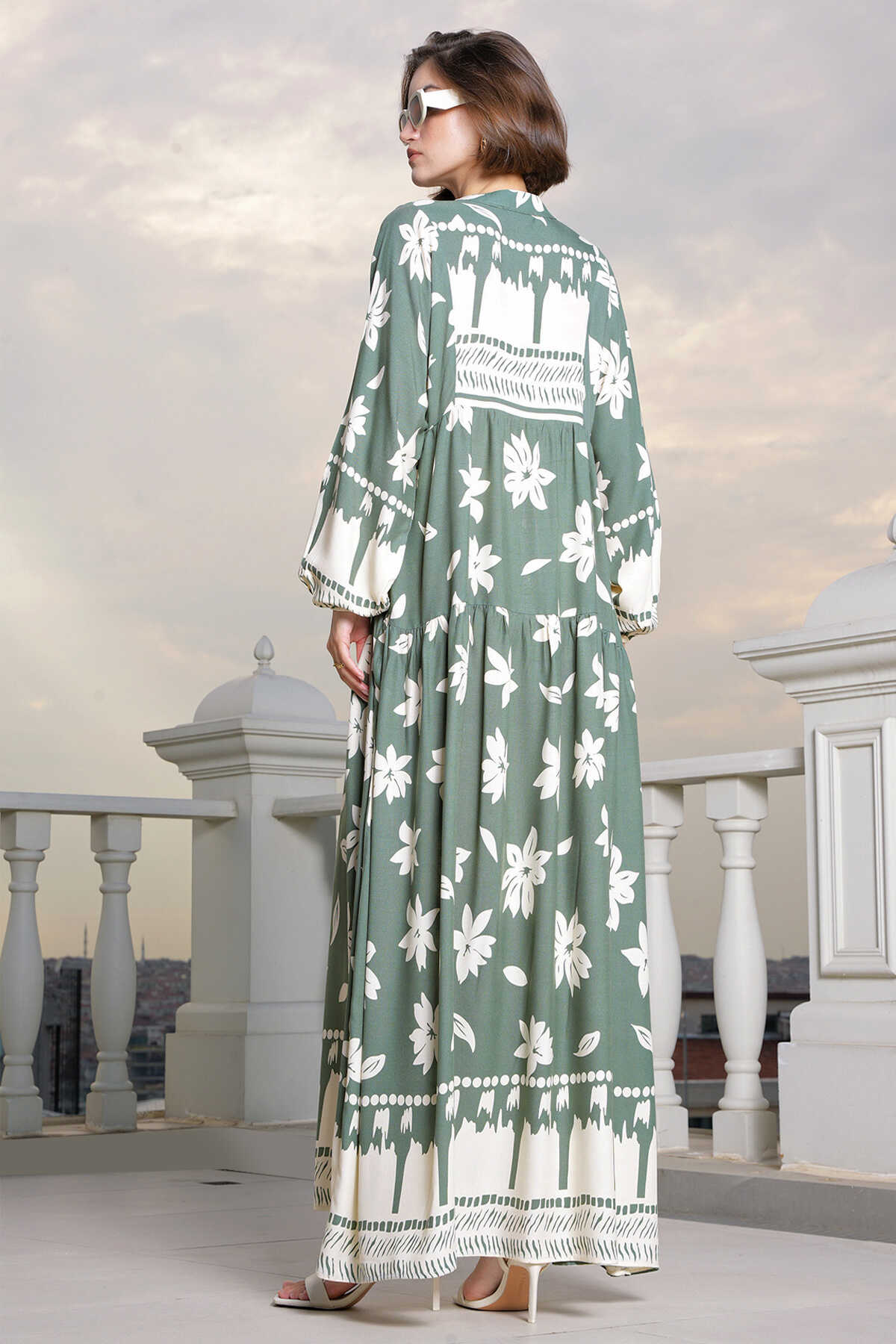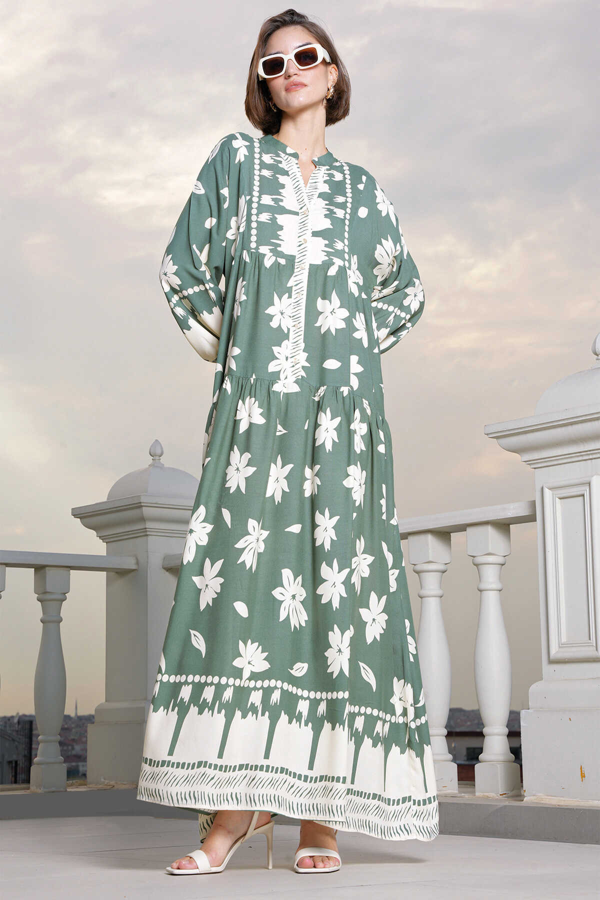 2423 Otantik Desenli Tesettür Elbise - Çağla