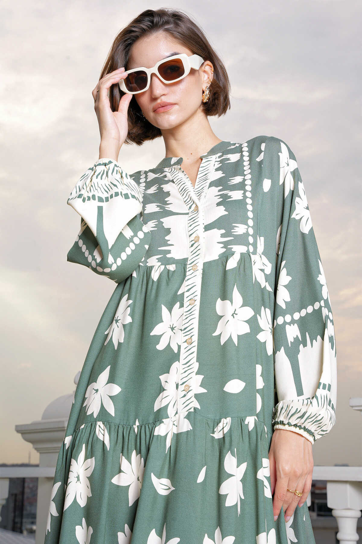 2423 Otantik Desenli Tesettür Elbise - Çağla - Kombin