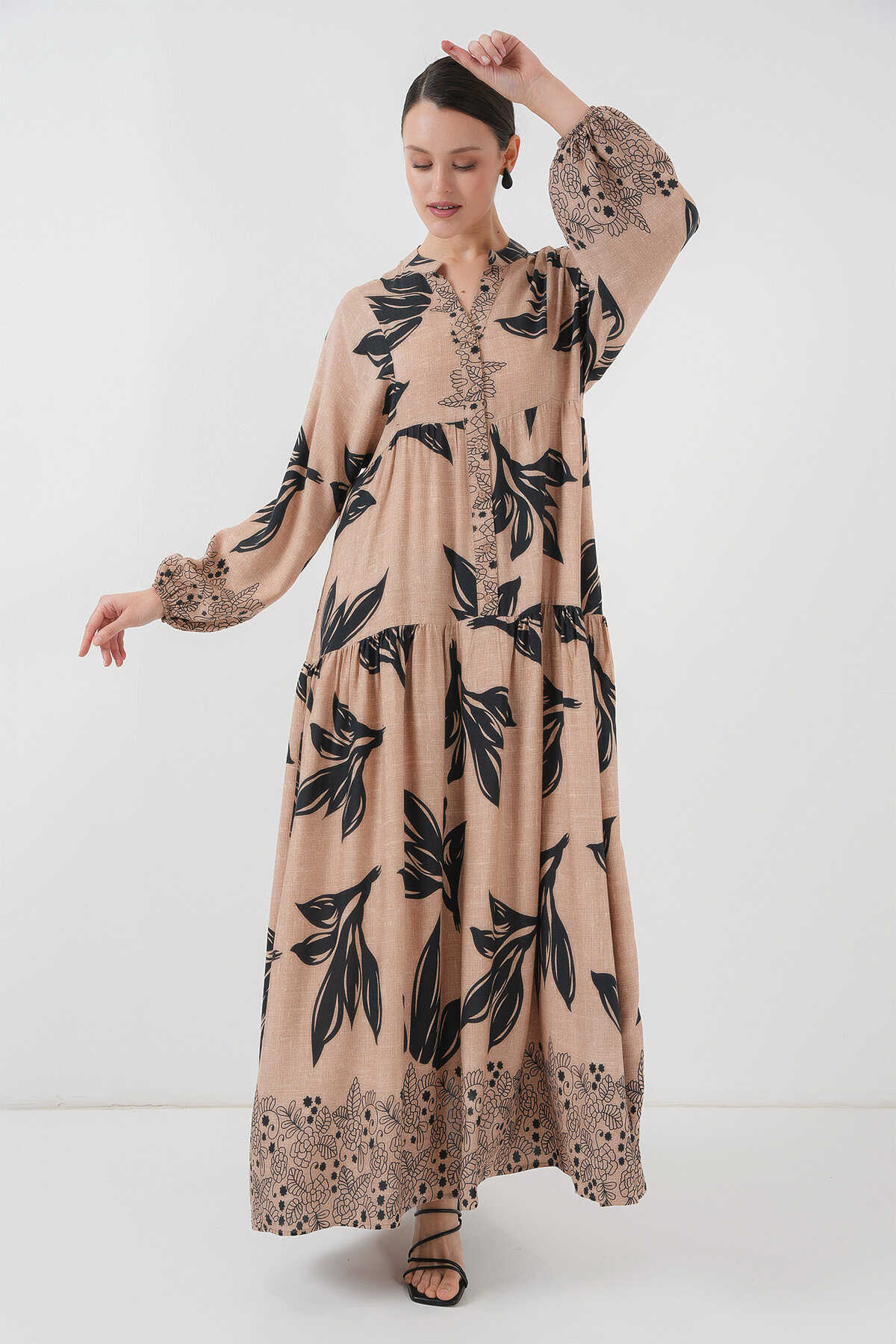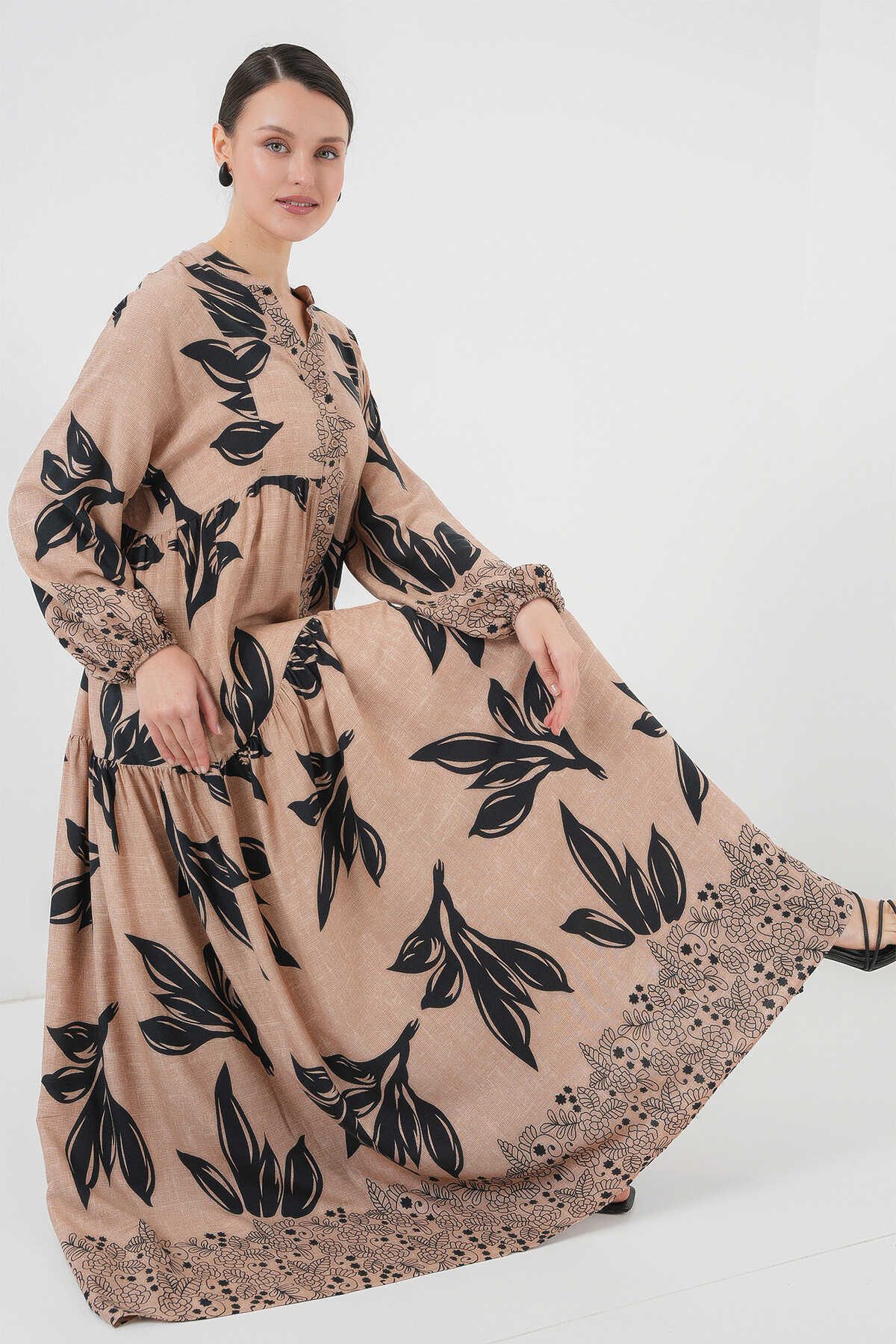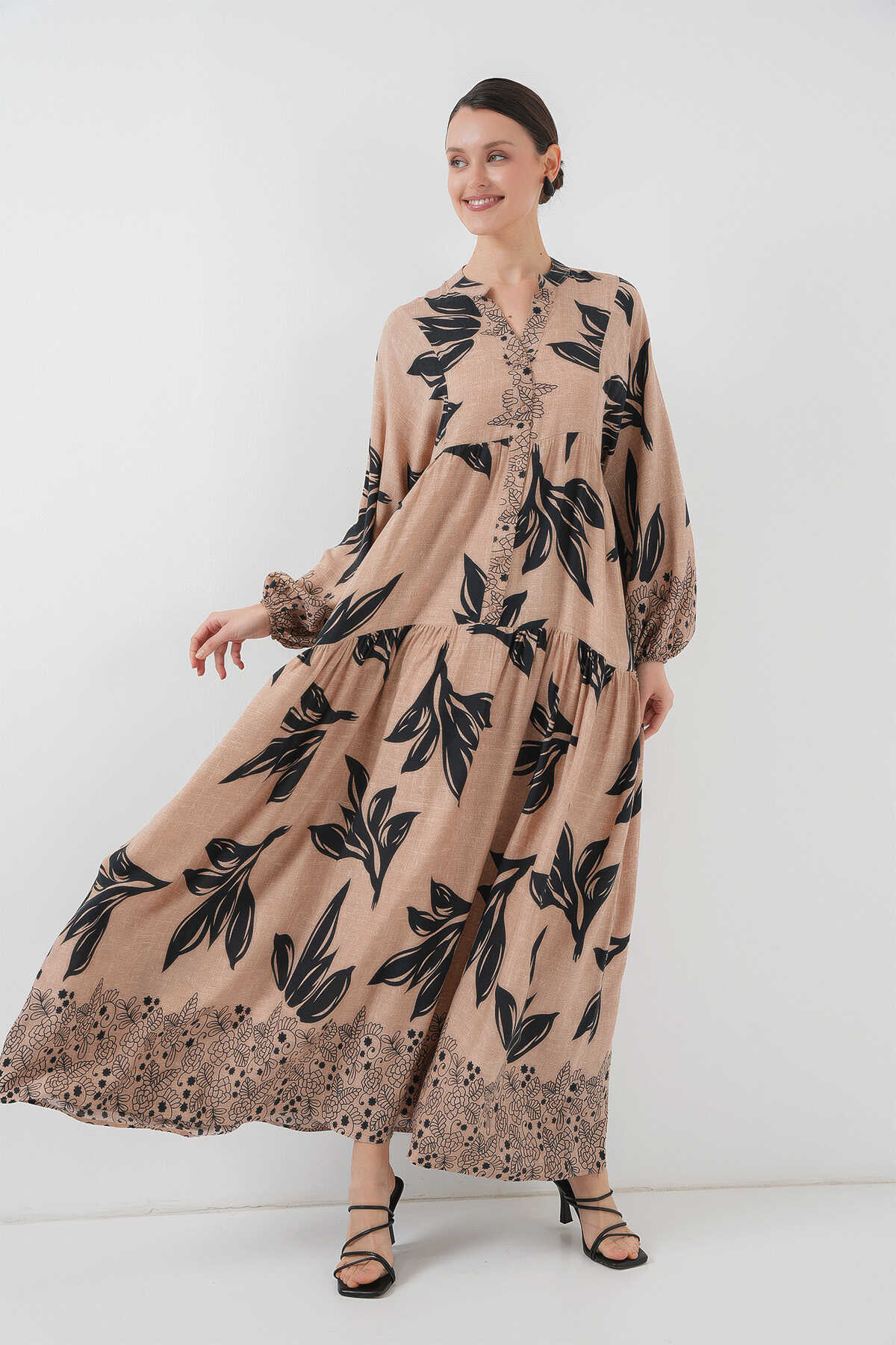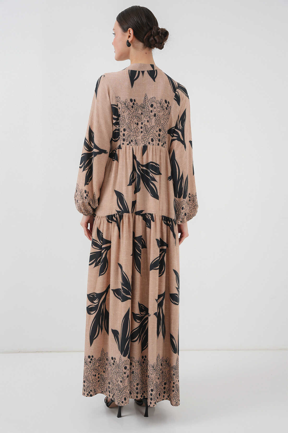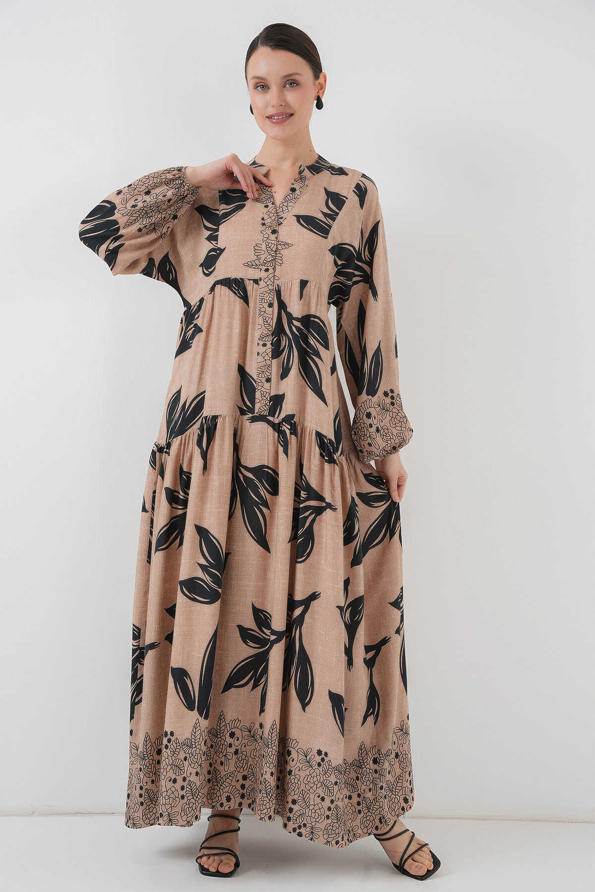 2423 Otantik Desenli Tesettür Elbise - D.Vizon - Kombin