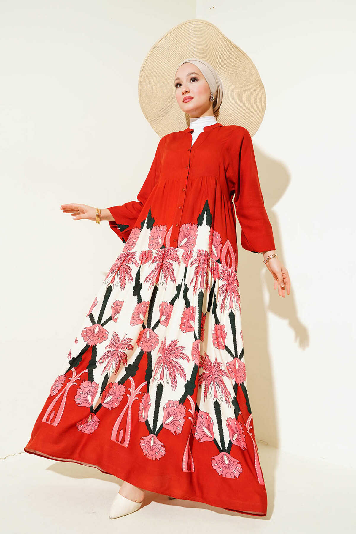 2423 Otantik Desenli Tesettür Elbise - F.Bordo