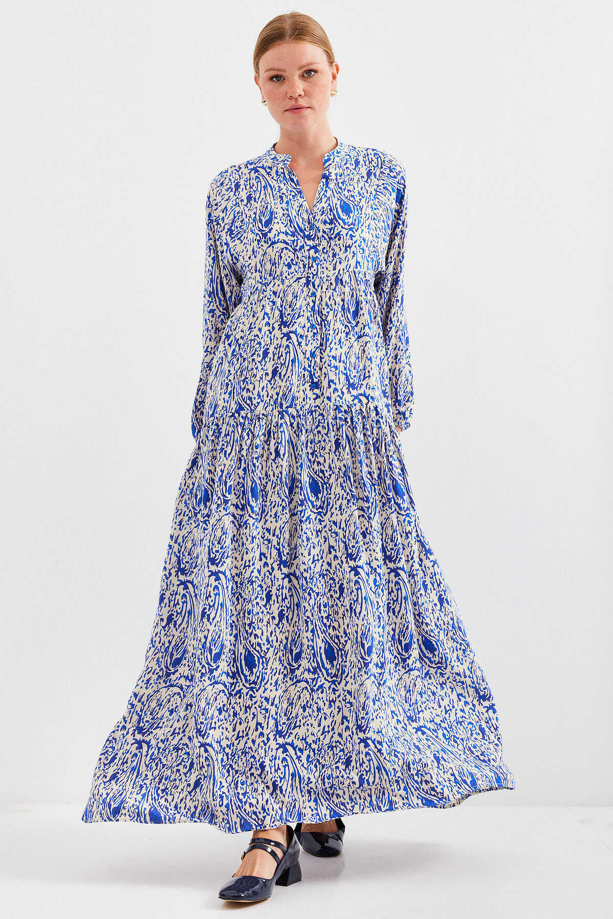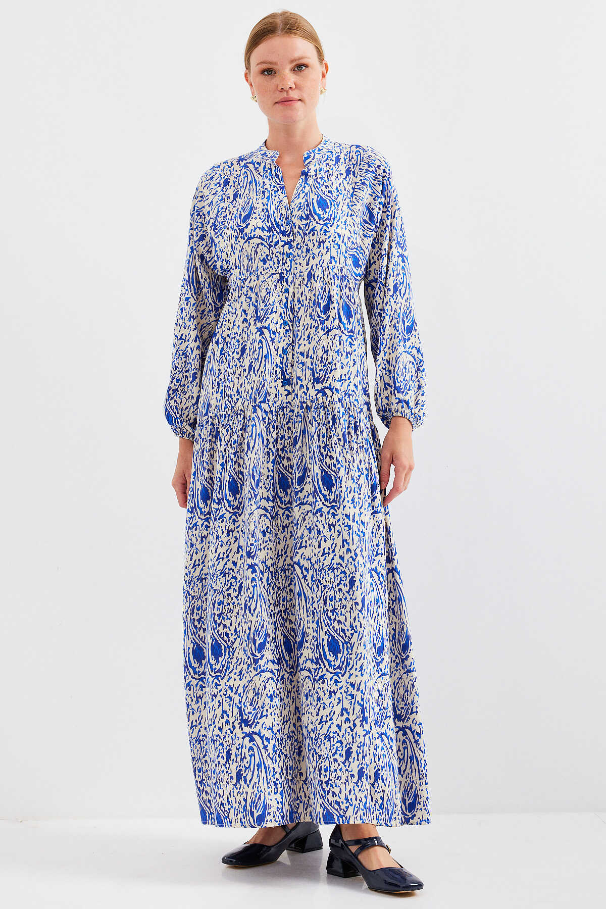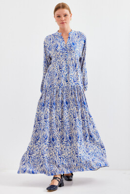 Kadın Desenli Saks Viskon Tesettür Elbise 2423