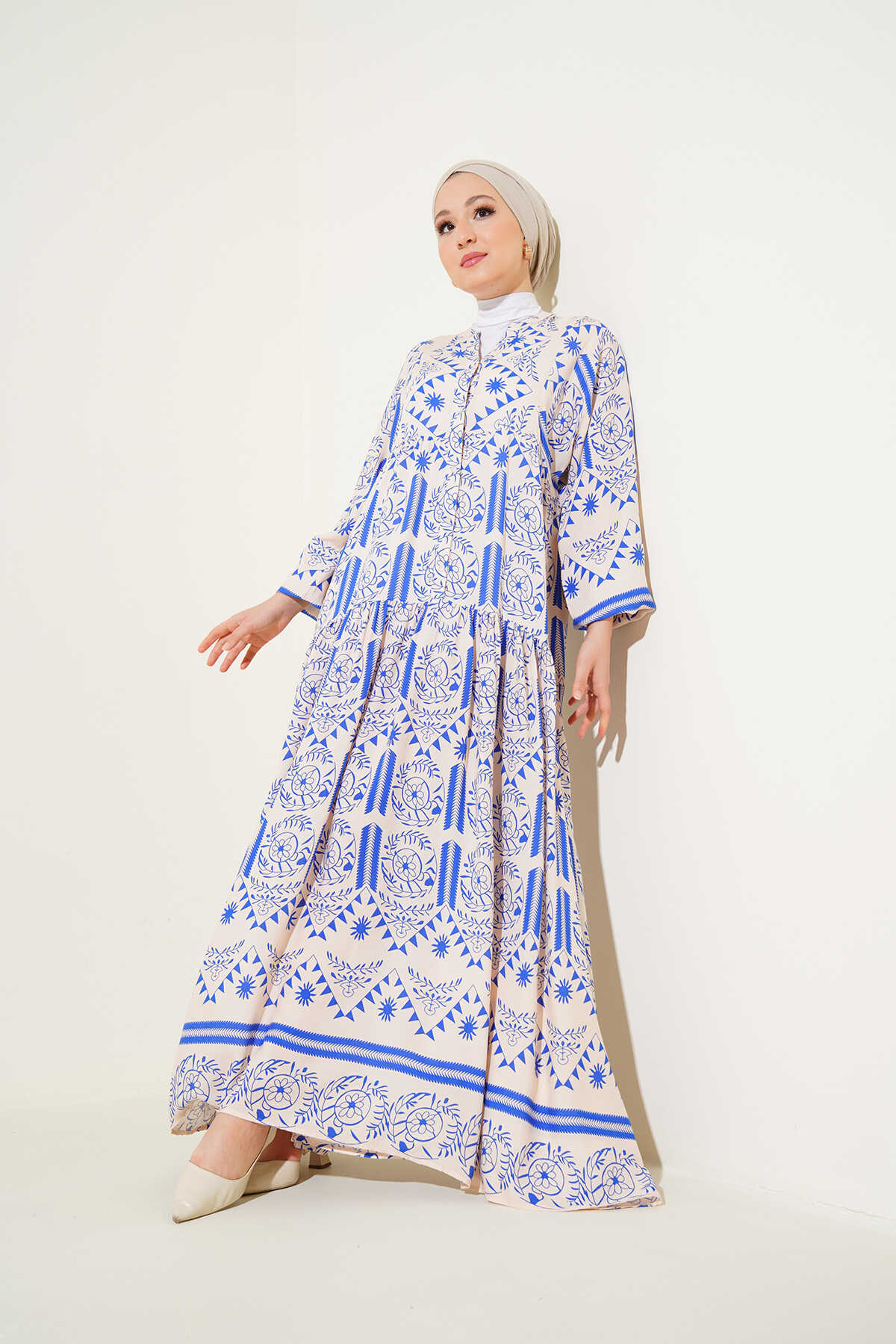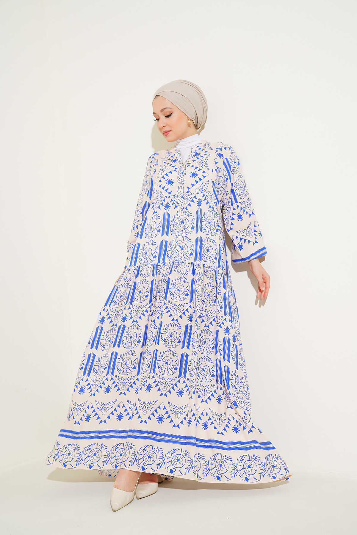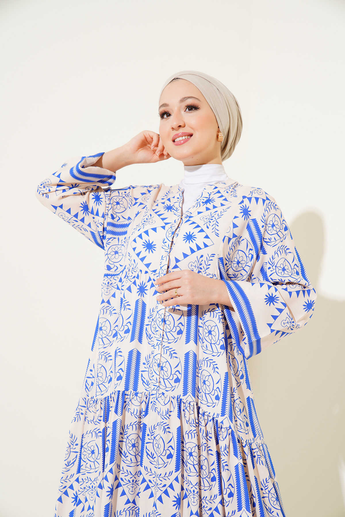 2423 Otantik Desenli Tesettür Elbise - Krem