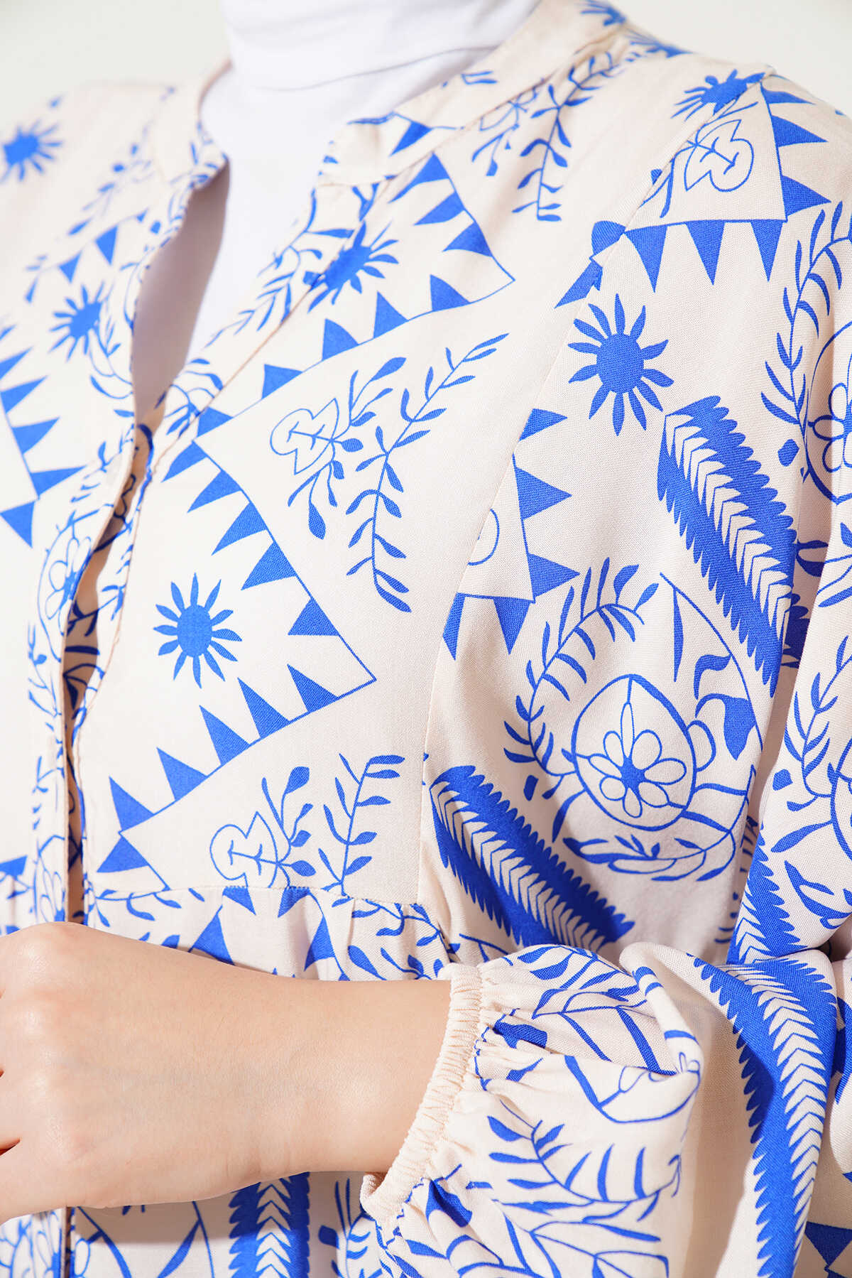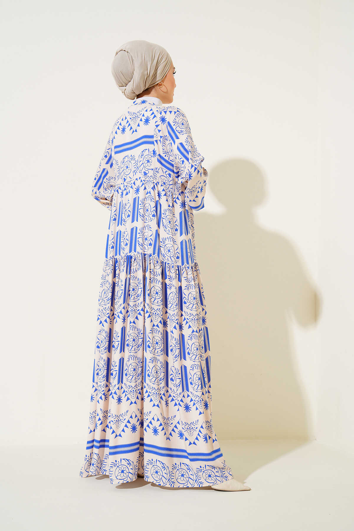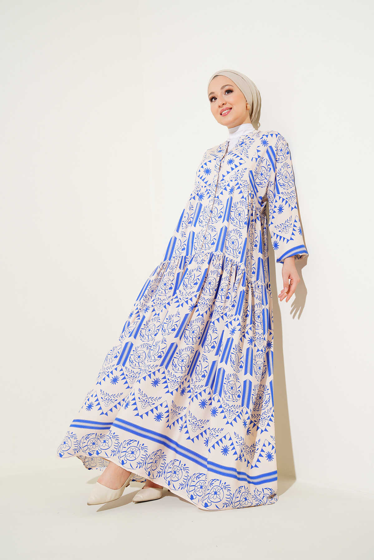 2423 Otantik Desenli Tesettür Elbise - Krem
