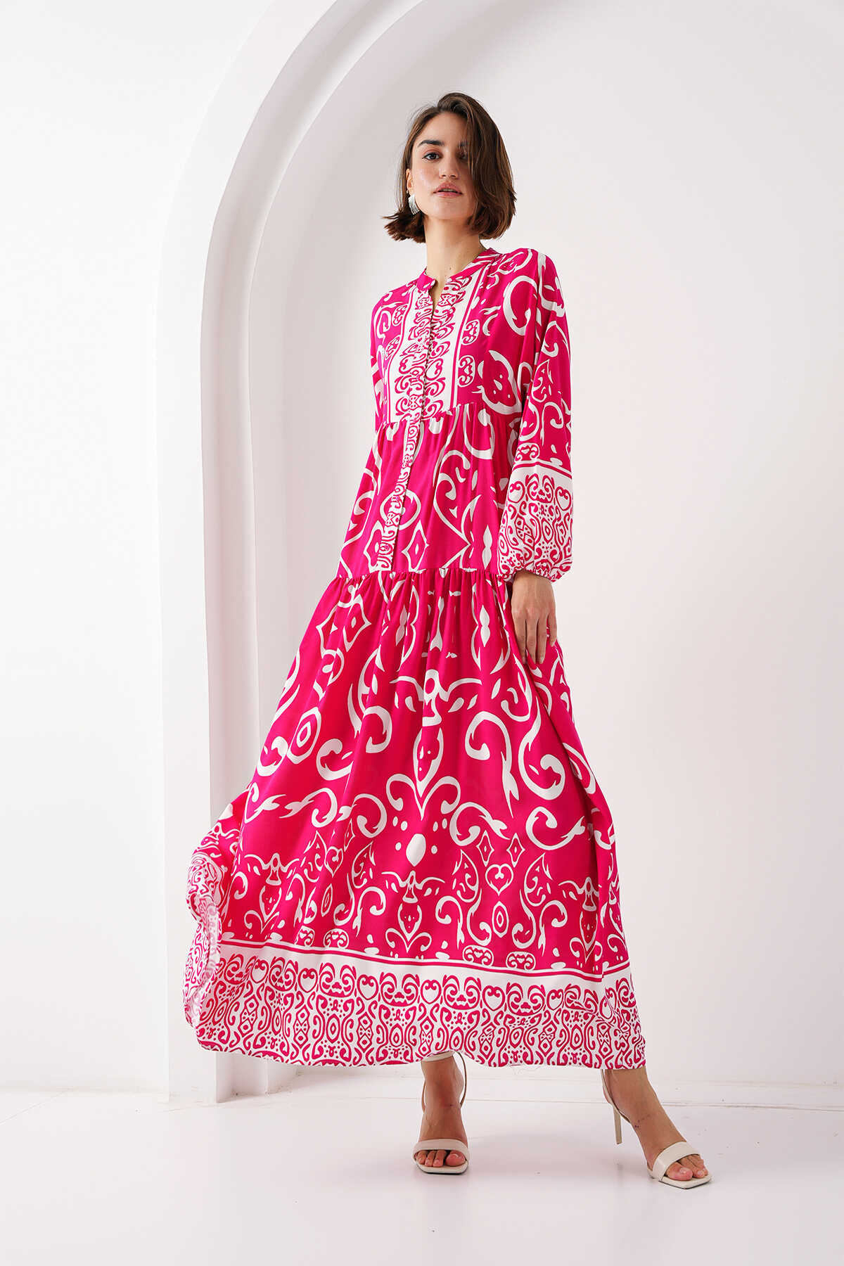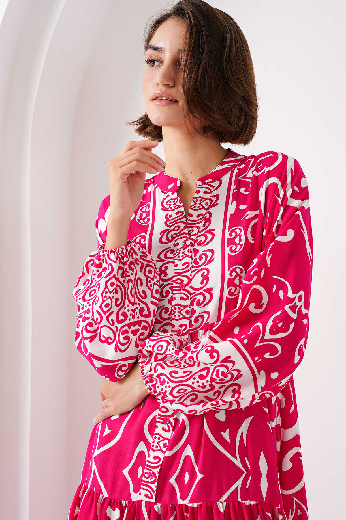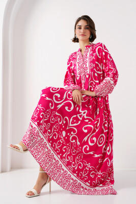 2423 Otantik Desenli Tesettür Elbise - L. Fuşya