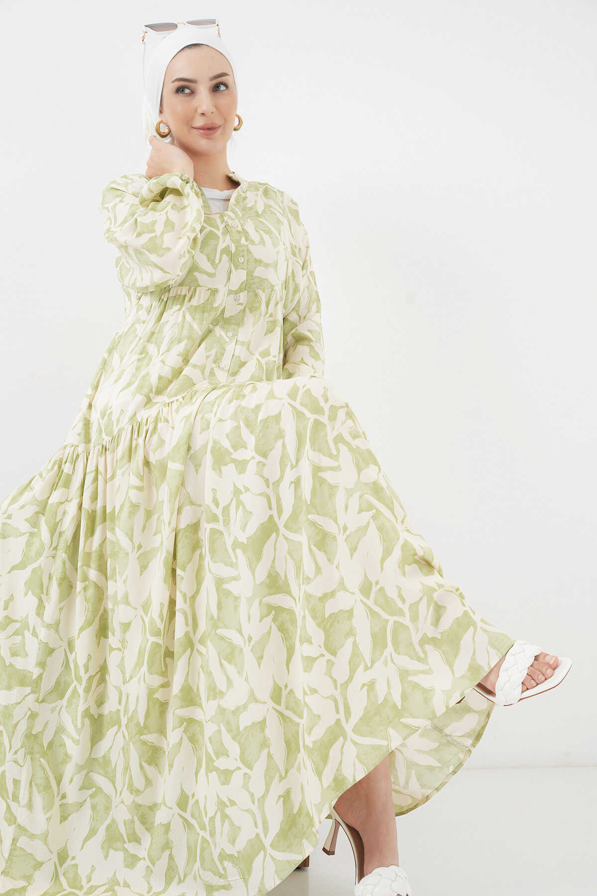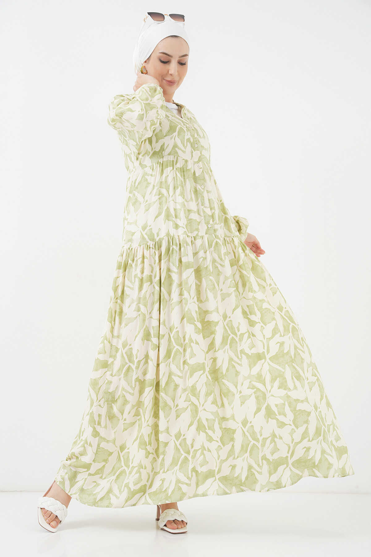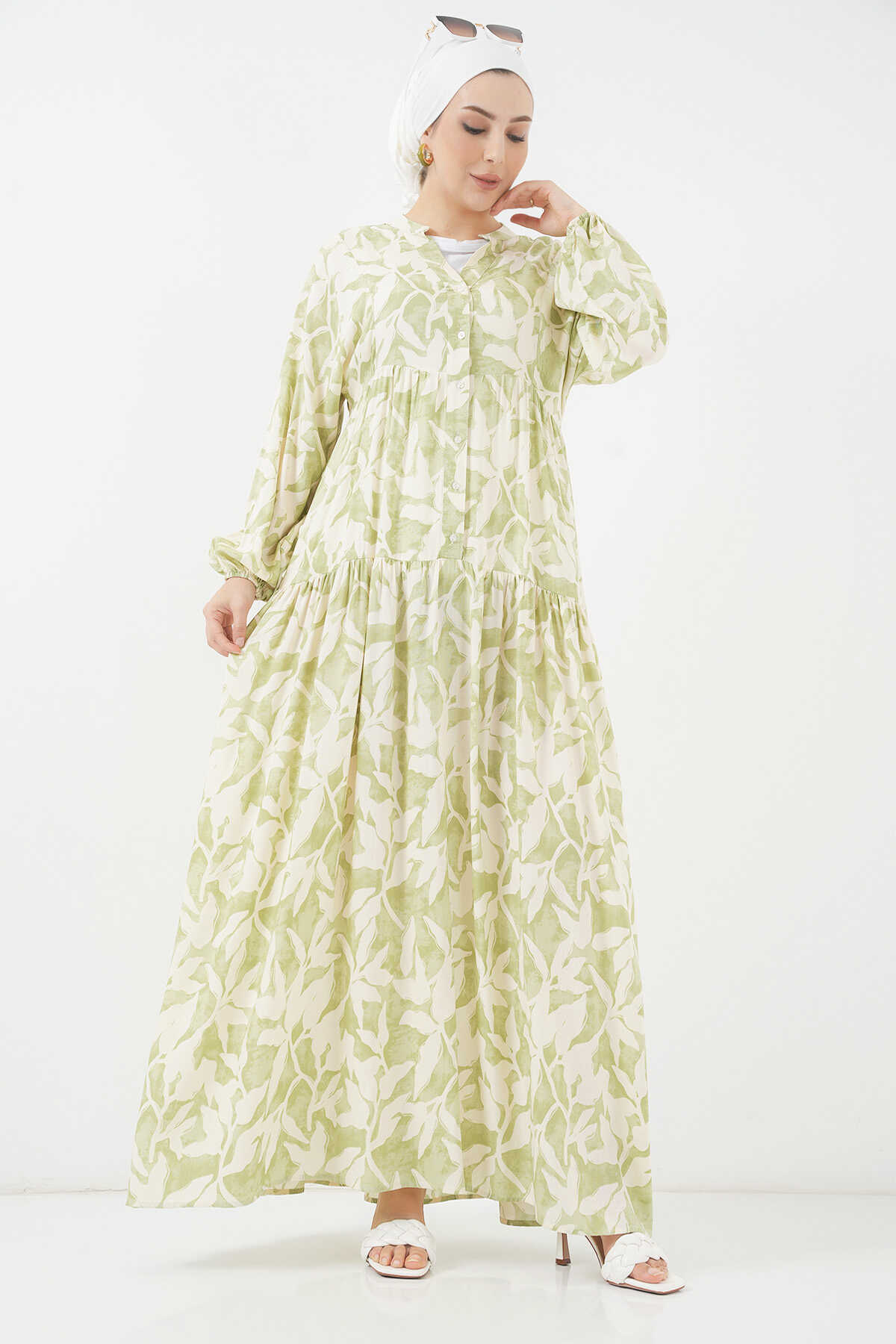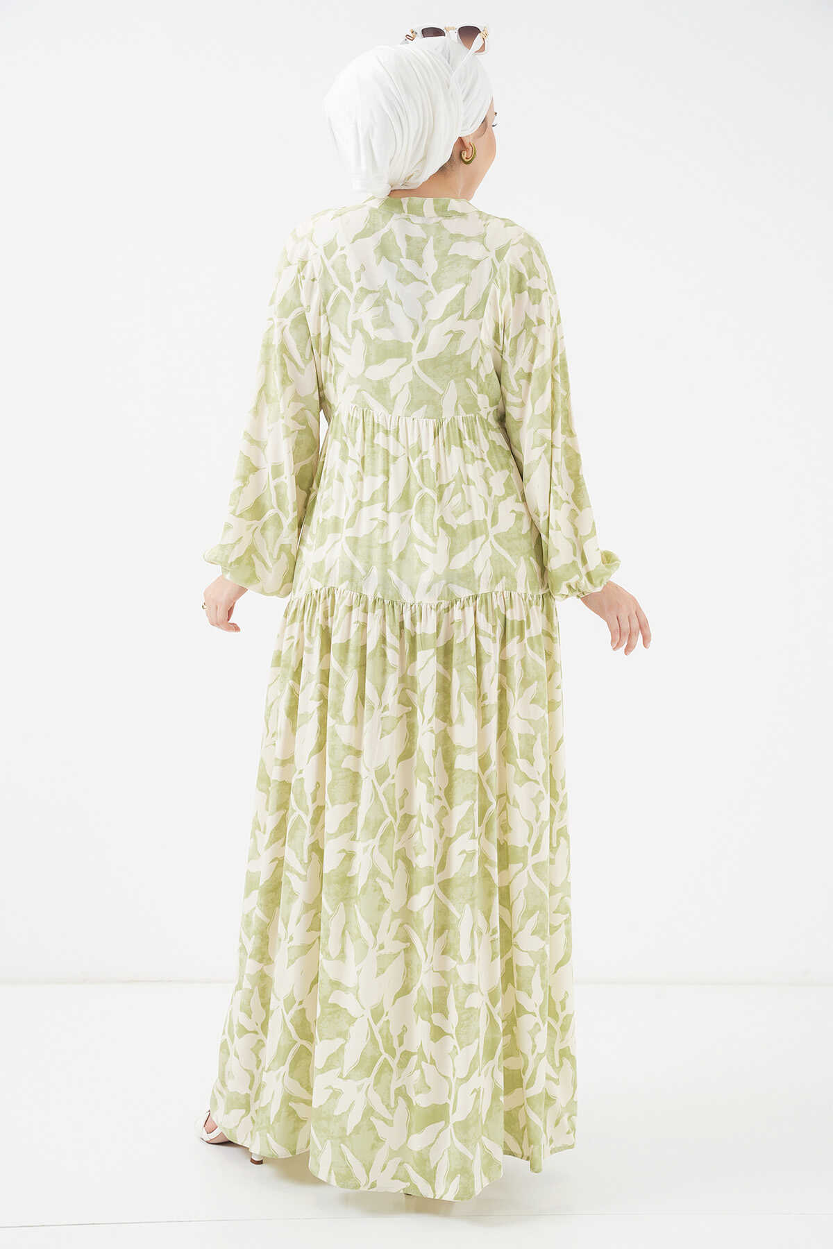 2423 Otantik Desenli Tesettür Elbise - N. Yeşil - Kombin