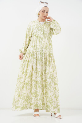 2423 Otantik Desenli Tesettür Elbise - N. Yeşil
