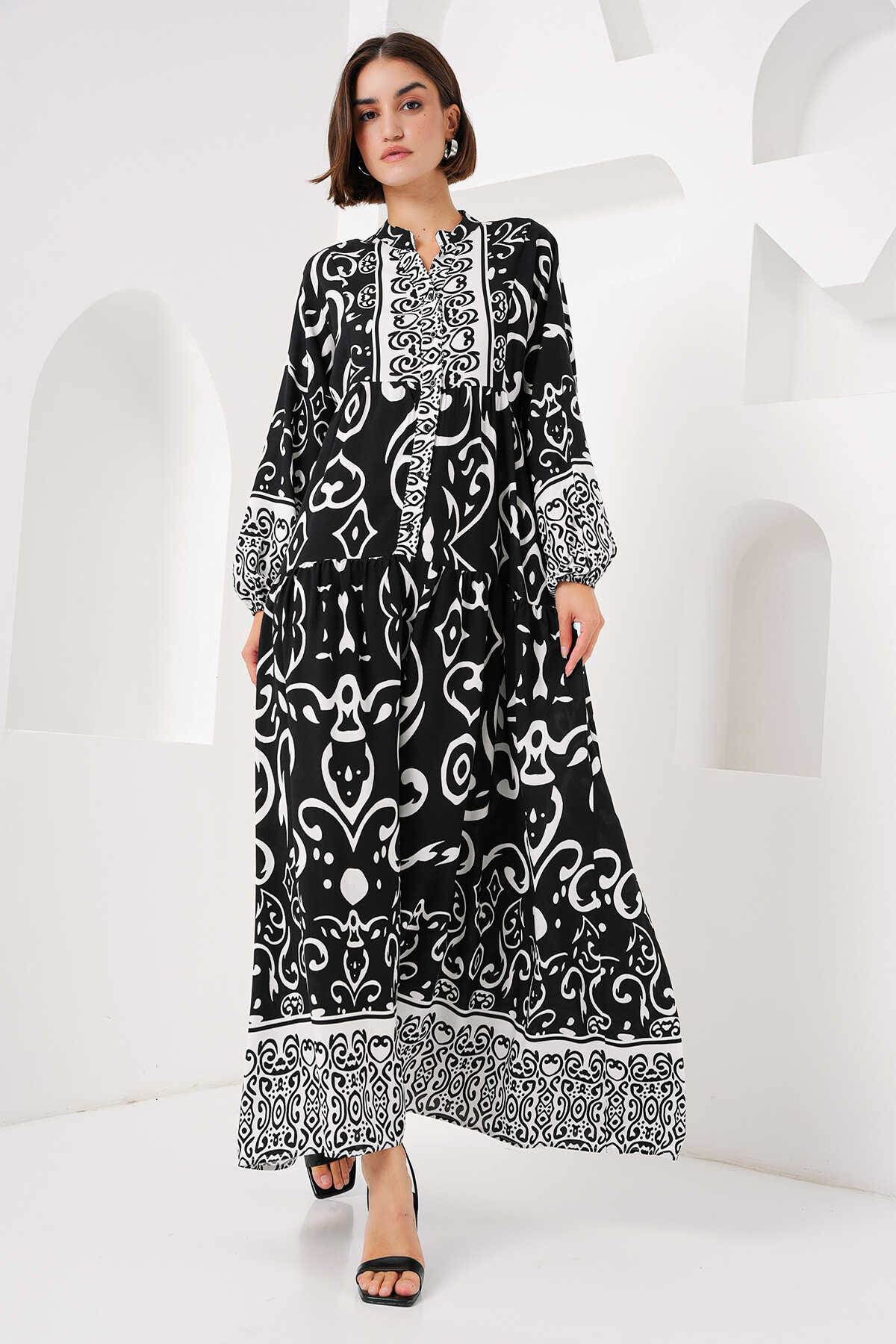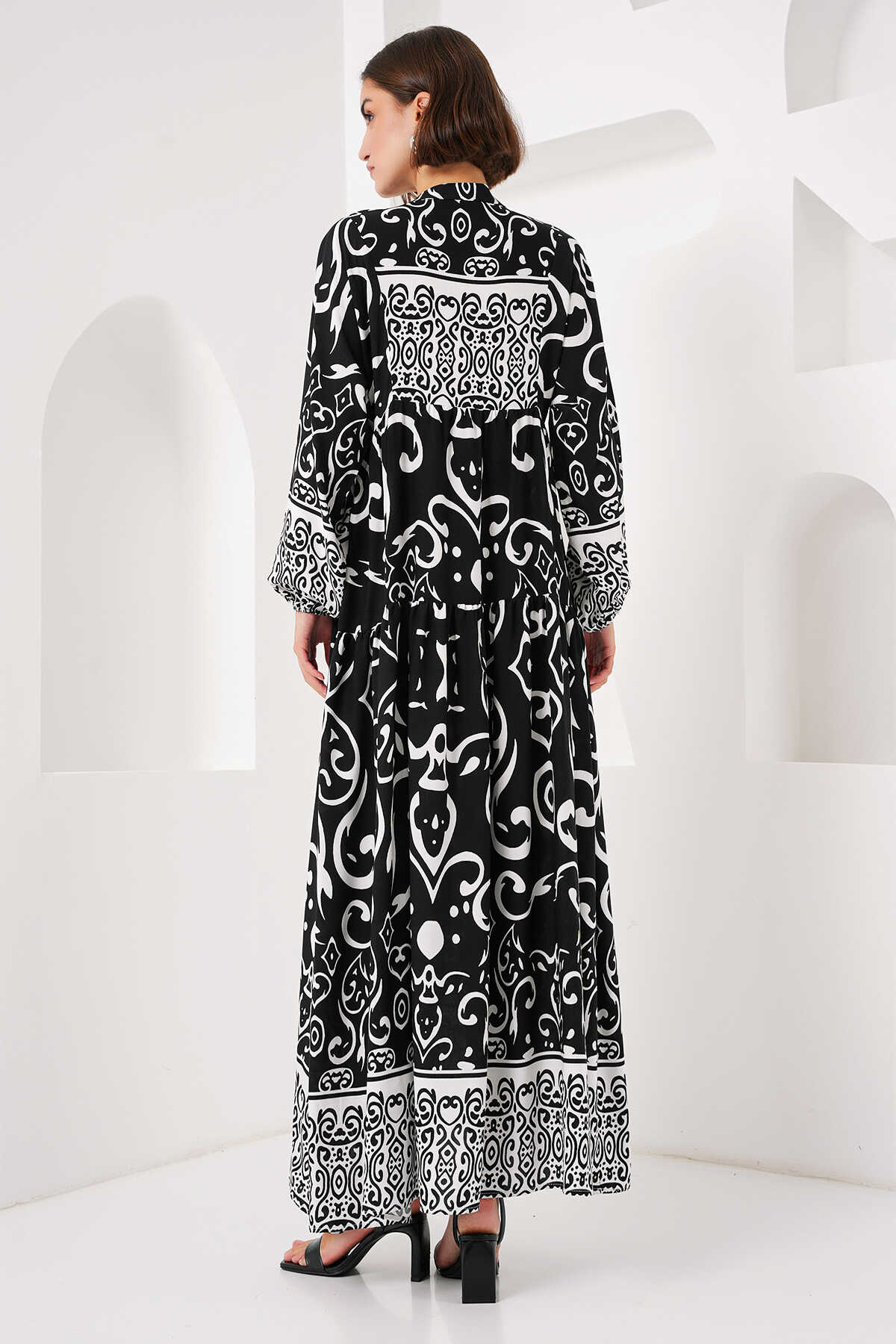 2423 Otantik Desenli Tesettür Elbise - O. Siyah