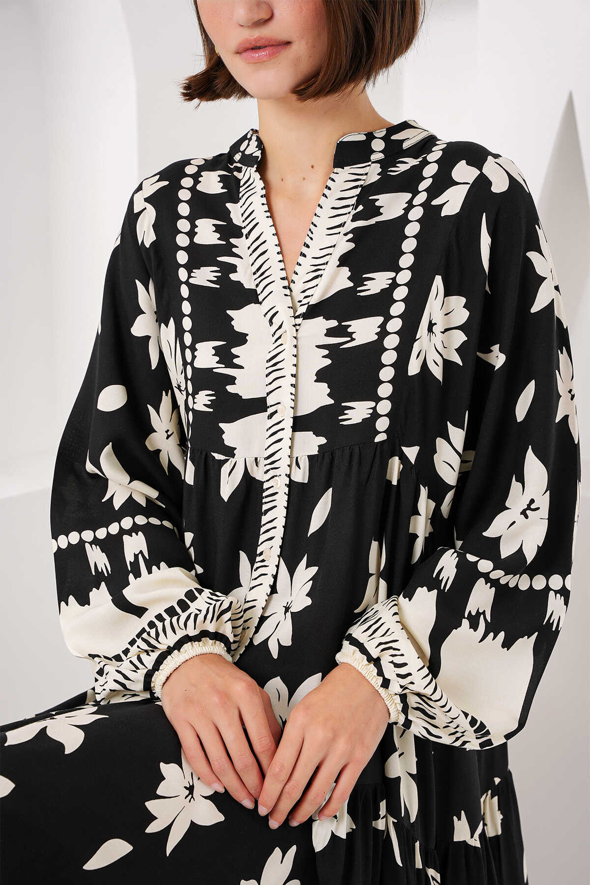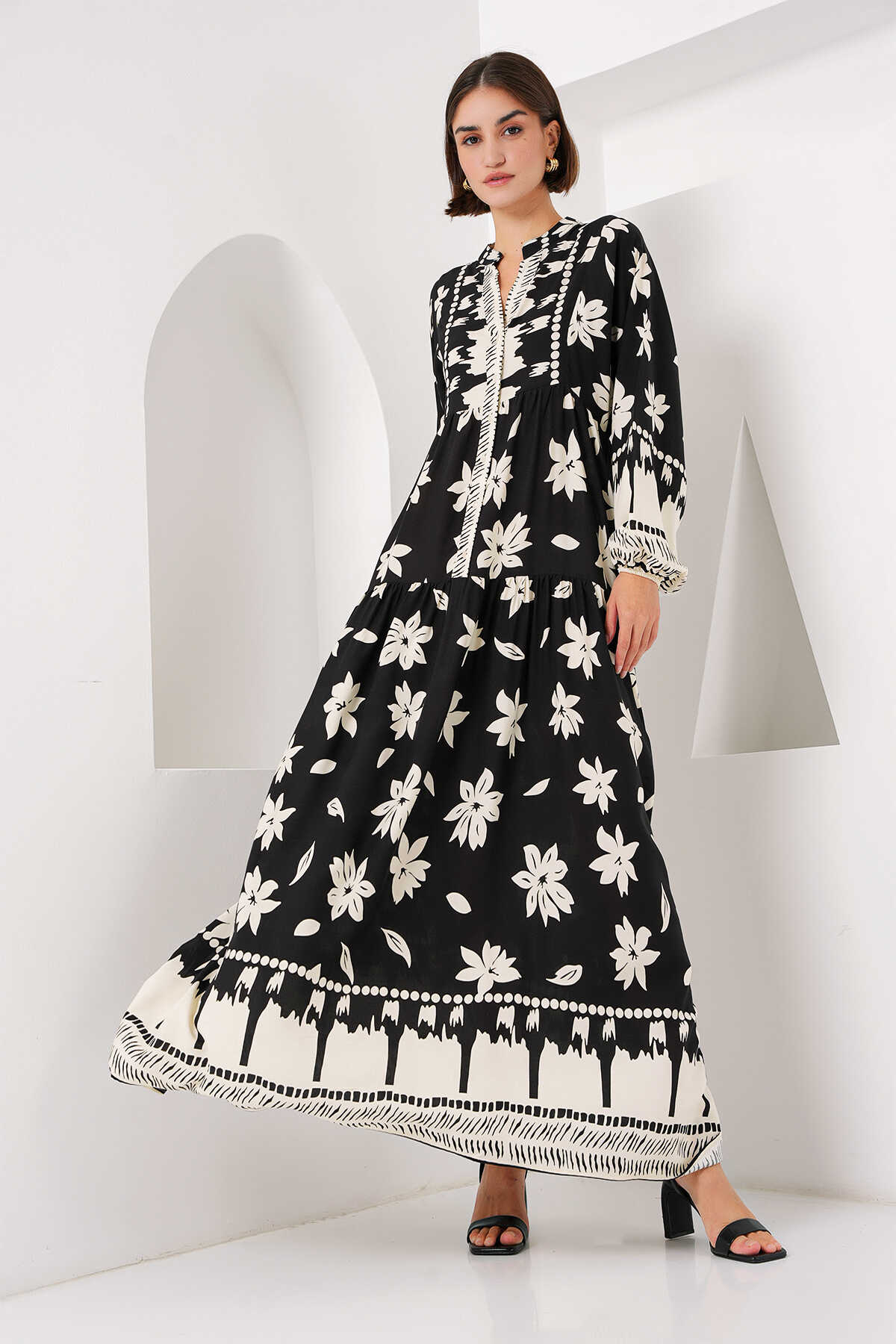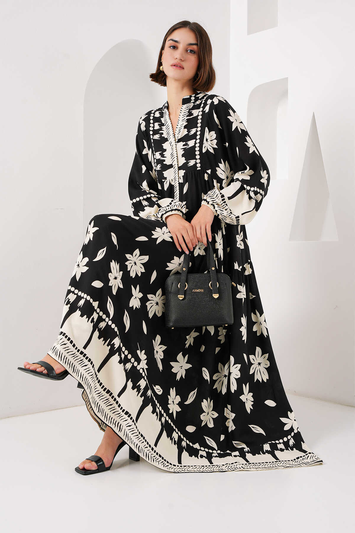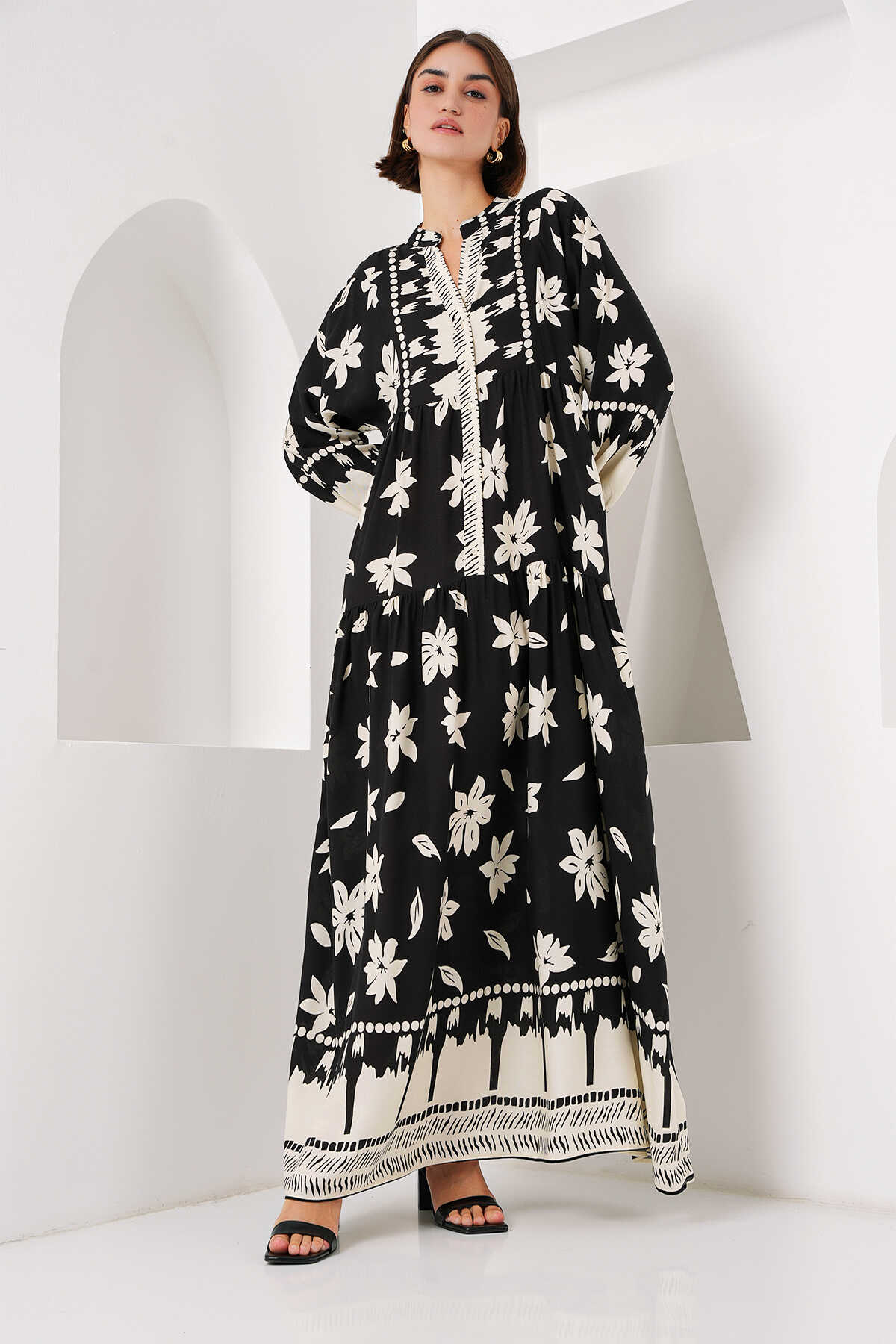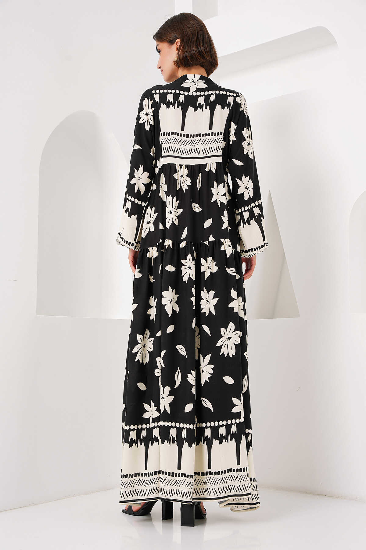 2423 Otantik Desenli Tesettür Elbise - Siyah2 - Kombin