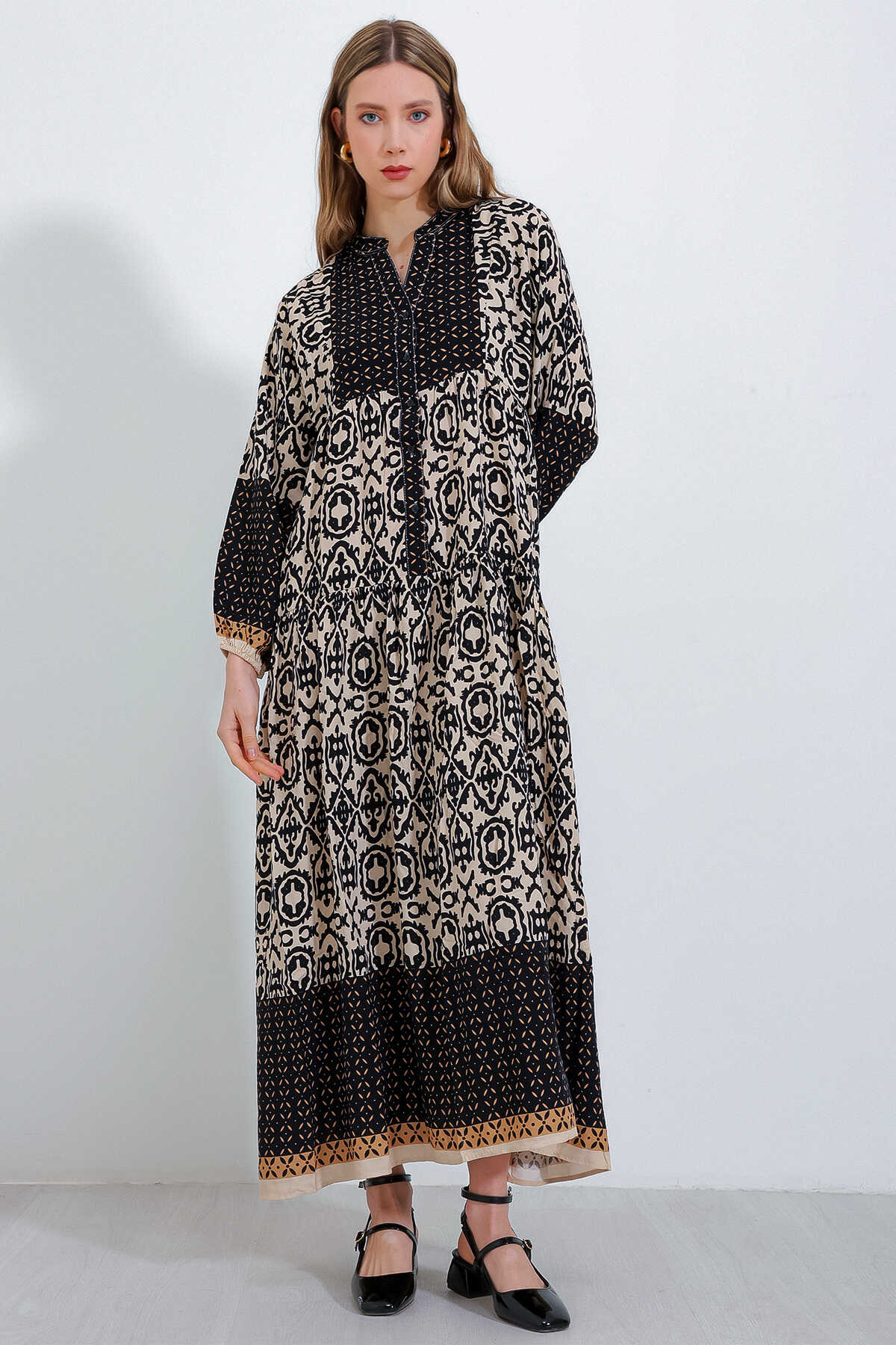 2423 Otantik Desenli Tesettür Elbise - Siyah4 - Kombin
