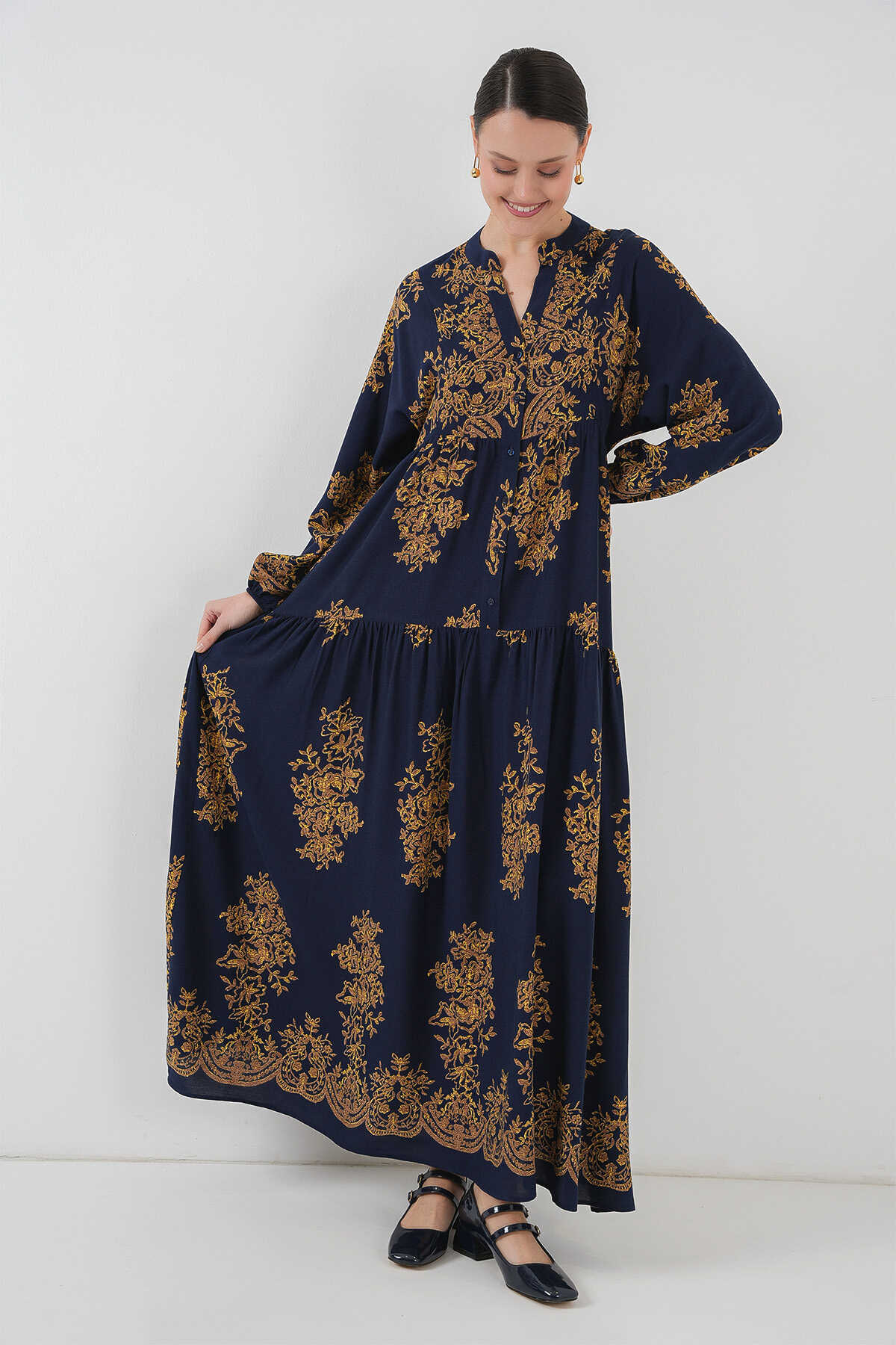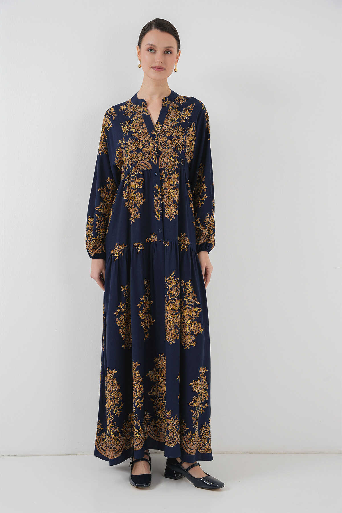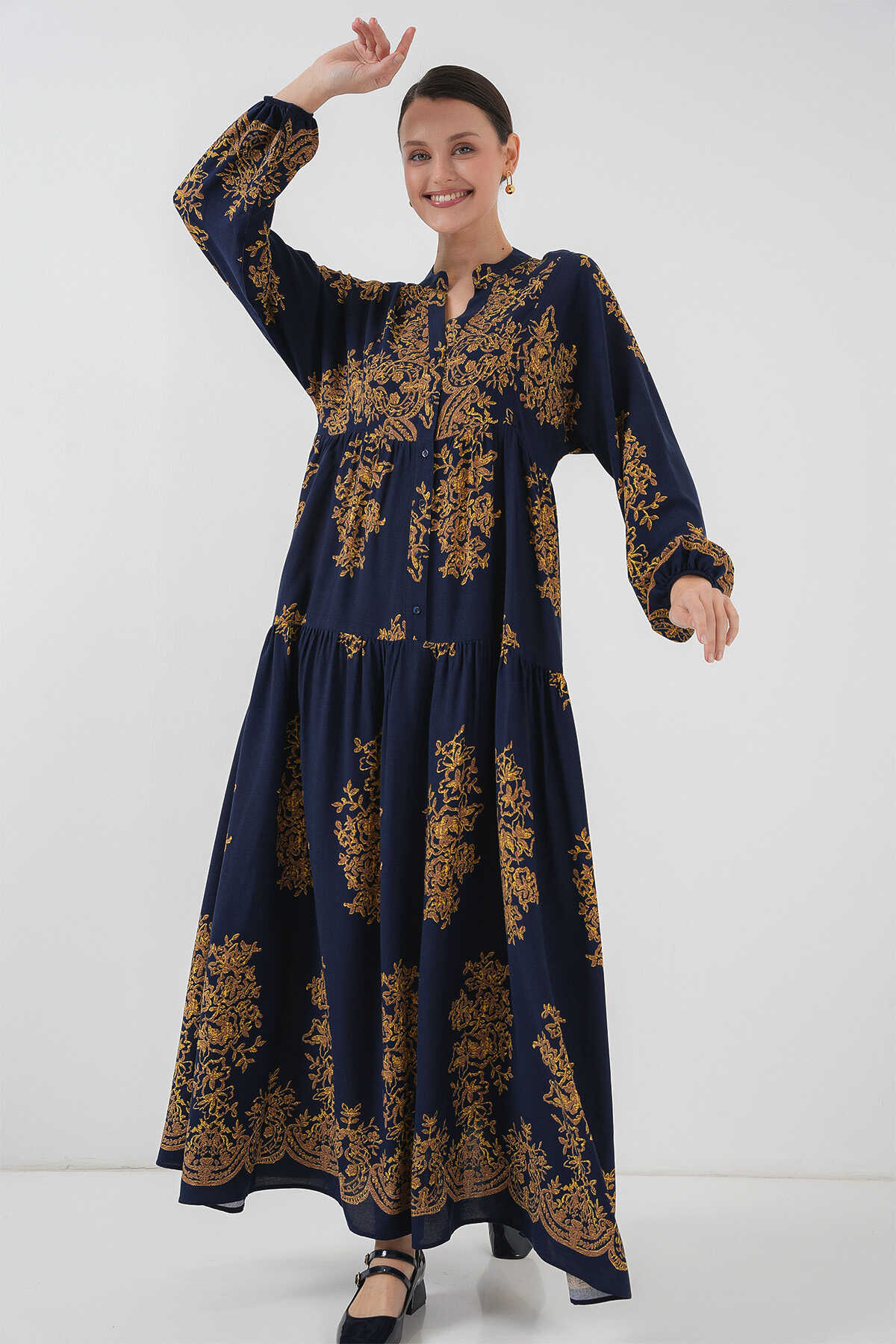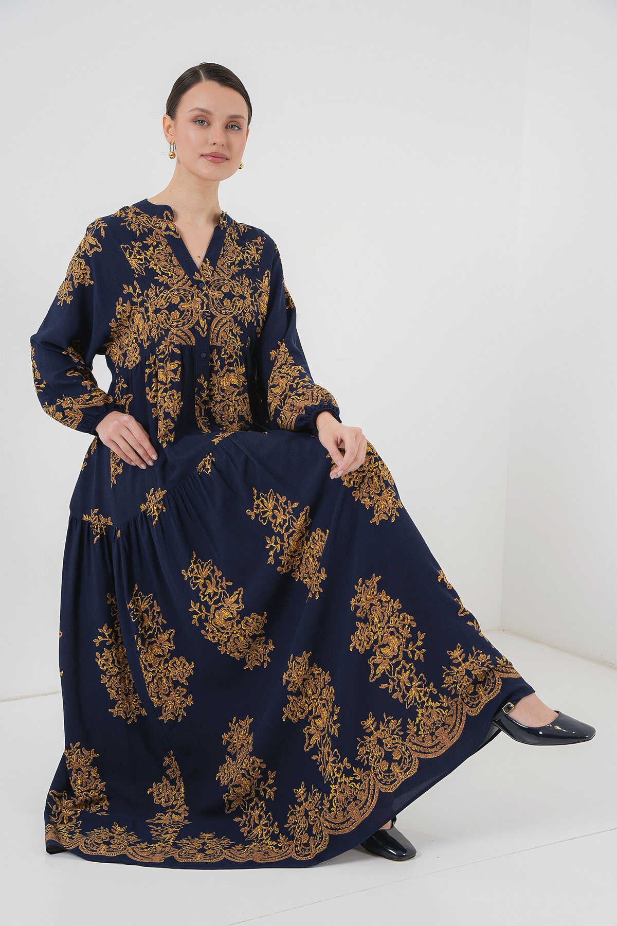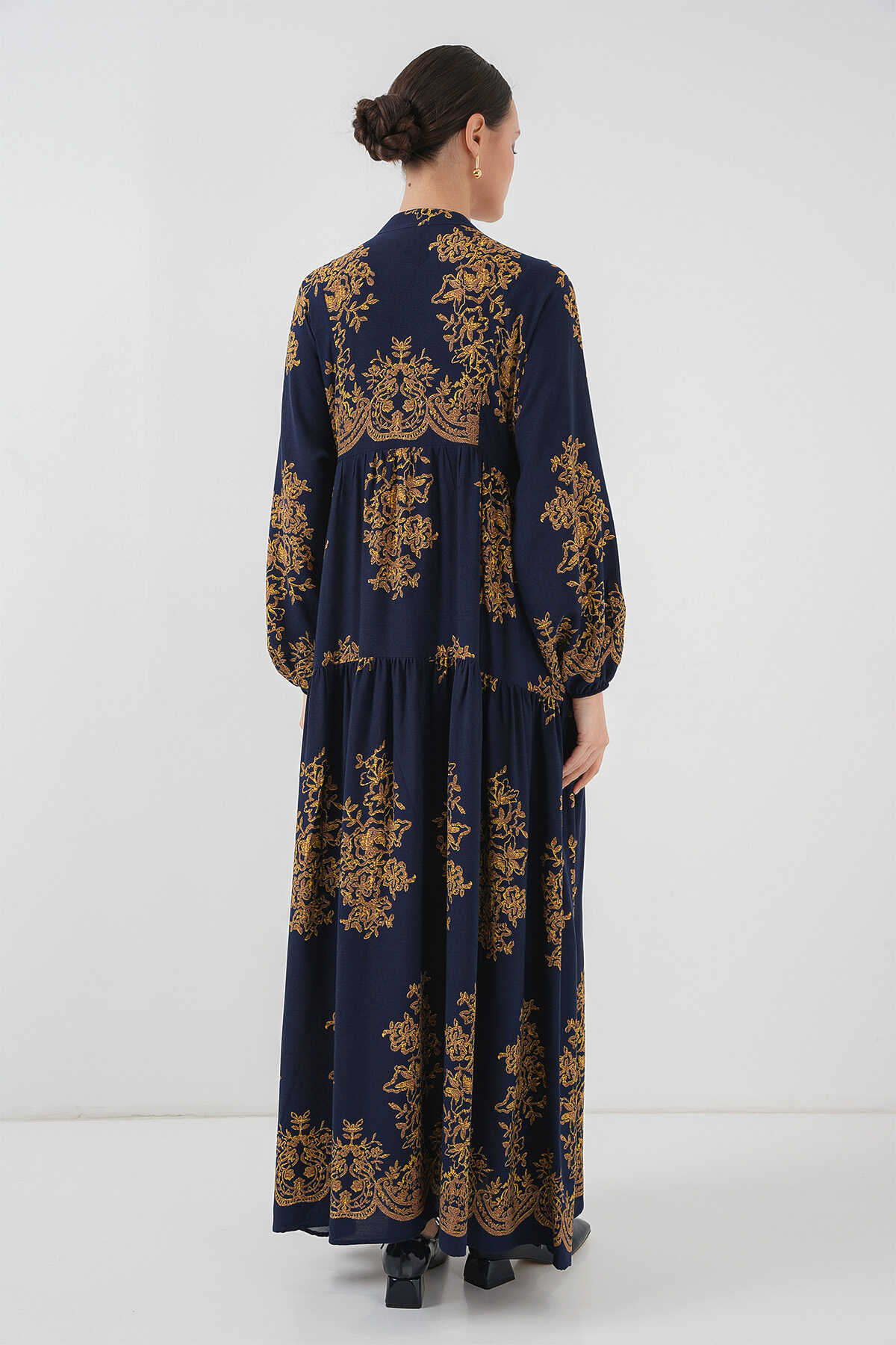 Lacivert Gold Desenli Tesettür Elbise 2423