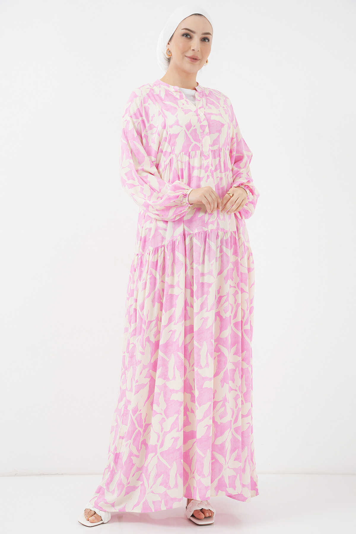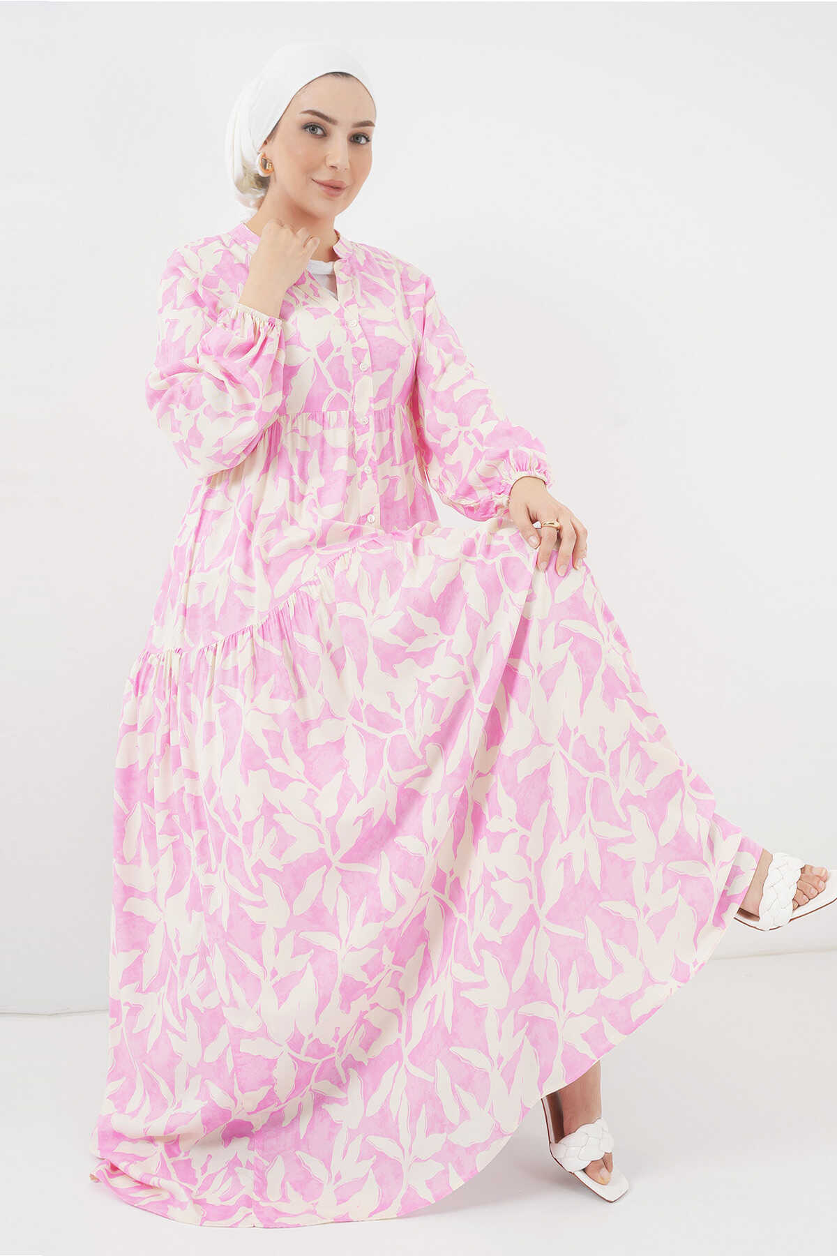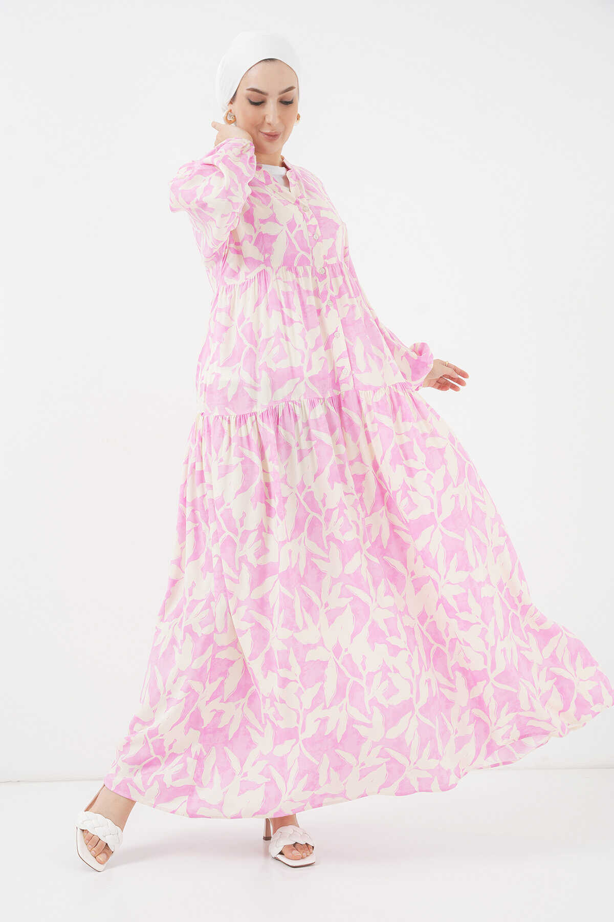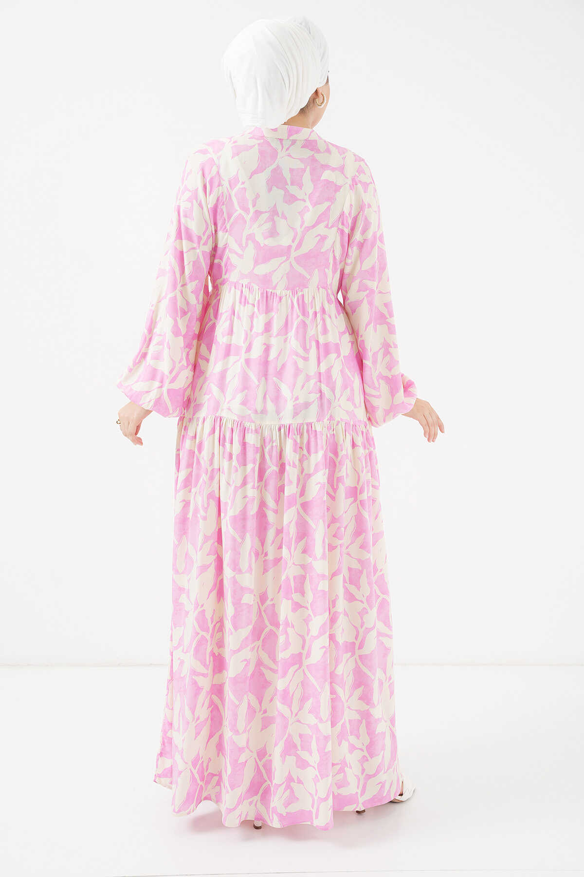 2423 Otantik Desenli Tesettür Elbise - Y.Pembe