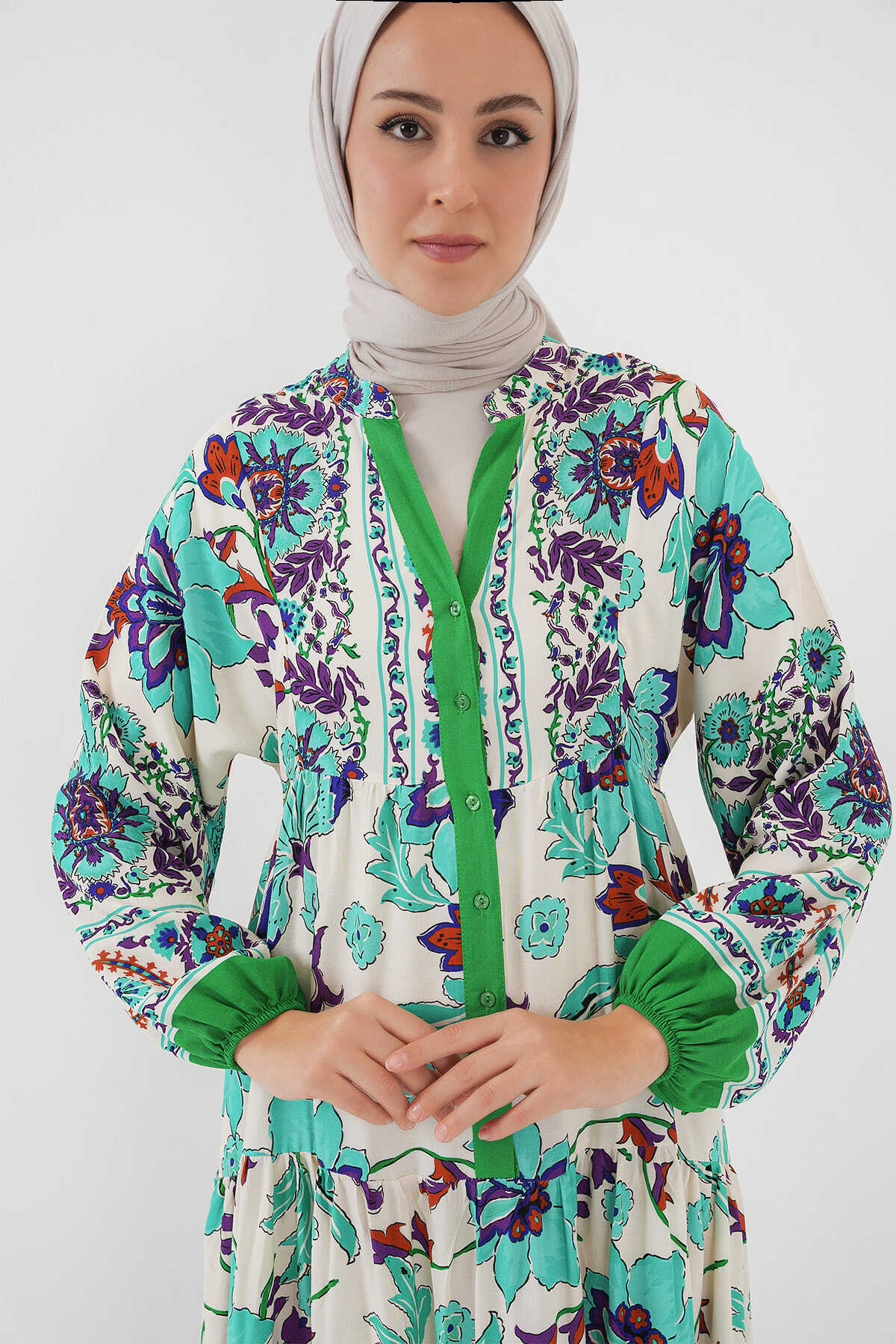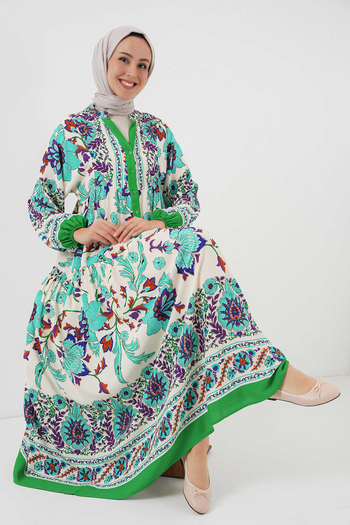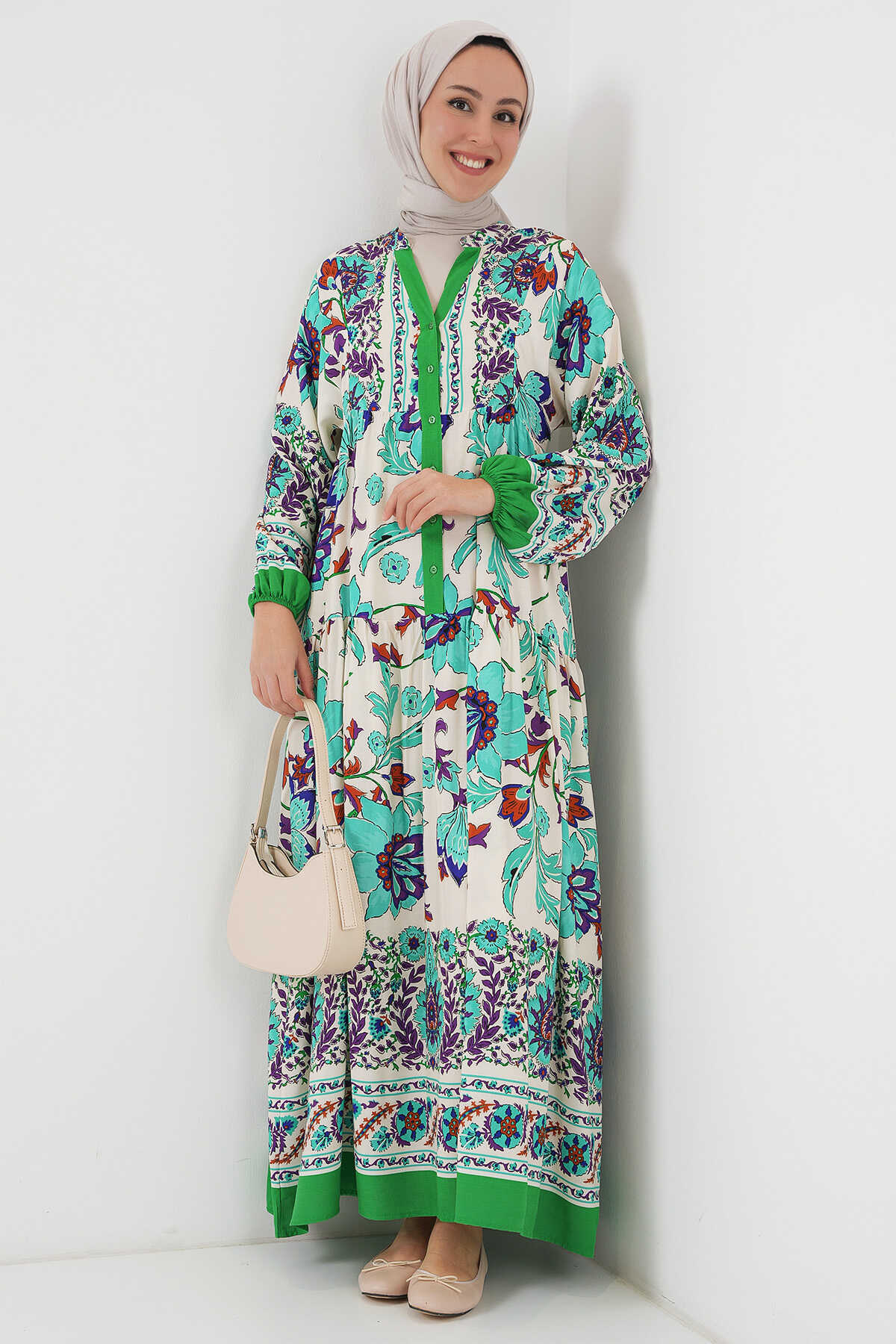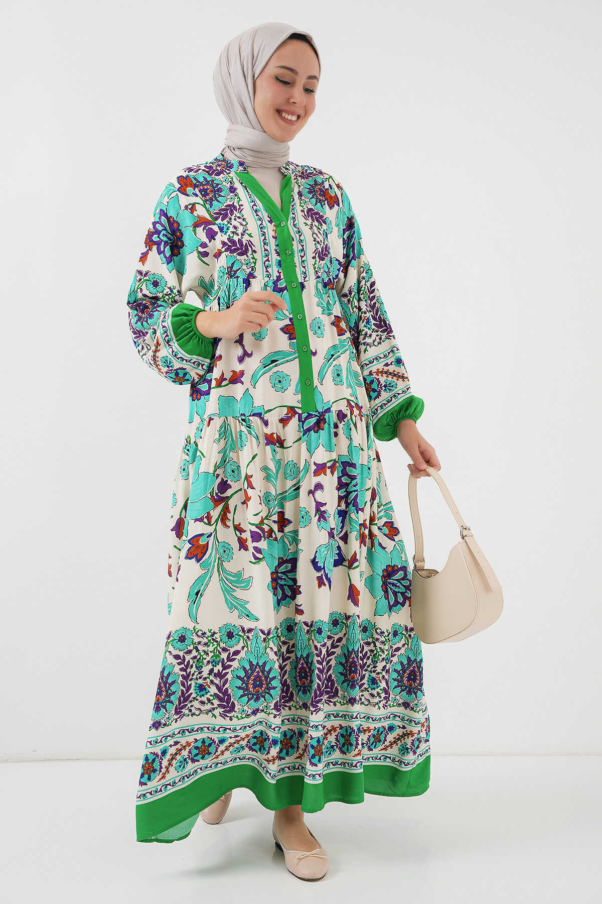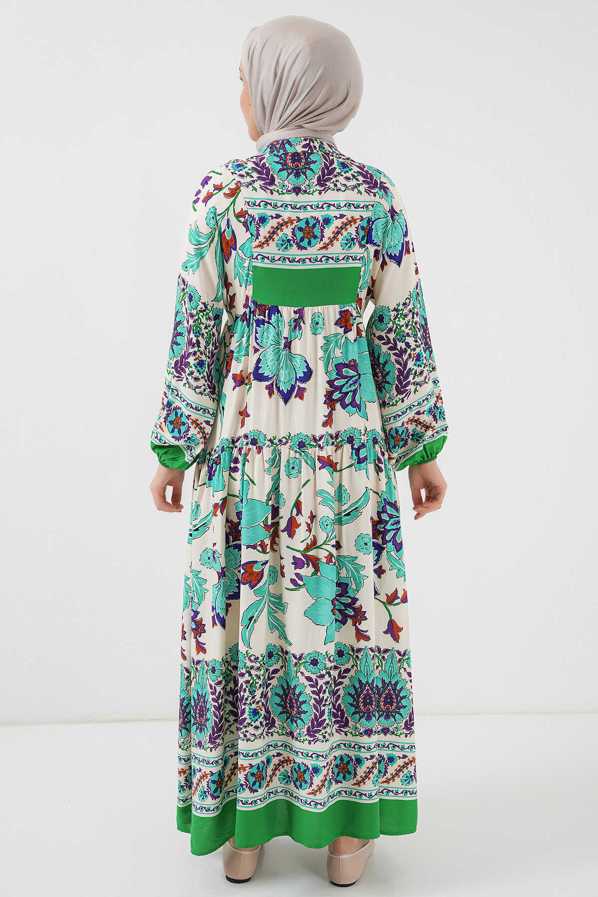 2423 Otantik Desenli Tesettür Elbise - Yeşil 1 - Kombin