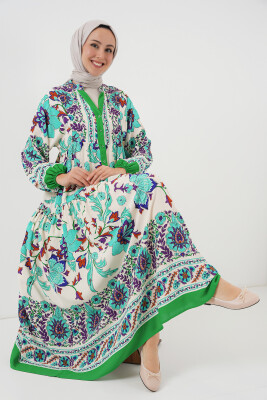 2423 Otantik Desenli Tesettür Elbise - Yeşil 1