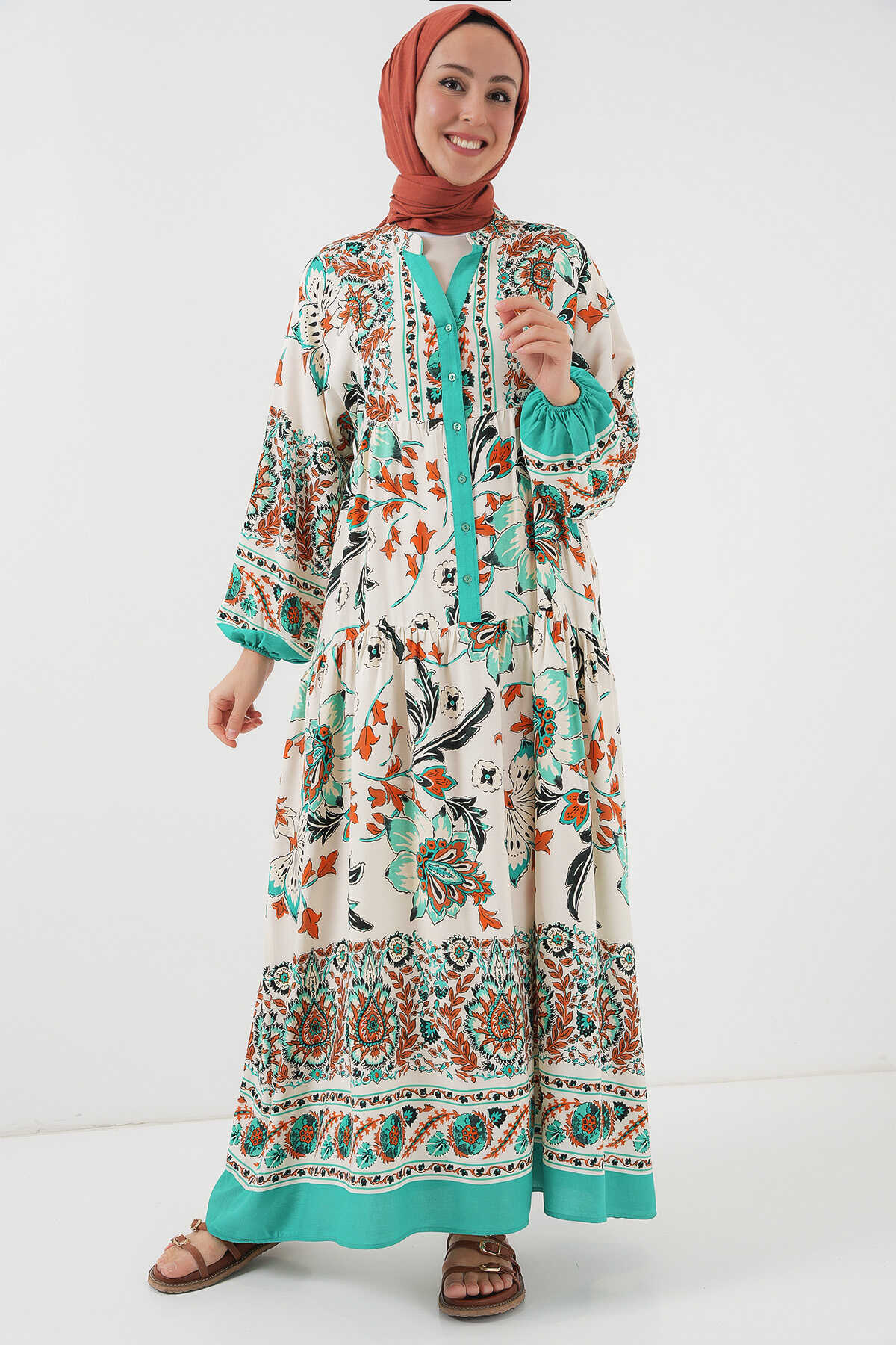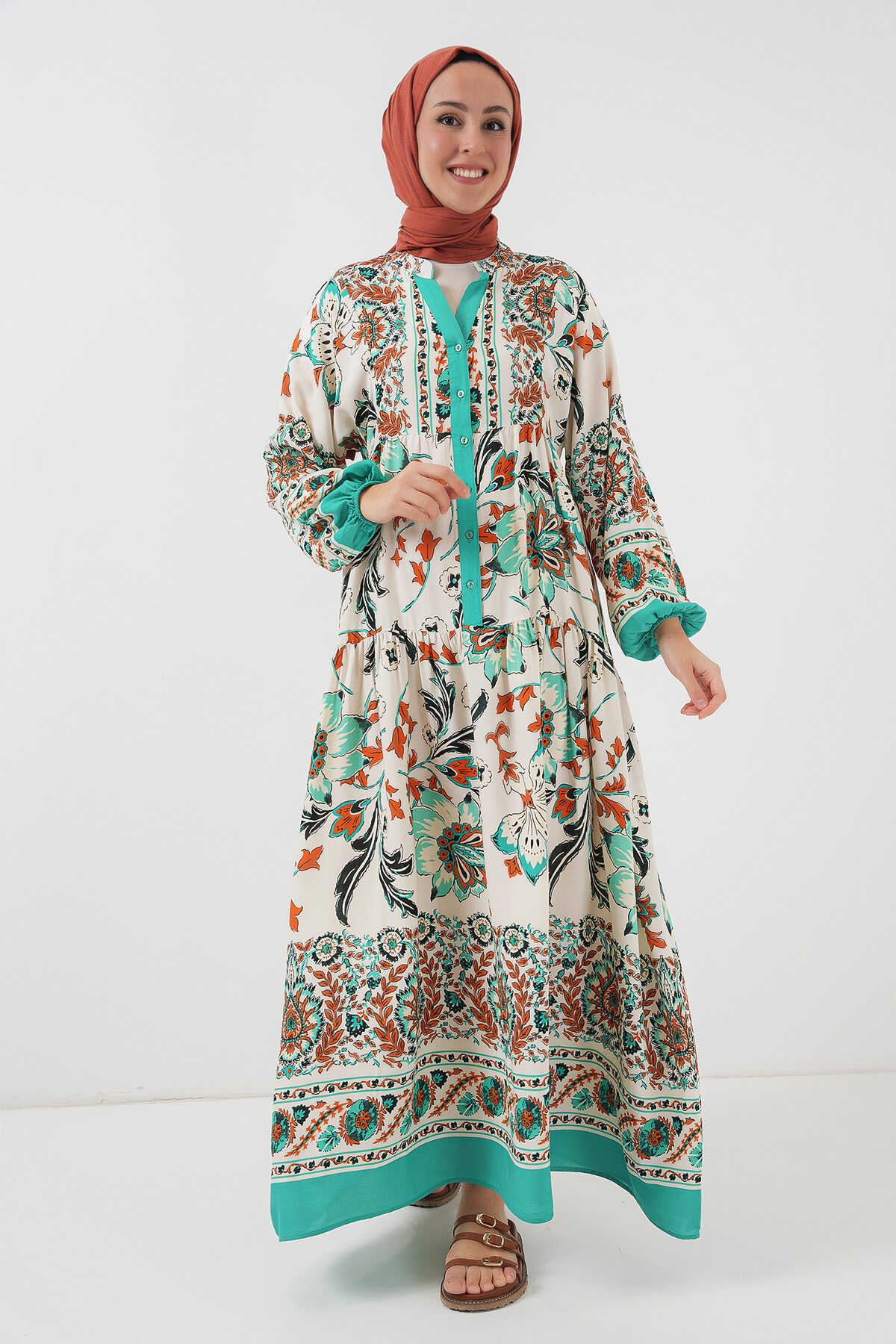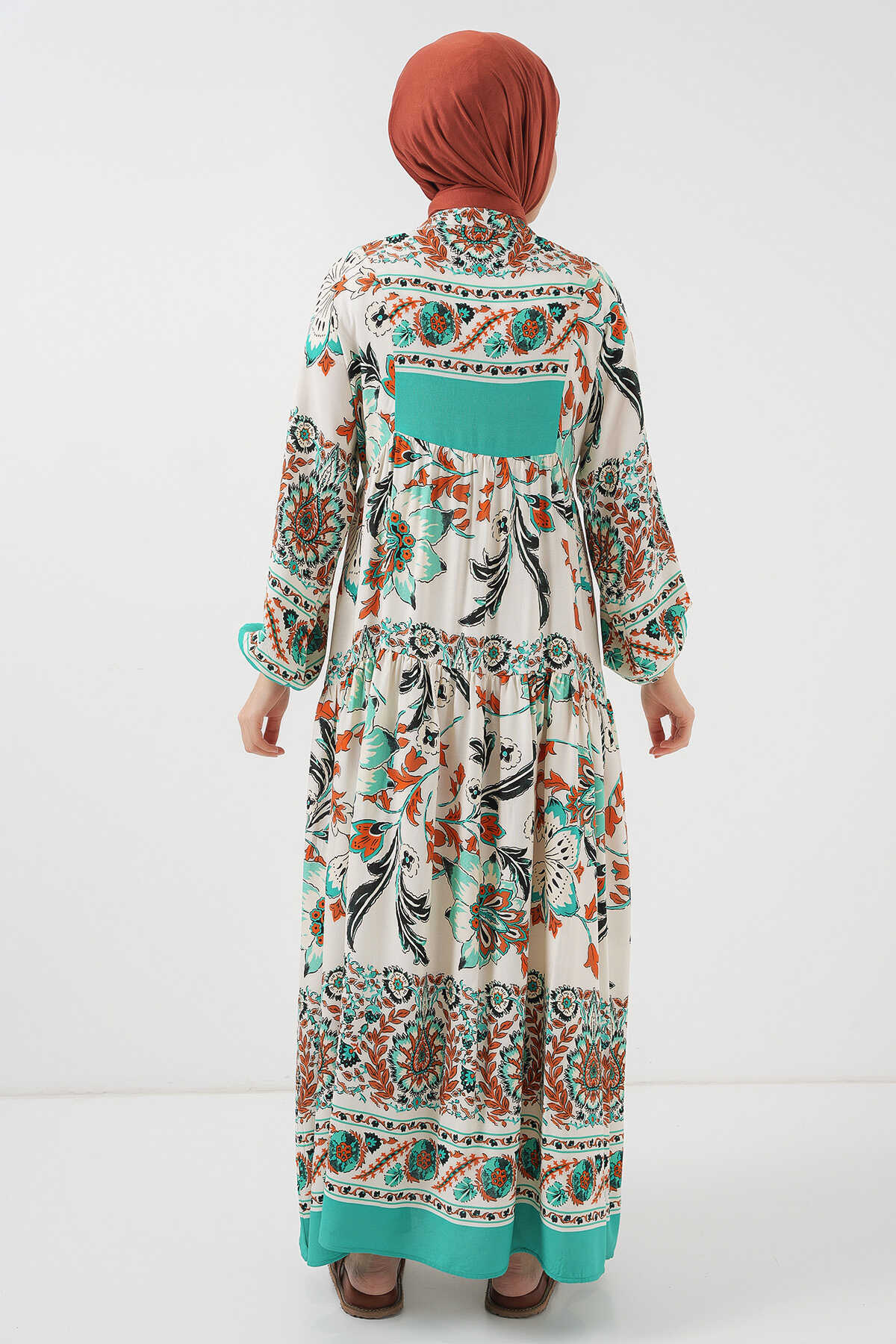 2423 Otantik Desenli Tesettür Elbise - Yeşil 2