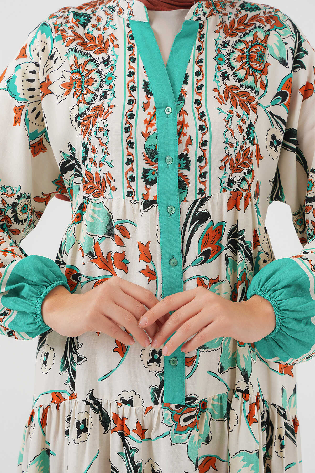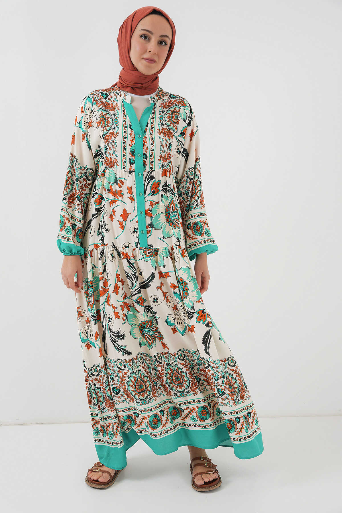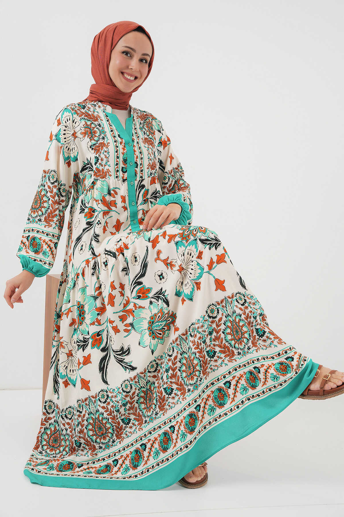 2423 Otantik Desenli Tesettür Elbise - Yeşil 2