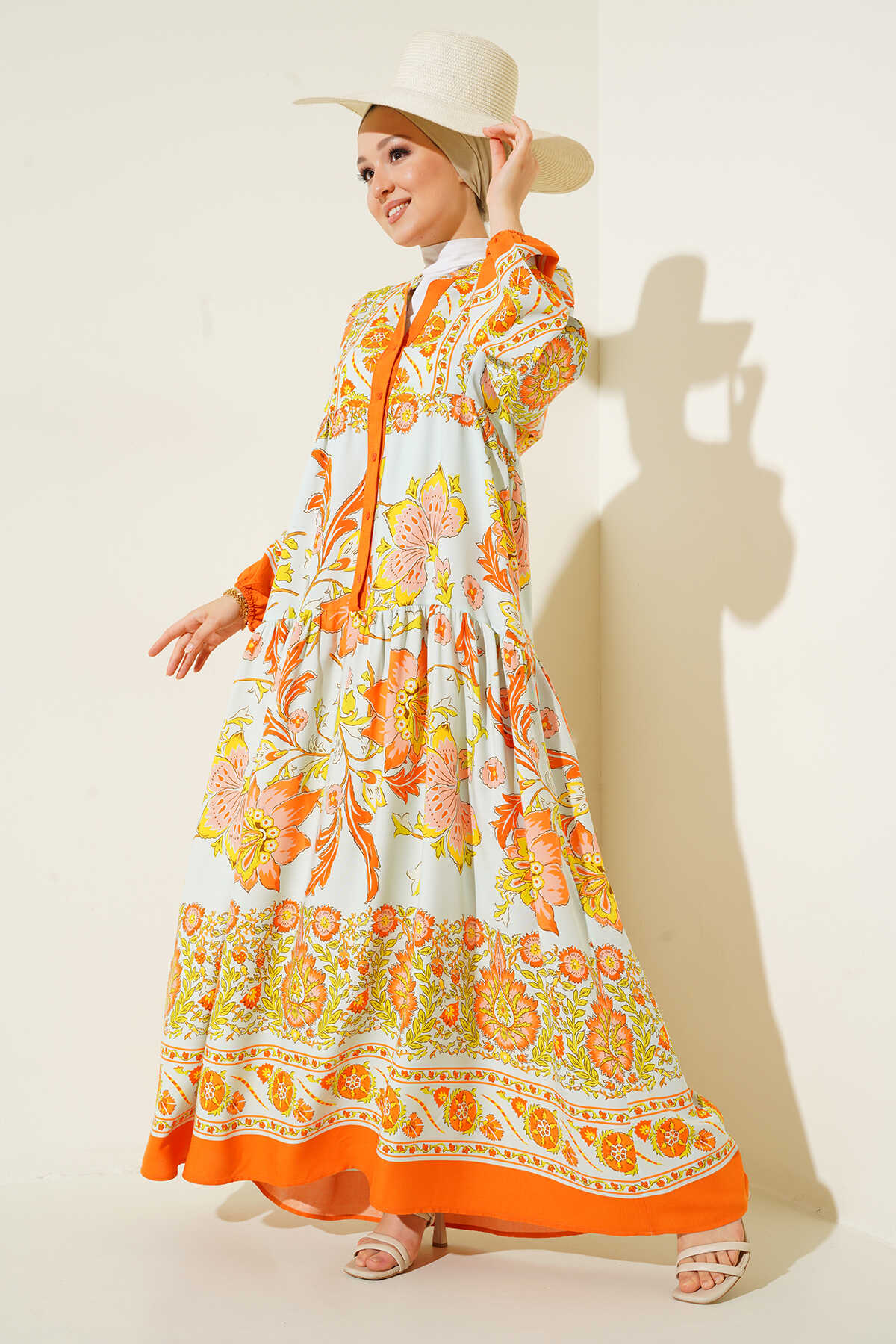 2423 Otantik Desenli Tesettür Elbise - Y.Turuncu - Kombin