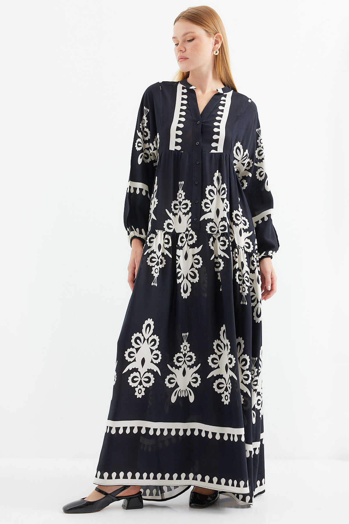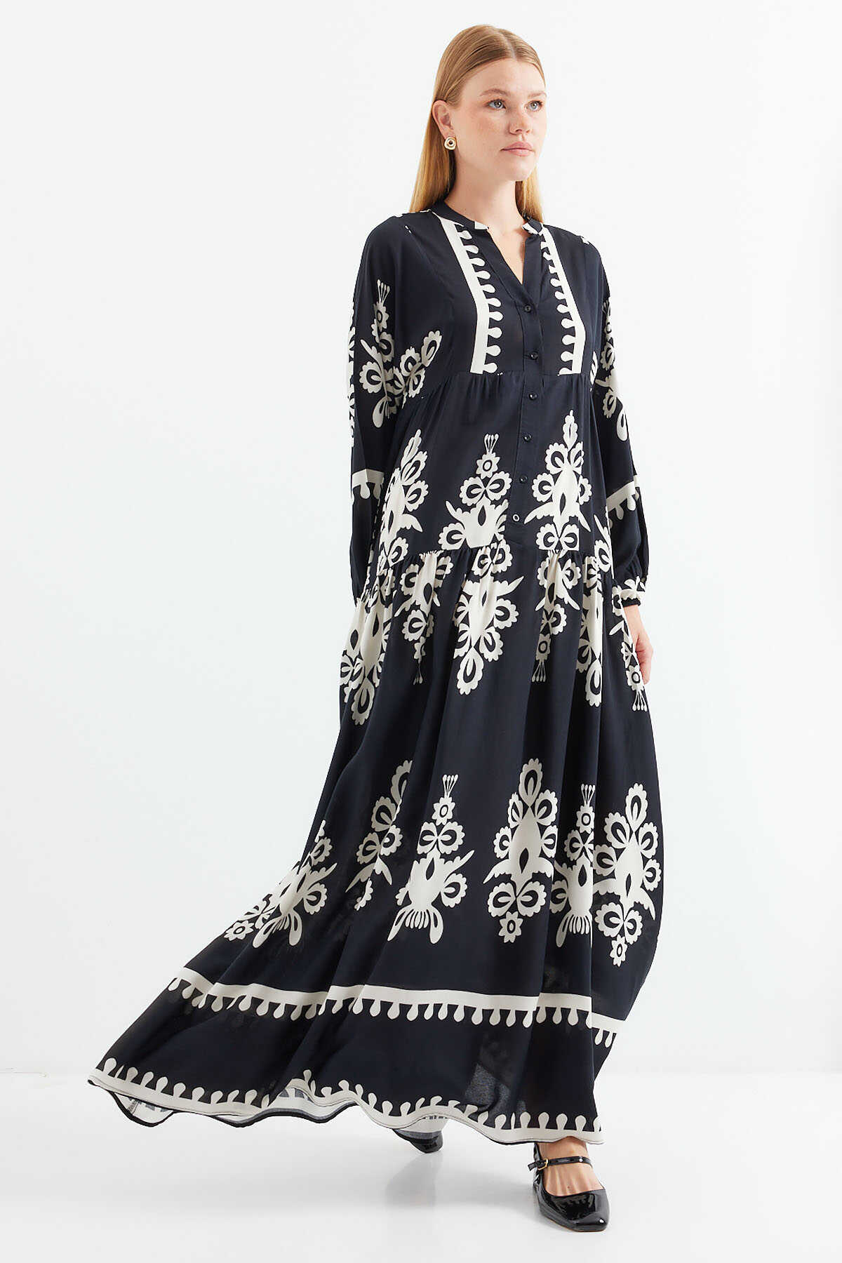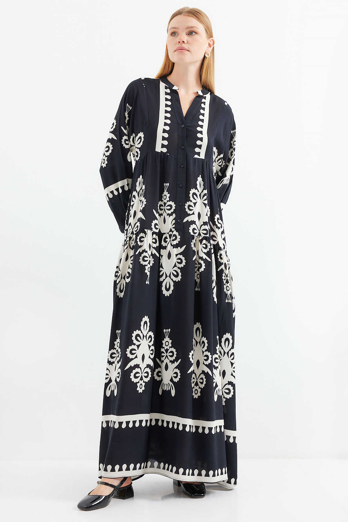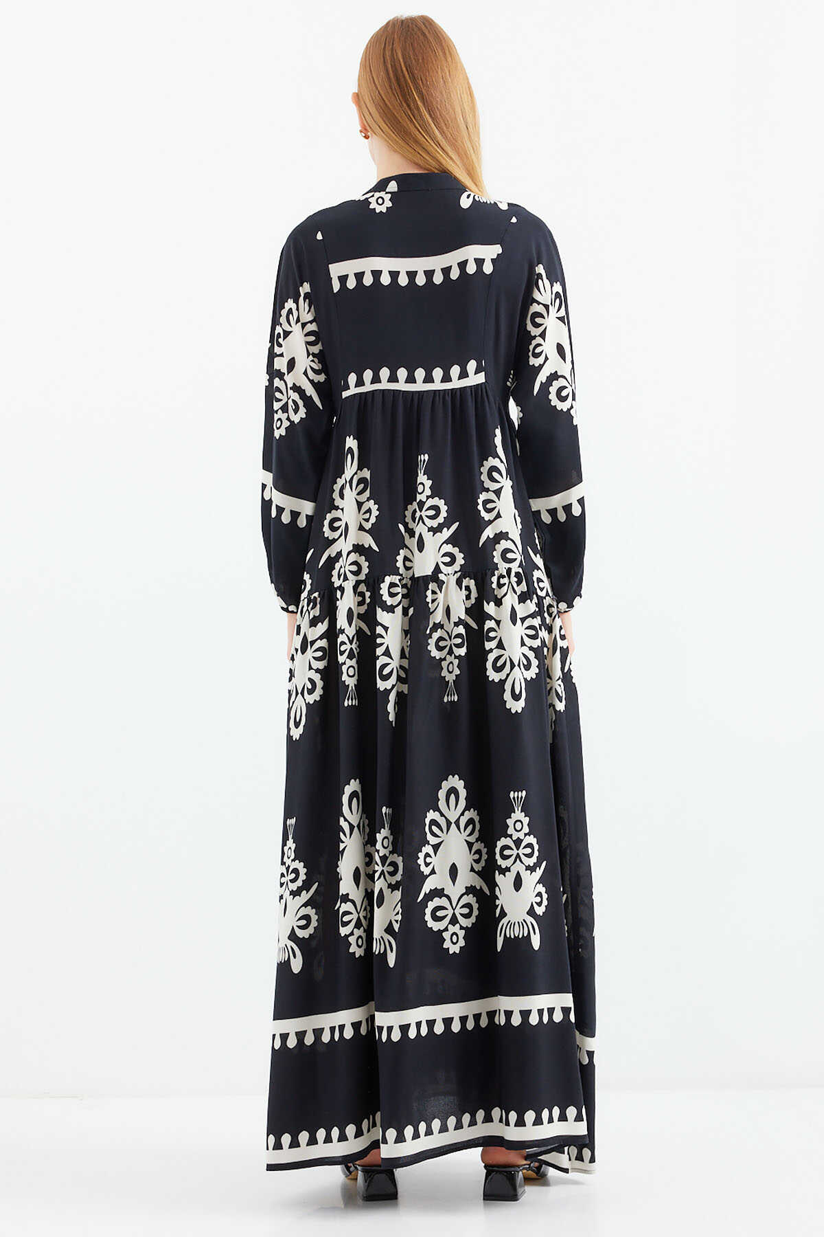 2423 Otantik Desenli Tesettür Elbise - Z.Siyah - Kombin